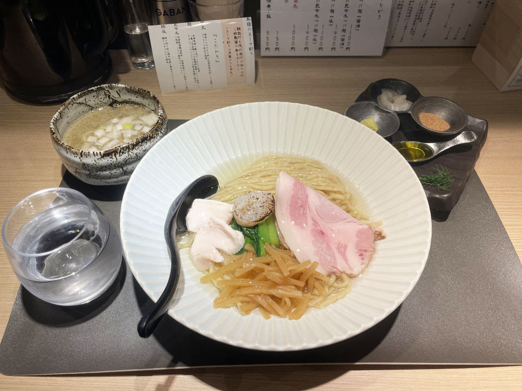 秘密のヴェールを纏った目視で確認できぬトゥルントゥルン麺。それを完璧に生かす昆布水。その世界の基礎となっている帆立の存在。この「帆立の昆布水つけ麺 白(塩)」の中で完璧ともいえる生態系が完成している。