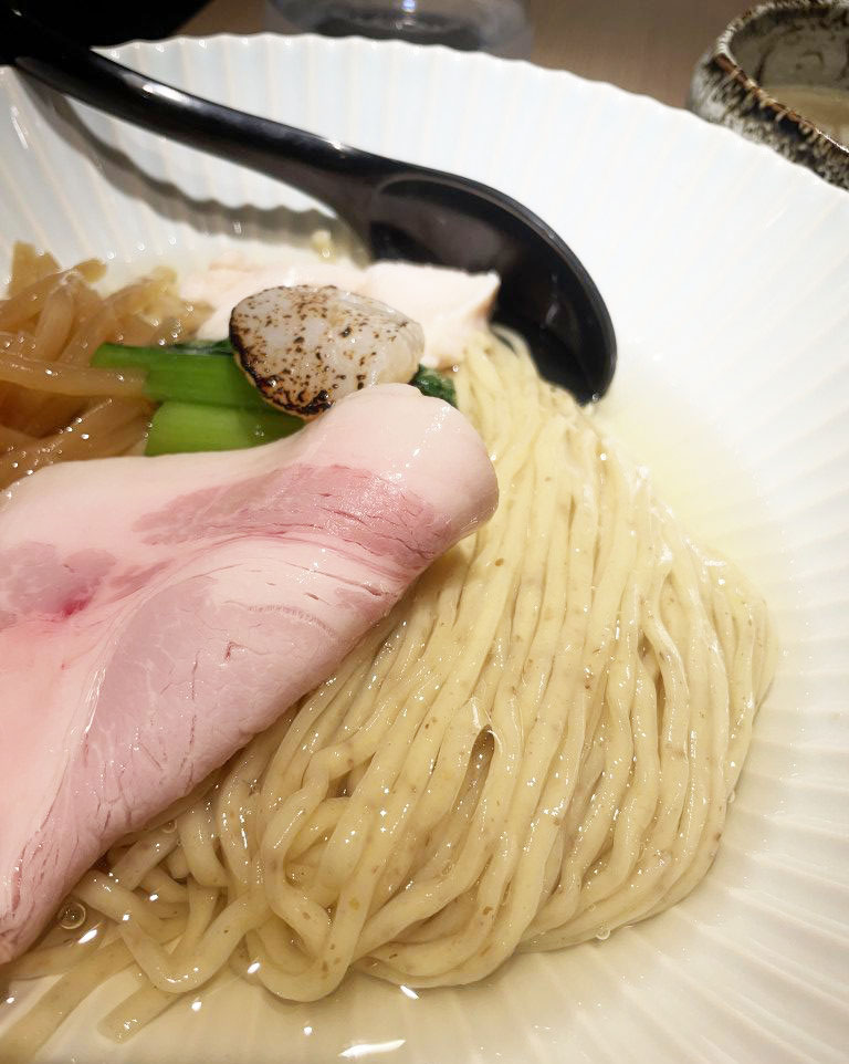 「極めて不思議な麺の食感」に驚かされ、昆布水に浸してテイストに感動させられた。これ、食感も、味も、唯一無二。仕上がりが良いだとか、独特だとか、個性的とか、そんなレベルの話じゃあない。違う世界から召喚した別次元の異世界麺、それこそ「Tokyo Style Noodle ほたて日和」の麺。そしてそれを昆布水という聖水に浸して味覚を潤す。