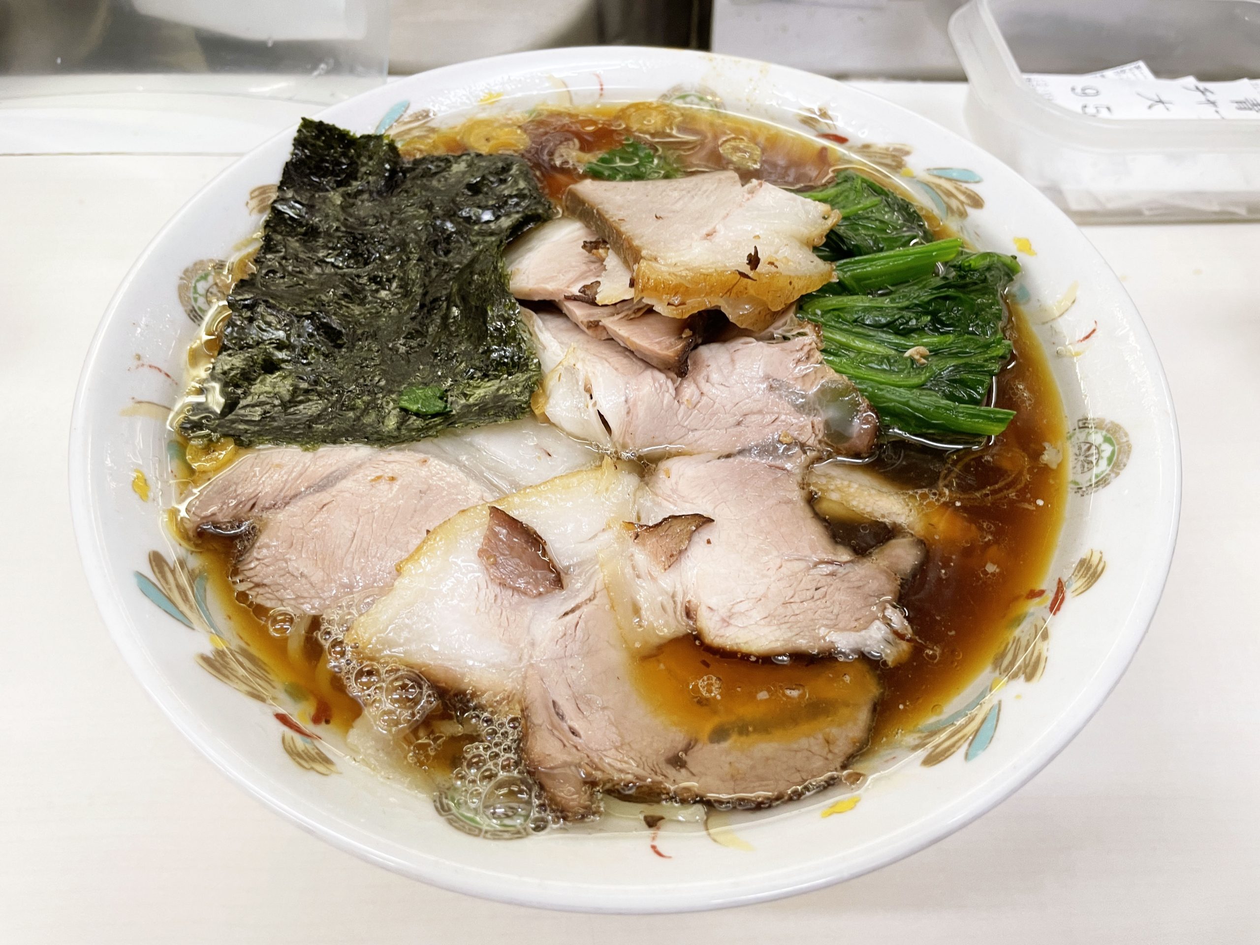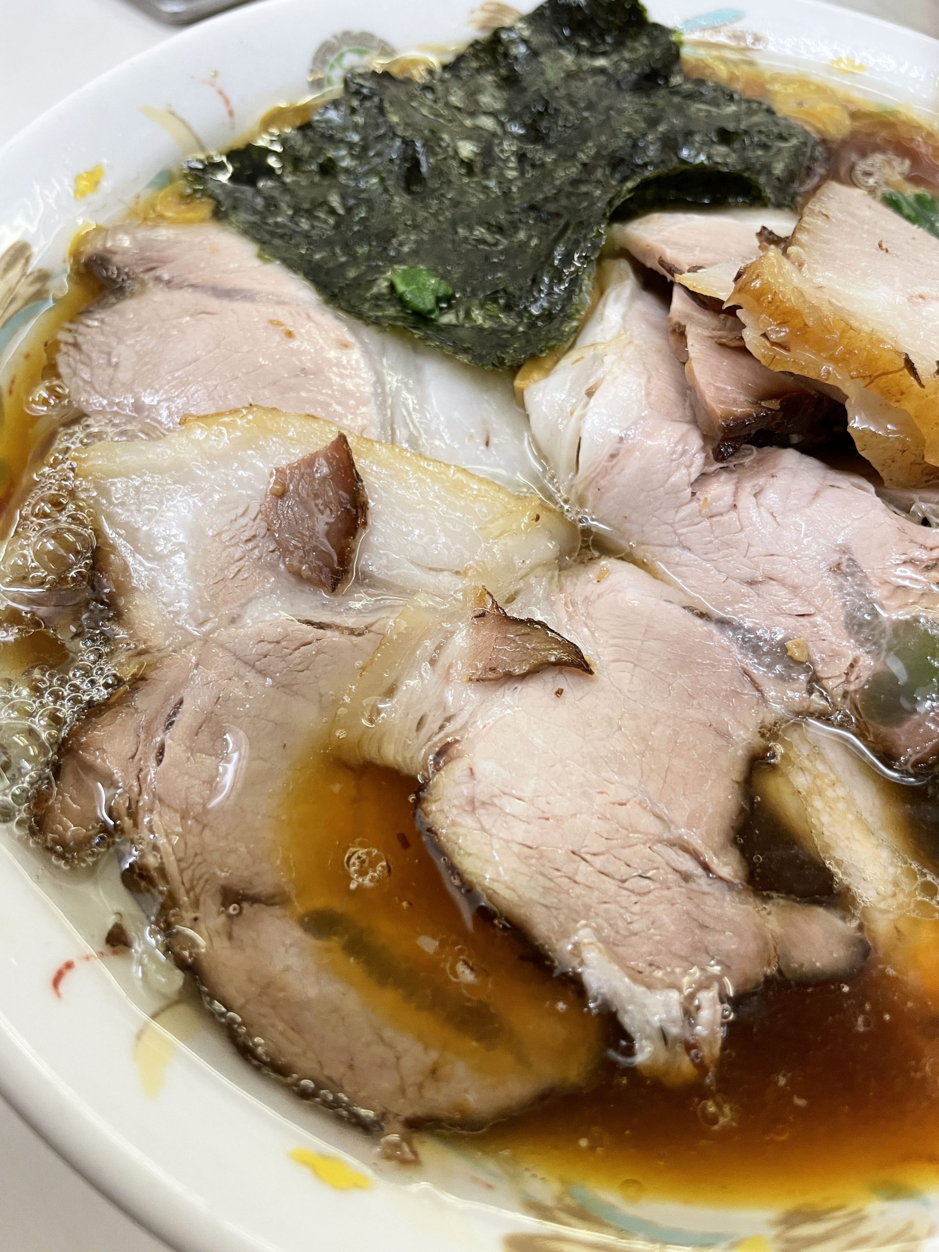 麺をすすりつつ、チャーシューも食べる。これ本格的な異国テイスト。台湾とか上海とか香港で食べるチャーシューのような、表面がザクッとした食感の仕上がり。うまい! 昔ながらの醤油ラーメンではあるが、実は、チューシュー、際立った個性。うまい。そして海苔で麺を巻いて食べる。これもまた、海苔の香ばしさをほのかに感じて絶品。いいなあ。なんだから幸せな気分になるラーメンだわぁ。