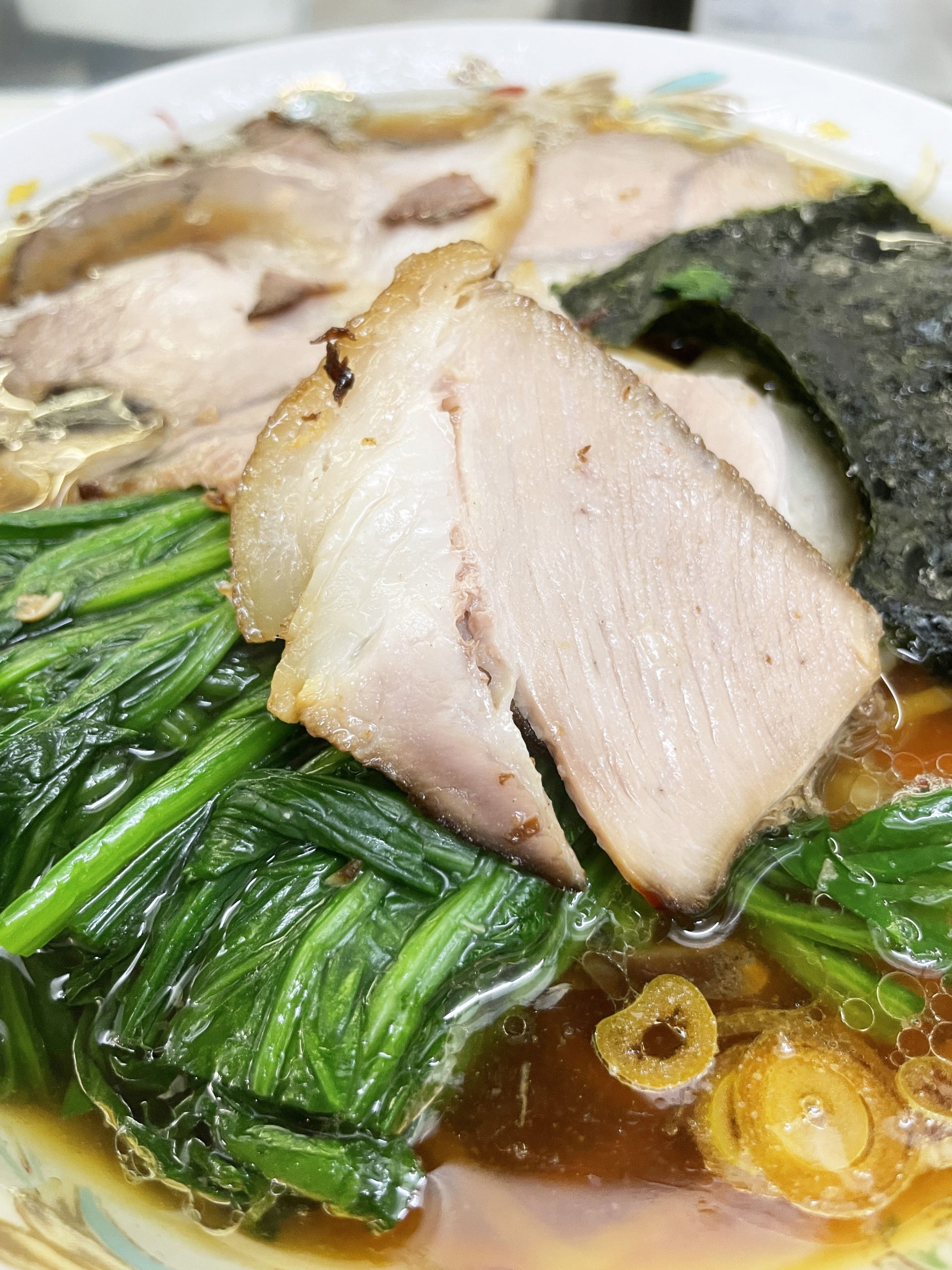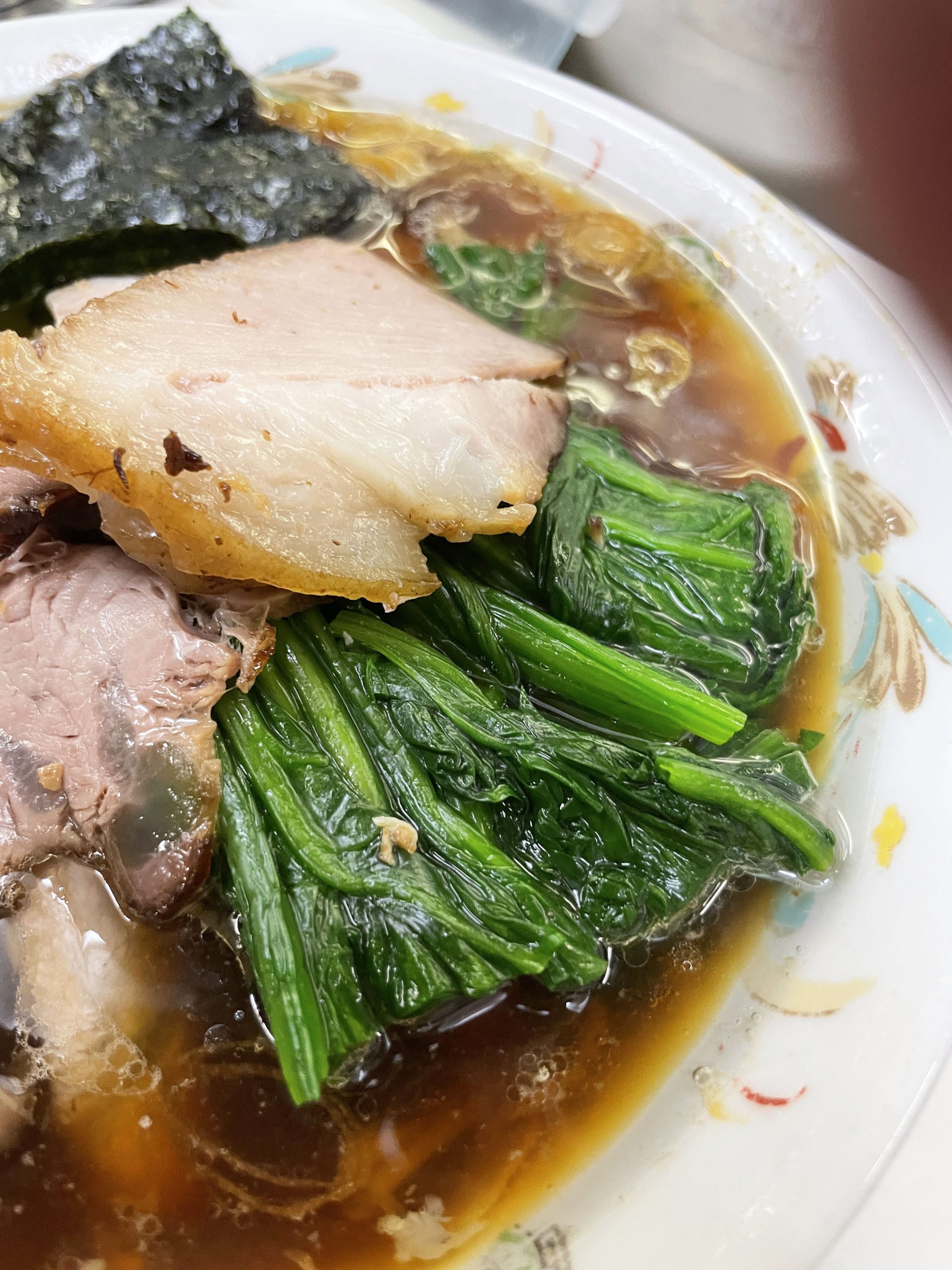 まずはチャーシューとほうれん草を箸でスープに沈ませ、たっぷりとスープを浸透させる。そしてジューシー状態のチャーシューとほうれん草を交互に食べる。うまい、これが、実にうまい。そしてズズッと麺をすする。うまい、うますぎる。