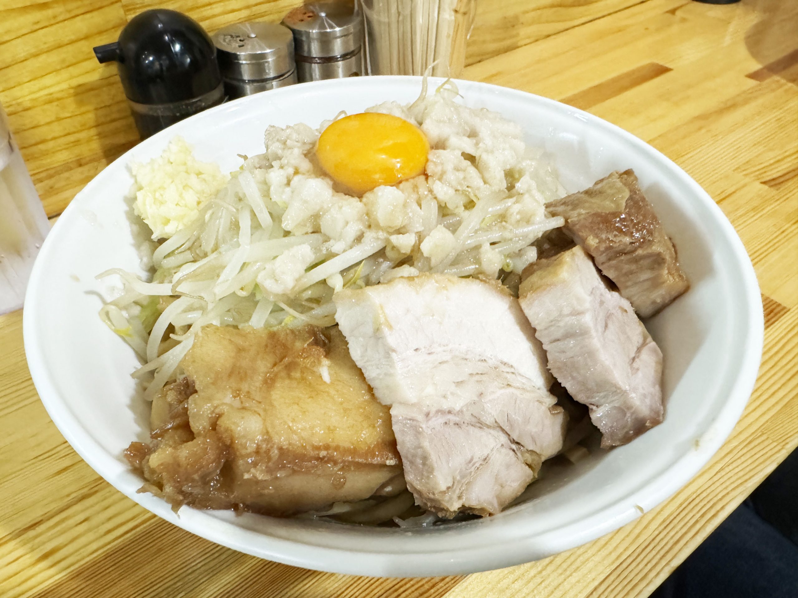 人気のお店なので、順番待ちが発生していることが多々ある。じっくりと待って、席に案内されたら着席。そして、まぜめんがやってくるのを待つ。今回は肉増しにしたので肉が多い。ウホッ♪ いい感じのブロック感!