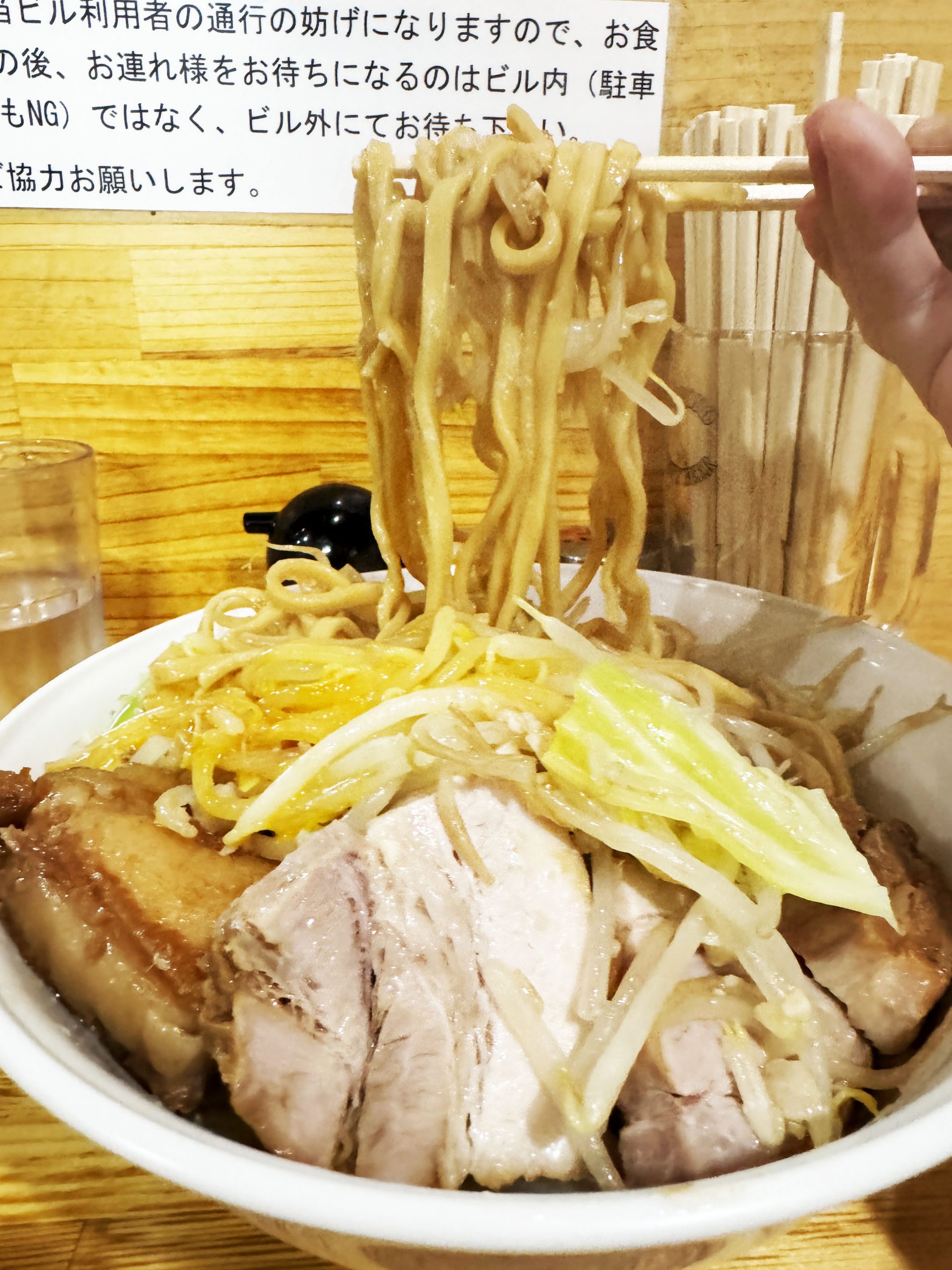 さっそく麺をサルベージしてみると、かなり粘度が高めのスープがガッツリと麺を包み込み、ツヤツヤになっていた。それを豪快にズズッとすする。マ、マ、マジか! 心地よいツルツルとした感触とともに、パワフルな旨味と塩気がガツンとくる! マジでイイこれ!! その遠慮なき力強さ、まさに家系!!