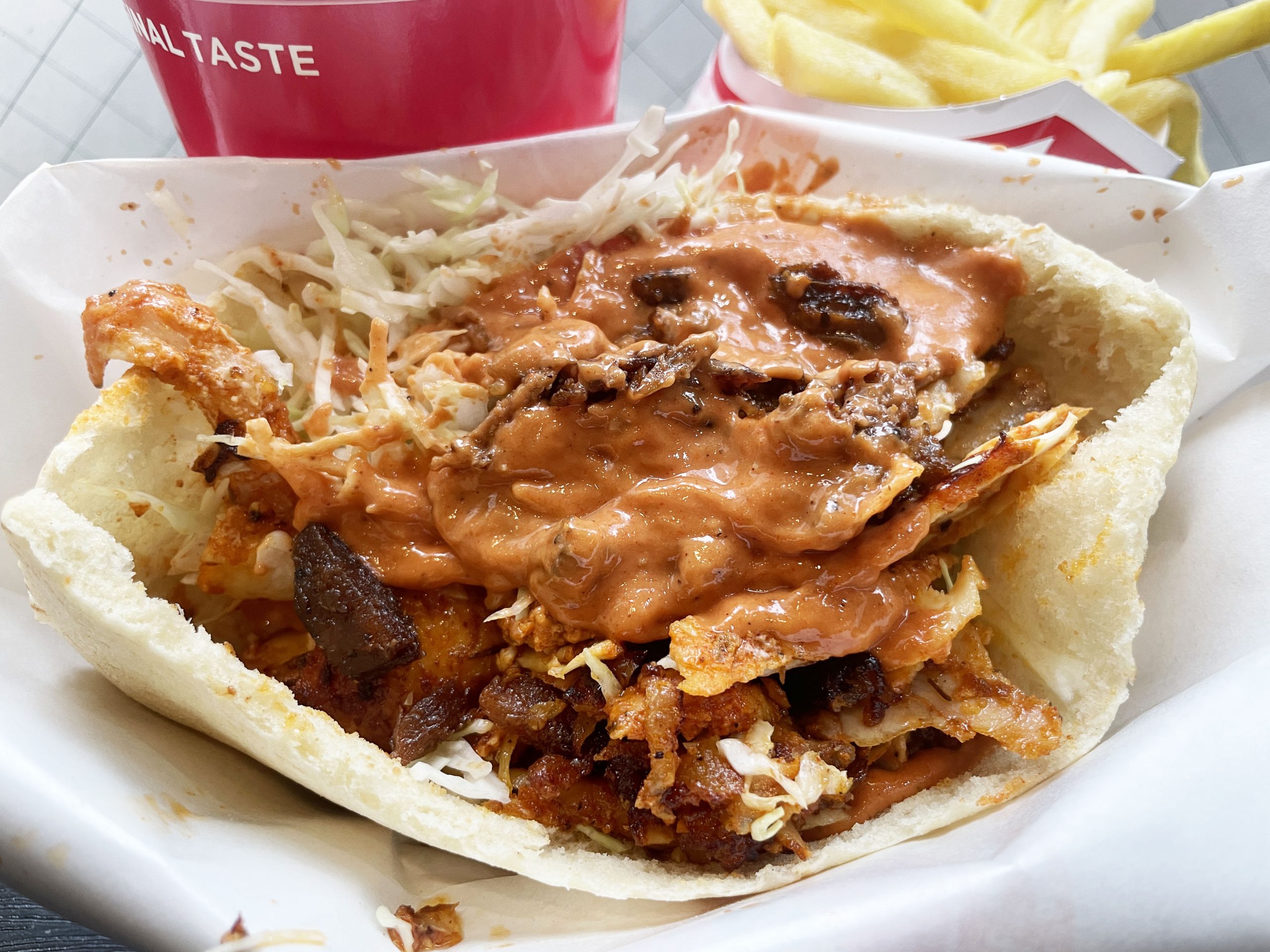 筆者のオススメは「ビッグケバブ+チキンビーフミックス・オリジナルソース+大盛り」だ。ただでさえビッグなケバブをさらにビッグに。ソースはマイルドテイストなオリジナルソースがオススメ。肉が多いほどオリジナルソースがマッチする。飽きずに、いつまでも優しくまろやかなテイストを楽しめるからだ。