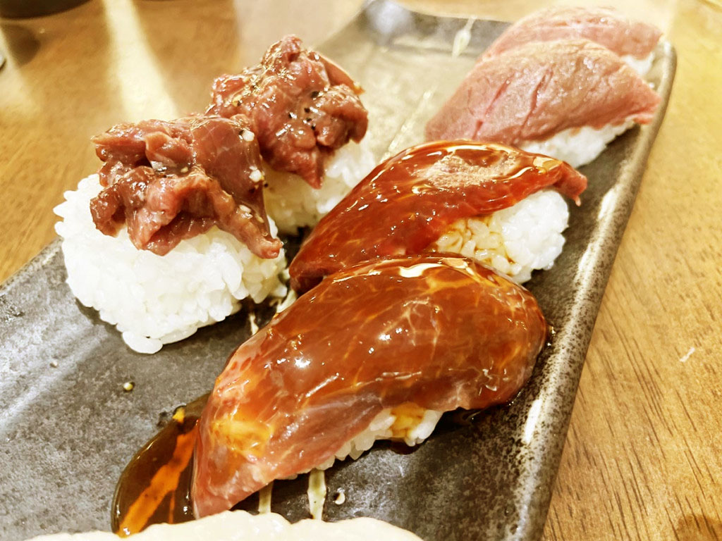 激安価格で上質な肉寿司が食べられるだけでなく、一品料理にも定評がある店舗だ。なにより感動したのは、どの肉寿司も、しっかり美味だったこと。臭みナシ、旨味たっぷり、チープな肉は皆無、どれを食べても美味。上質な肉寿司を堪能できる幸せ。たまらない。