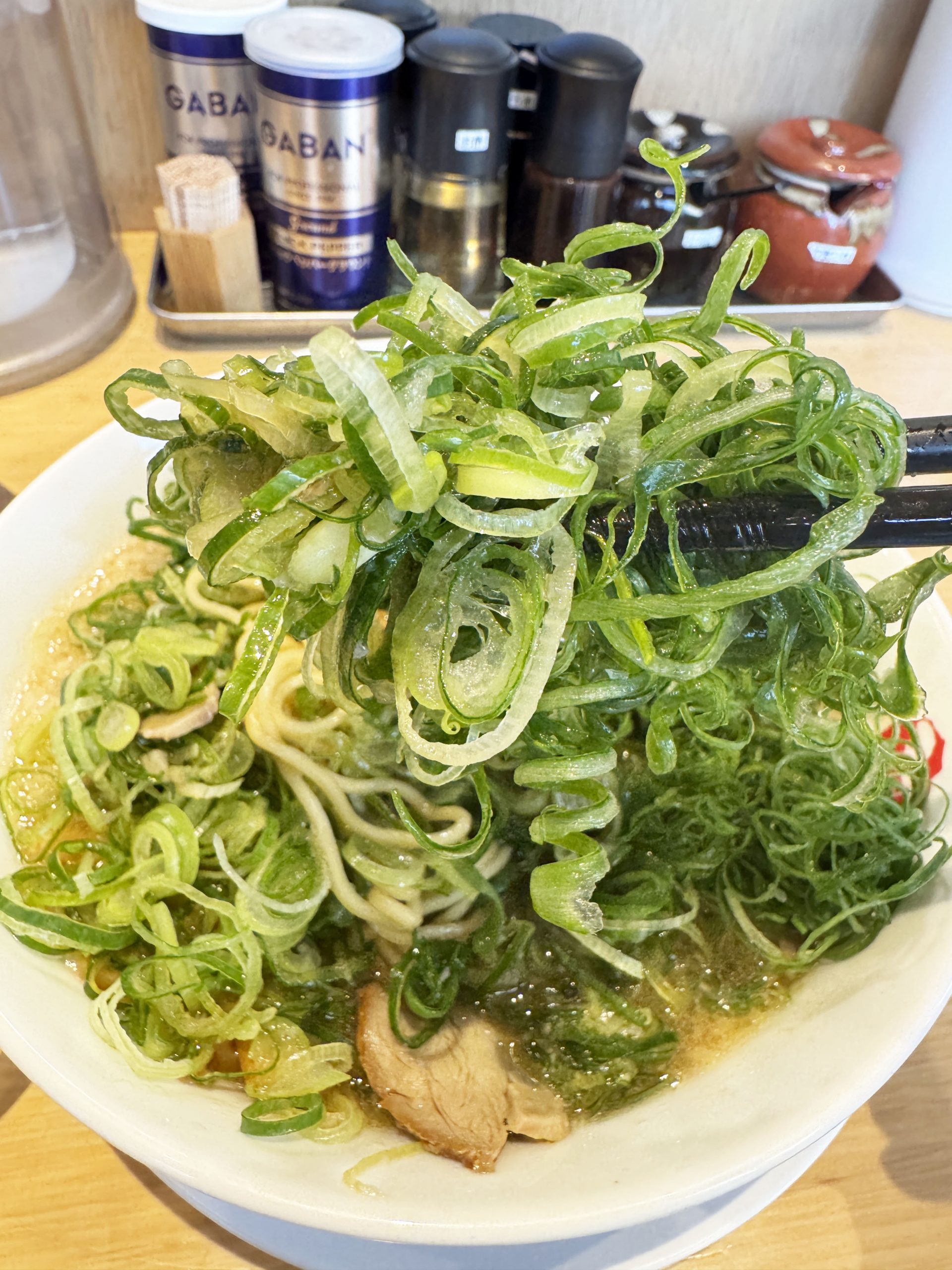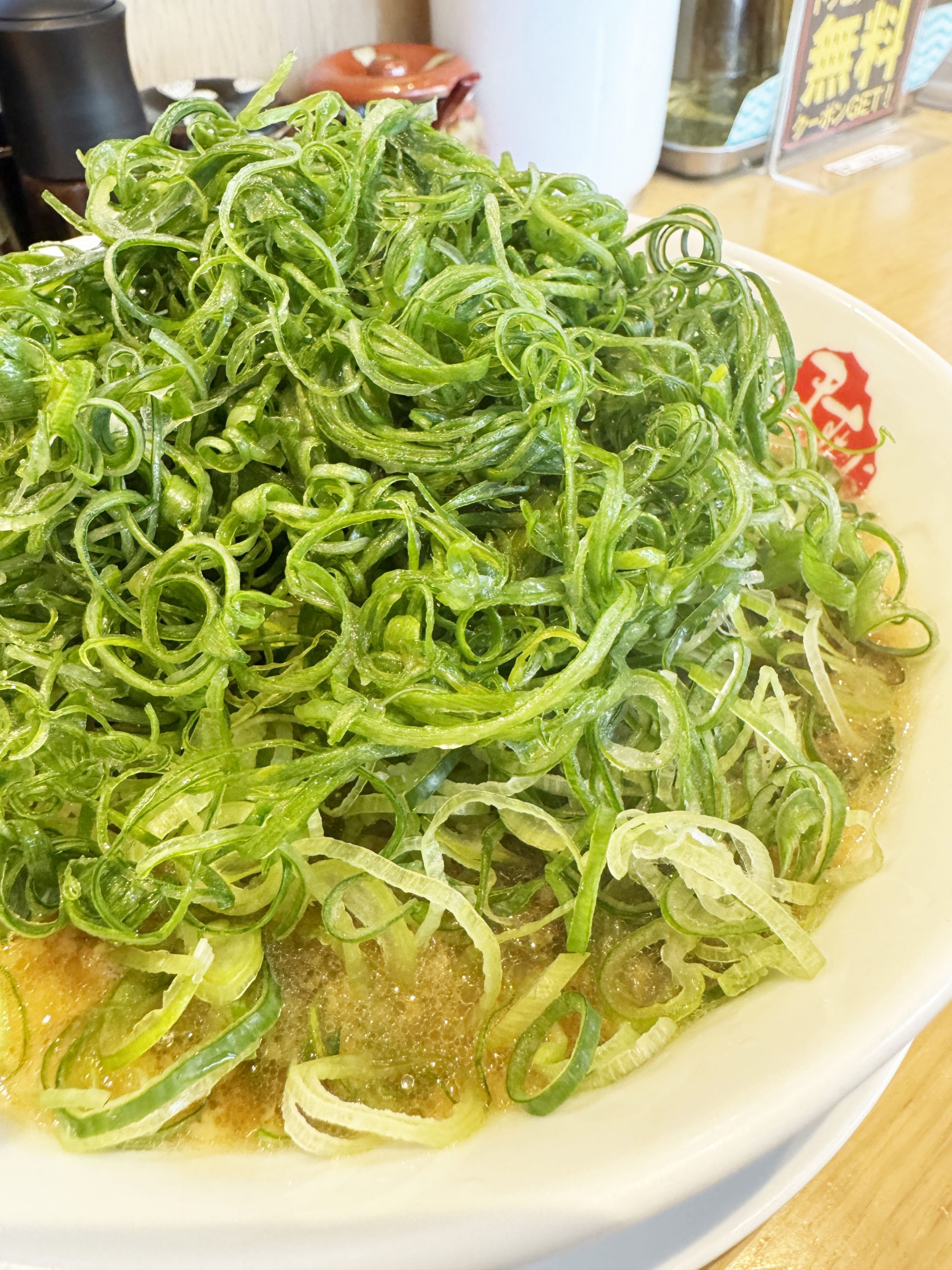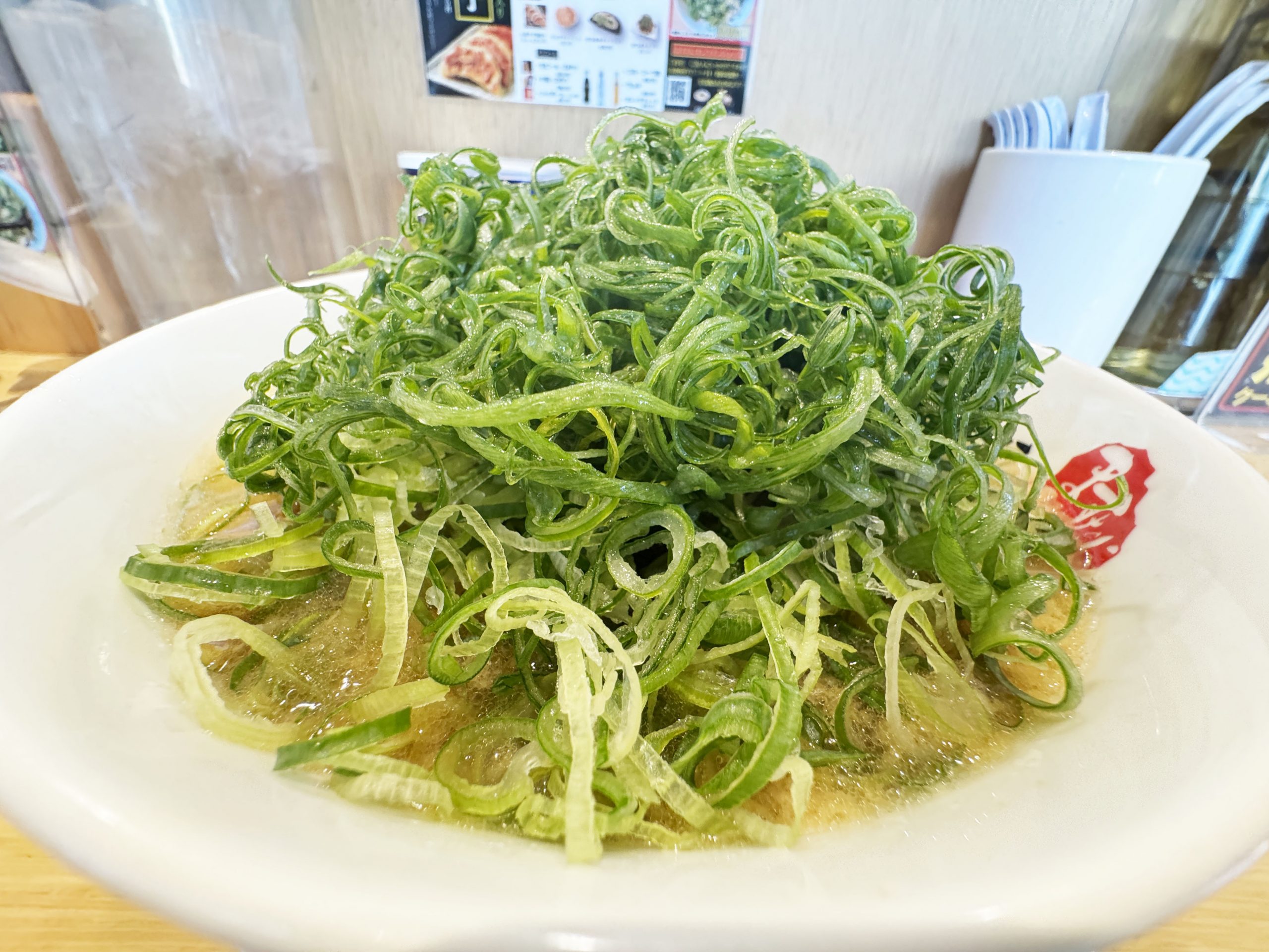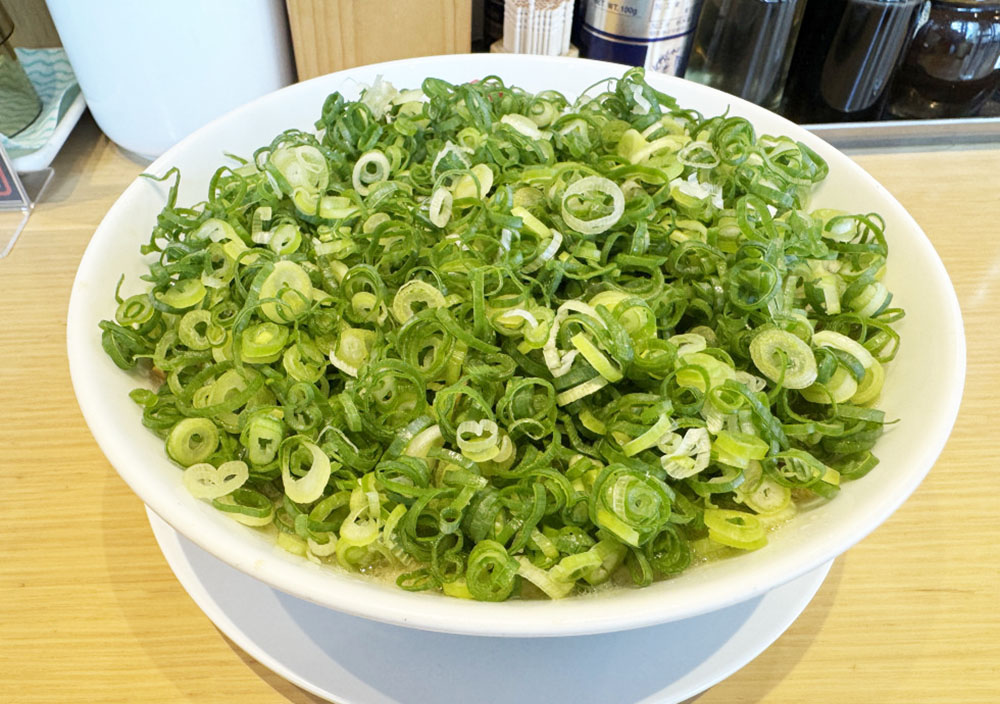 以下の画像は、九条ネギをマシマシにしたバージョンのラーメン。