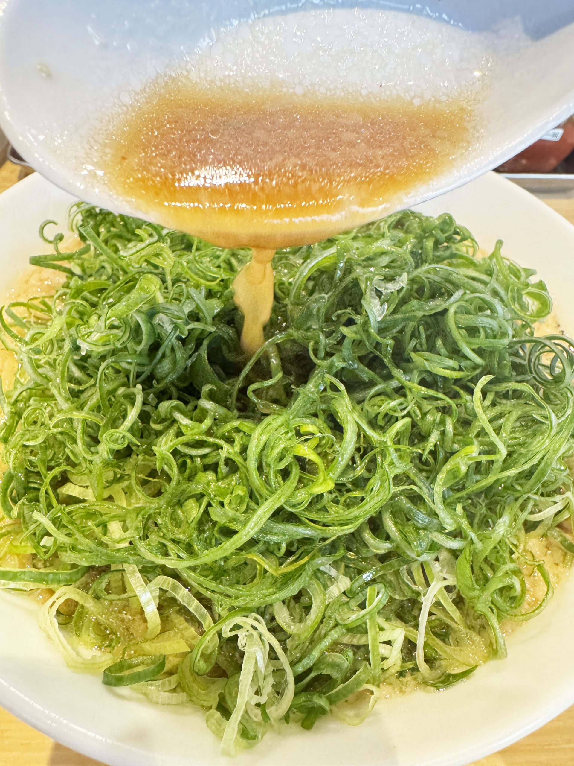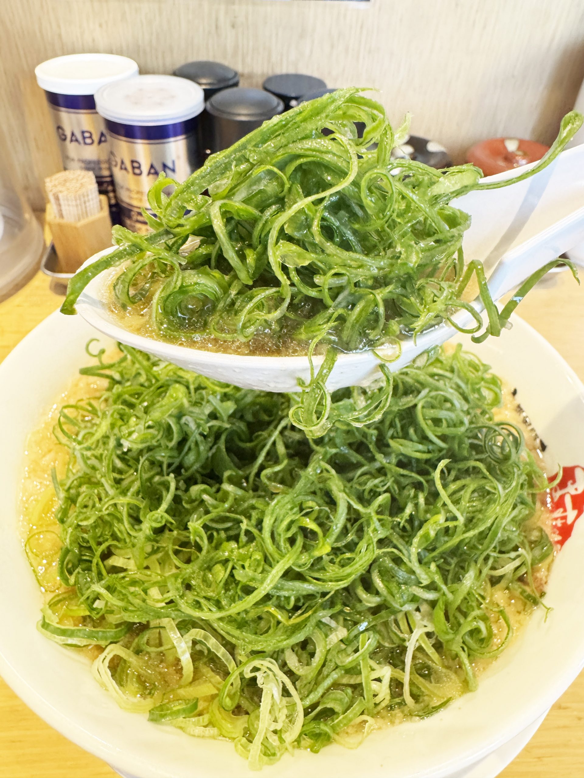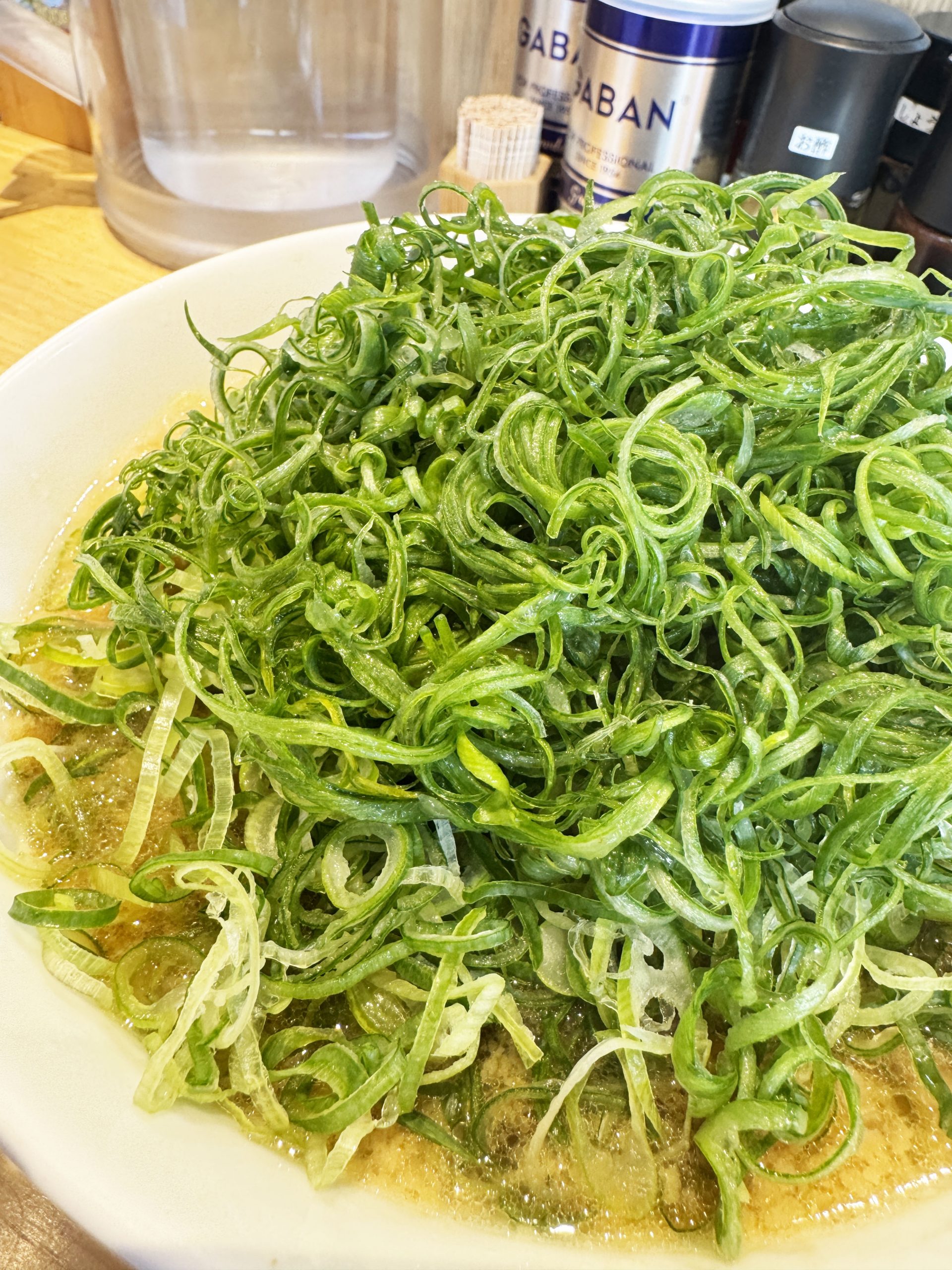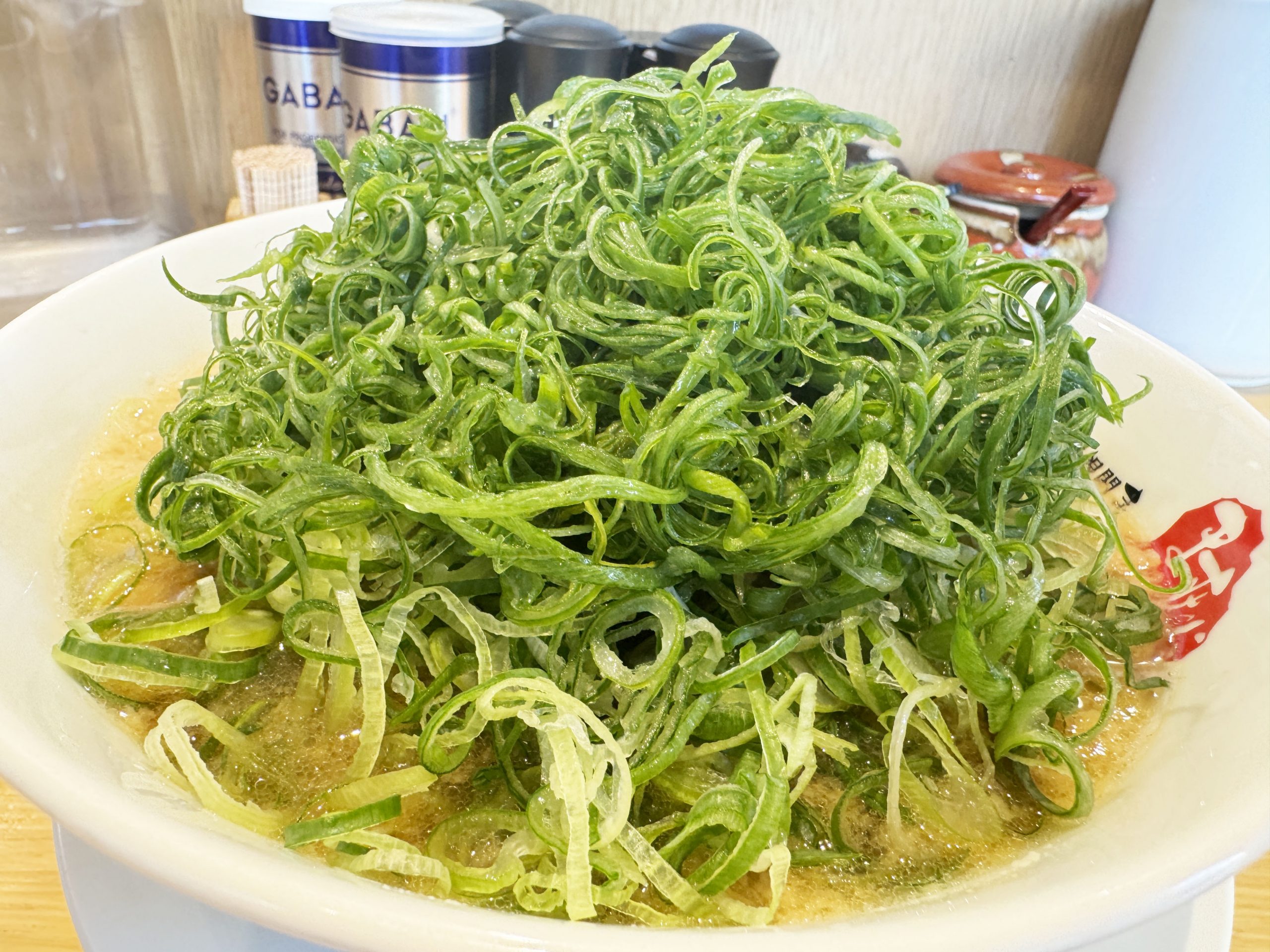 以下の画像は、九条ネギをマシマシにしたバージョンのラーメン。