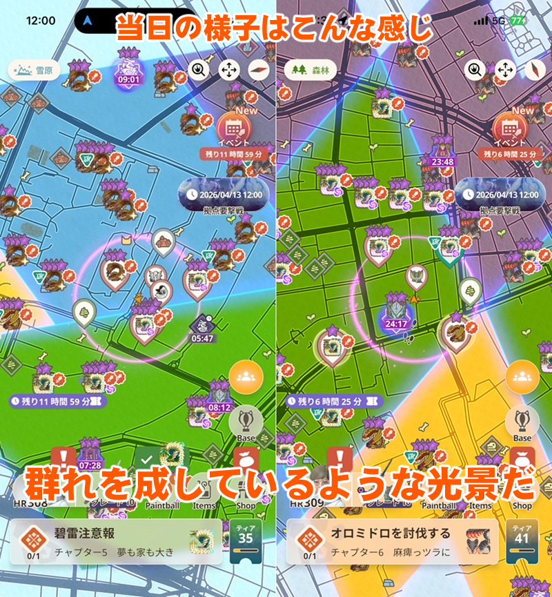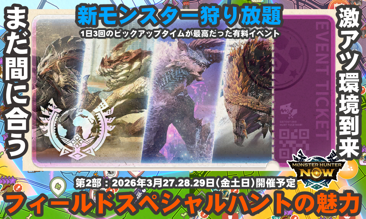 位置情報ゲーム『モンハンNow』では以前から特定のモンスターに焦点を当てたフィールドスペシャルハントという有料イベントがシーズン毎に開催されている。