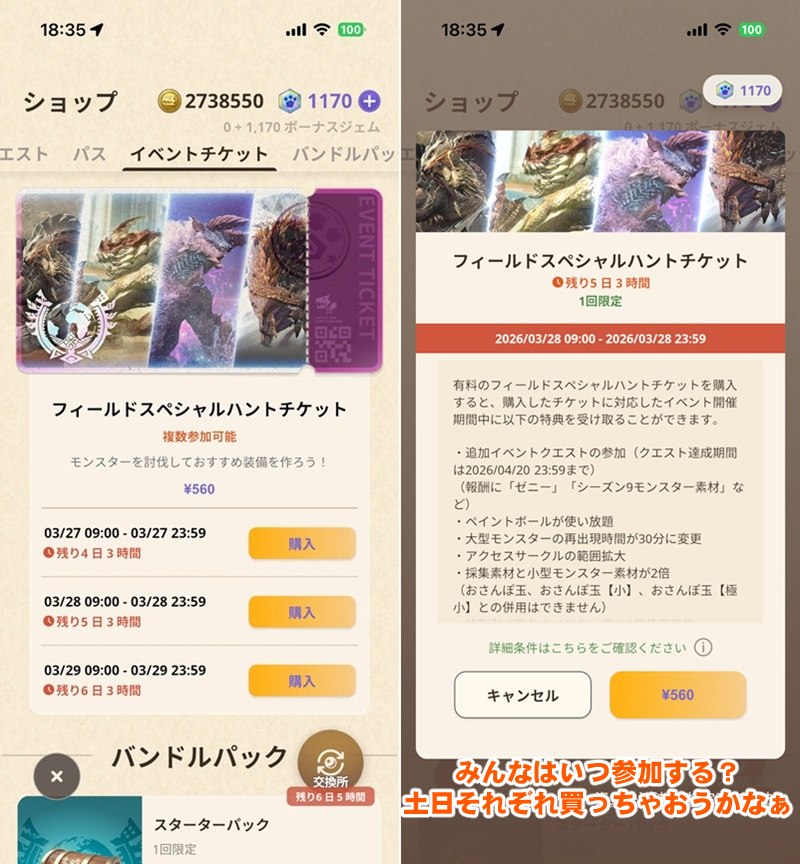 ユーザーは開催期間中の好きな日程からチケット(560円)を選択でき、当日はさまざまな効果を受けながら特別な狩猟を体験できるのが大きな特徴だ。