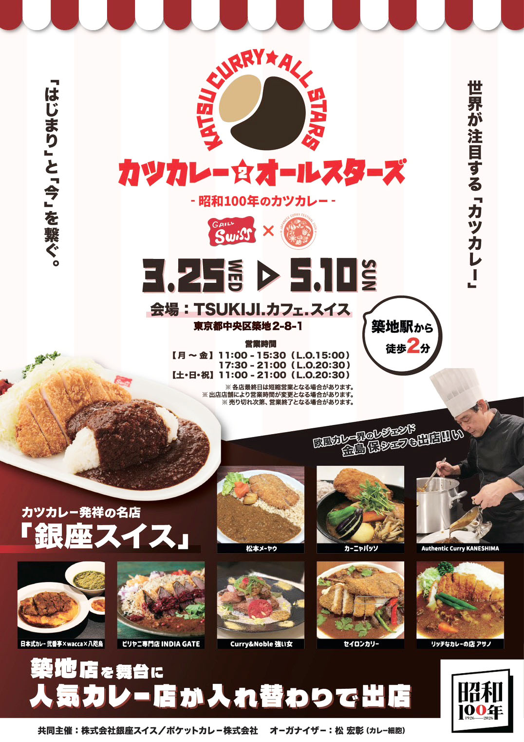 2026年3月25日〜5月10日開催!カツカレー元祖の店として知られる『銀座スイス』その築地店にて、今をときめく人気カレー店8店がリレー形式で出店します。