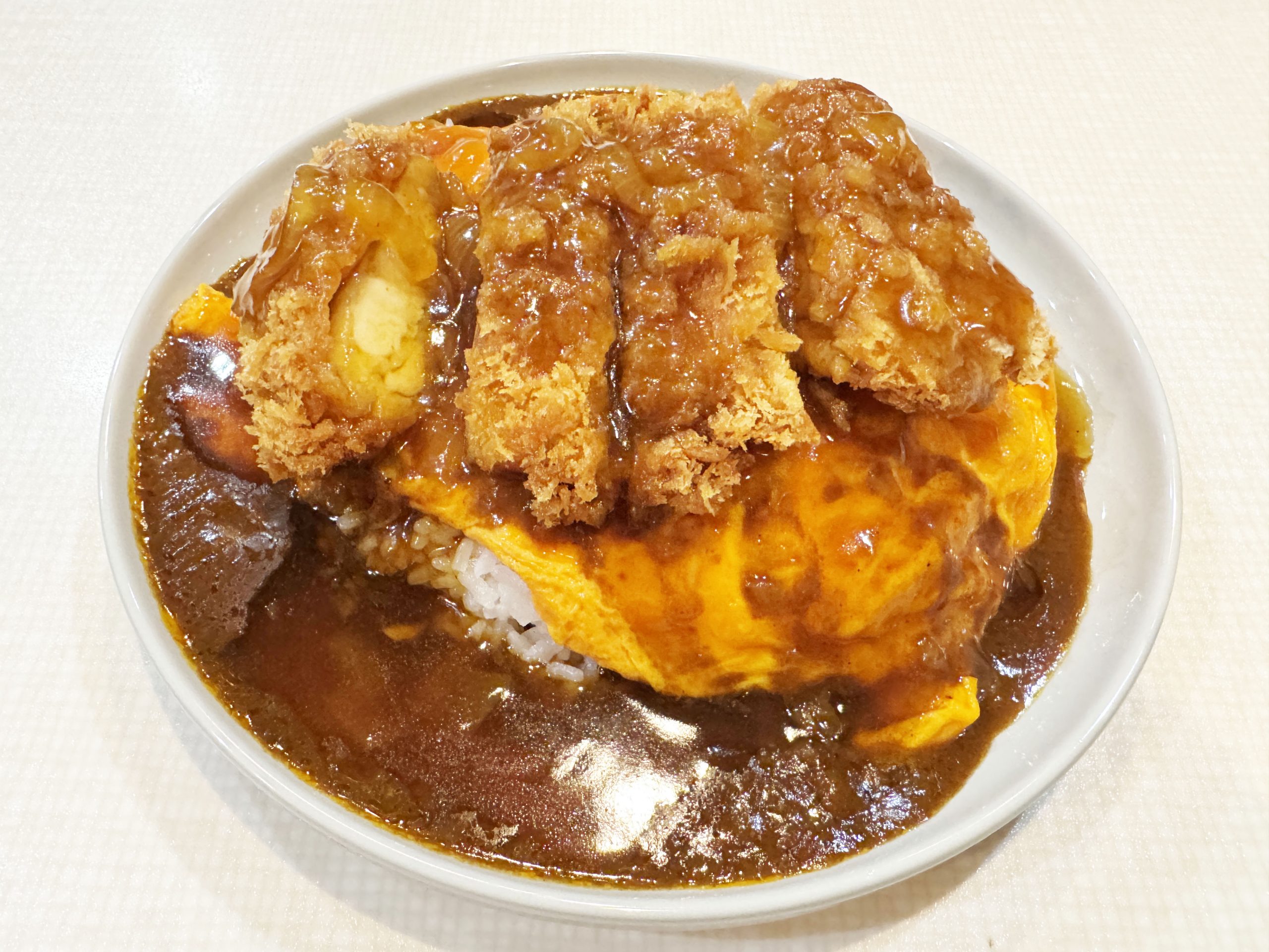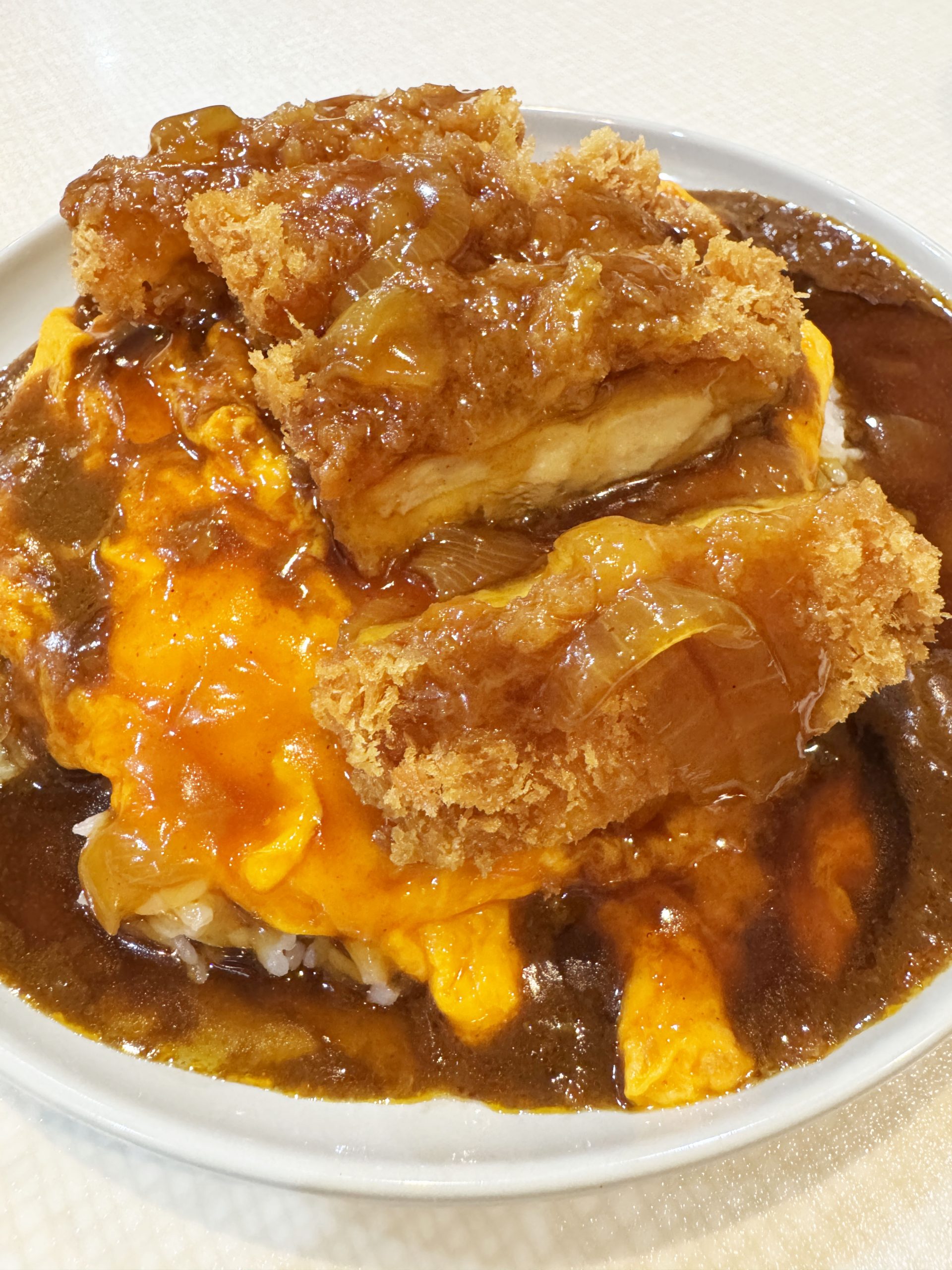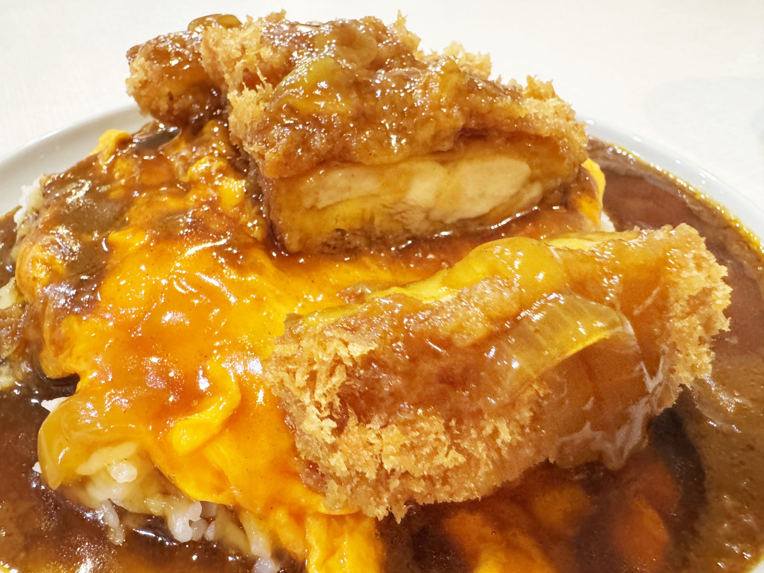 鶏カツ丼カレー、これもまた至高のもの。スプーンでカレー、あん、玉子、鶏カツ、ライスをすくって食べる。ガリザクッ! あんがしみ込んだ部分はジュワジュワでジューシーウマイ! 衣のクリスピー感が残っている部分は香ばしさ炸裂! そしてあんのディープな甘味が風味絶佳。ラスト、カレーのキリッとしながらも強いコクのある旨味がやってくる。