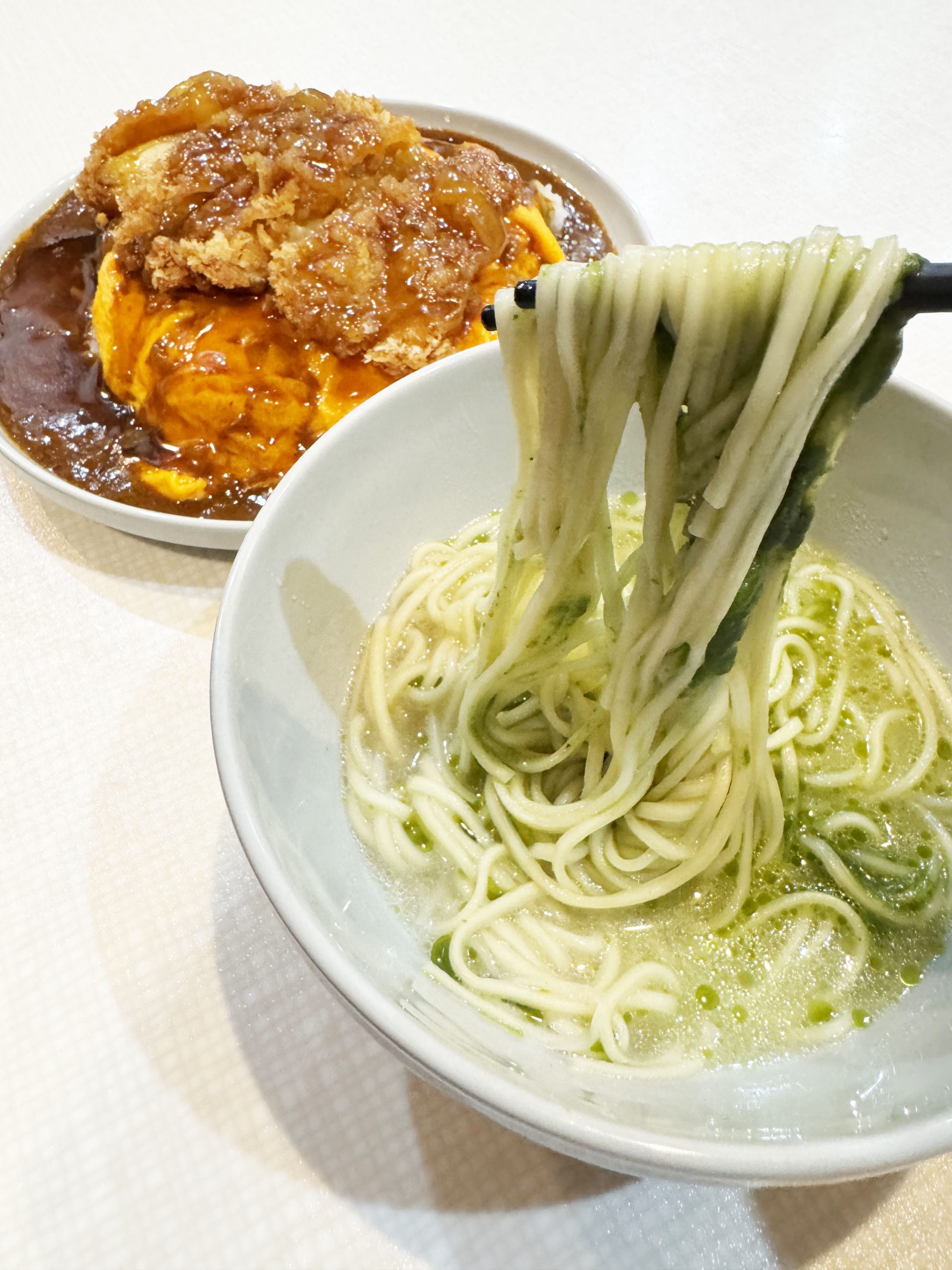 鶏カツ丼カレーとともにやってきたグリーンカレーラーメン。つまりこれ、カレーとカレーがセットになったカツカレーなのだ。どちらもカレーというジャンルだが、日本カレーとタイカレーの融合という点で、極めて珍しい希少なもの。