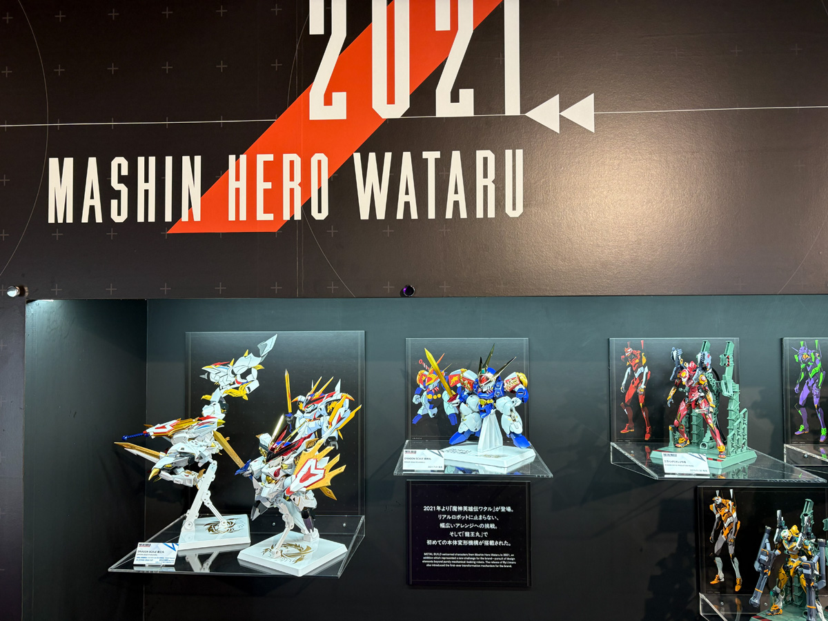 『ガンダム』シリーズを中心に、『エヴァンゲリオン』『聖戦士ダンバイン』『コードギアス』『魔神英雄伝ワタル』など多彩な作品のフィギュアがズラリと並ぶ15年分の歩みは、ブランドのファンにとってはたまらない空間だ。