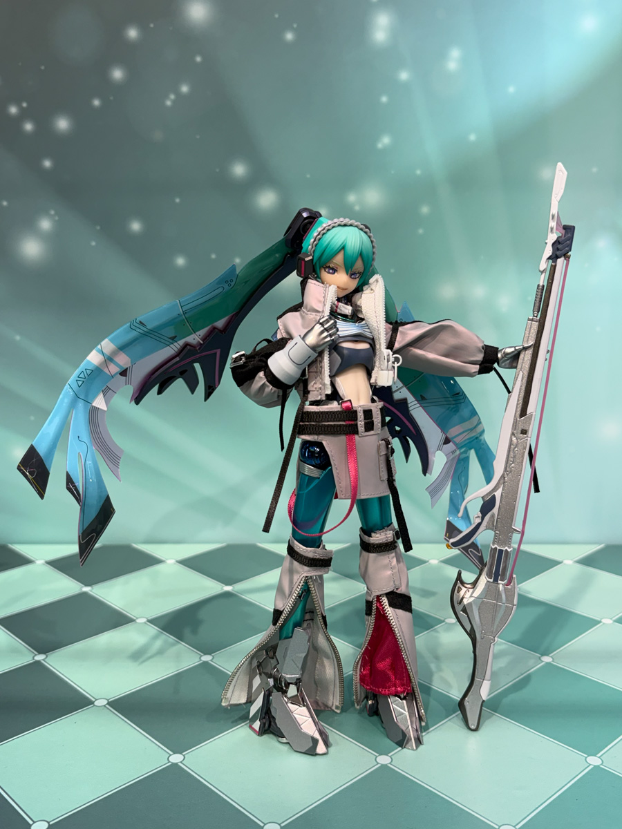 付属品も充実しており、目を閉じた歌唱顔やいたずらっぽく微笑む笑顔など4種の表情パーツ、ロングライフル風の大型音響ガジェット、ホロ箔を使用した専用台座などが同梱。パッケージデザインも本商品のために新たに描き下ろされたもので、プロダクト全体としての完成度が半端ではない。
