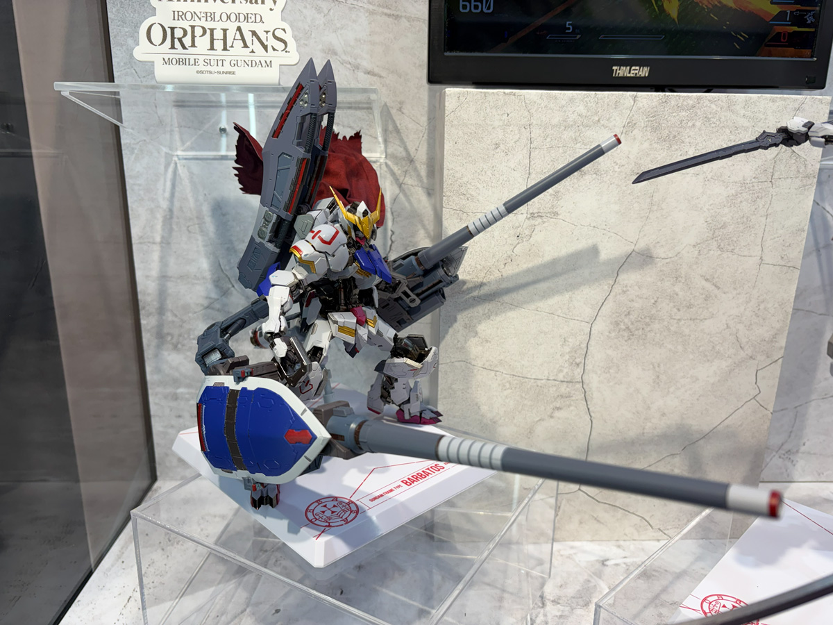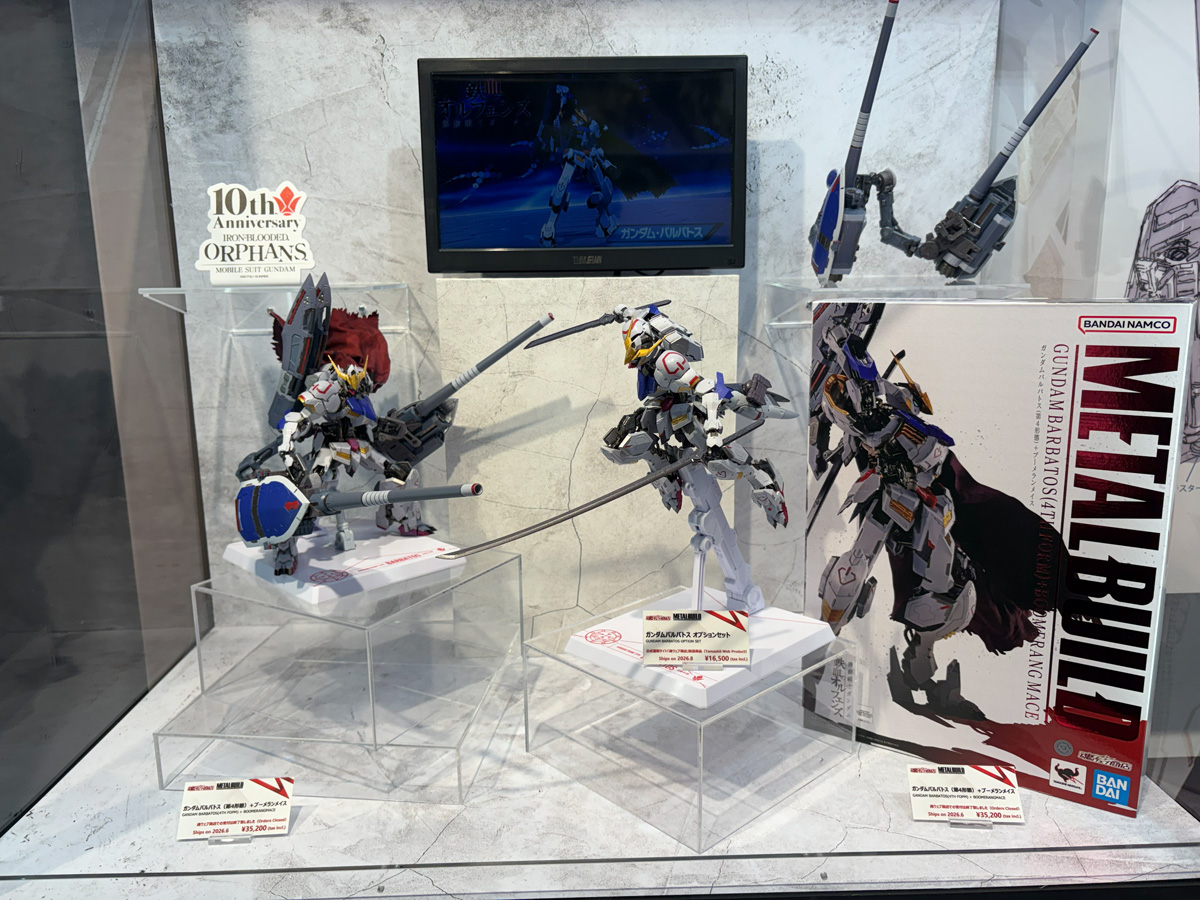 加えて、10周年記念新作短編『幕間の楔』に登場したガンダム・バルバトスアダプトの腰部スラスターユニットと太刀/小太刀が同梱されており、会場では「460mmライフル砲」を構えた姿と、アダプト装備で跳躍する姿の2パターンで展示されていた。本体の「METAL BUILD ガンダムバルバトス(第4形態)+ブーメランメイス」と合わせると、再現できる世界がグッと広がるはずだ。