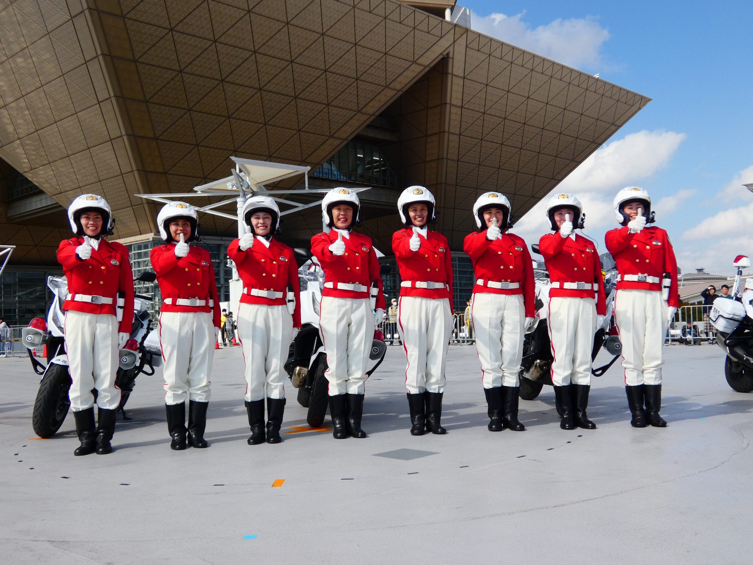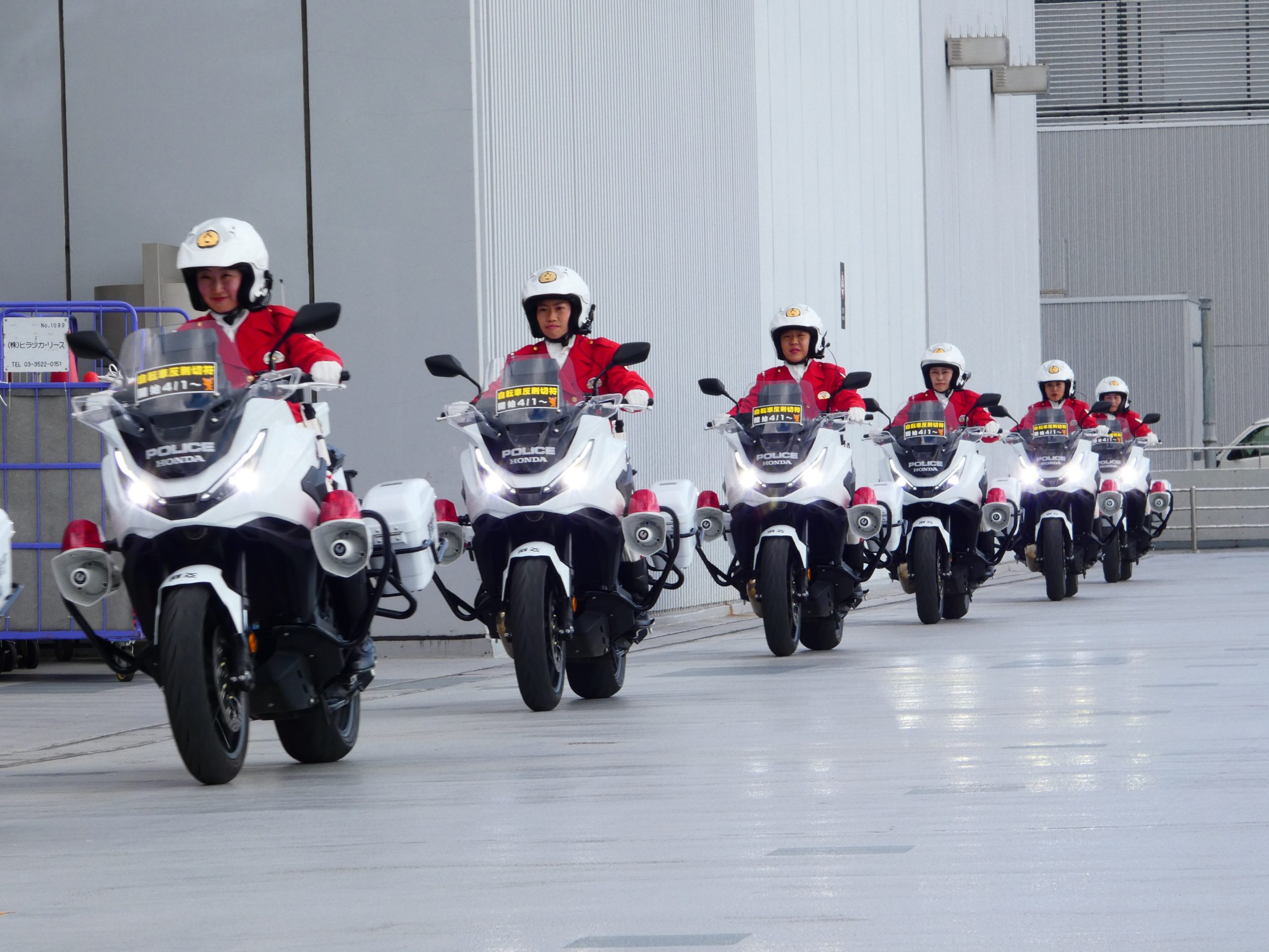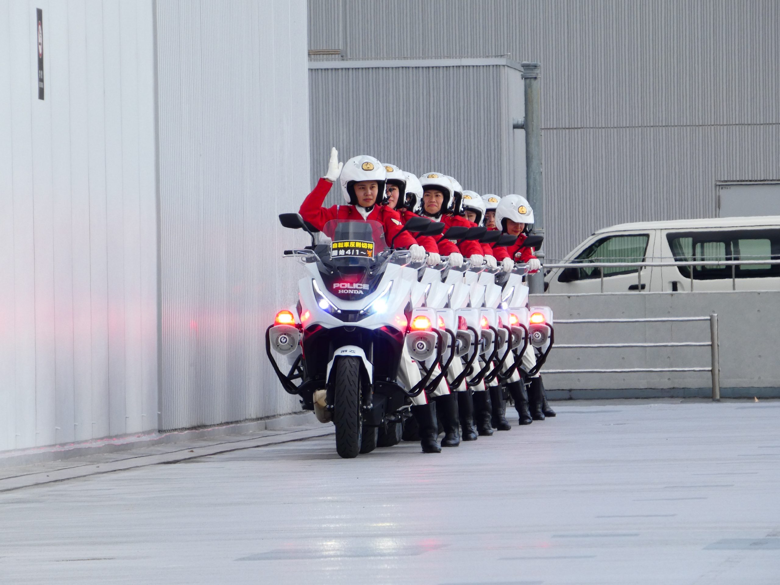 屋外イベント会場の⼀部を利⽤して、警視庁 ⼥性⽩バイ隊クイーンスターズによる「ドリル⾛⾏」のデモンストレーション