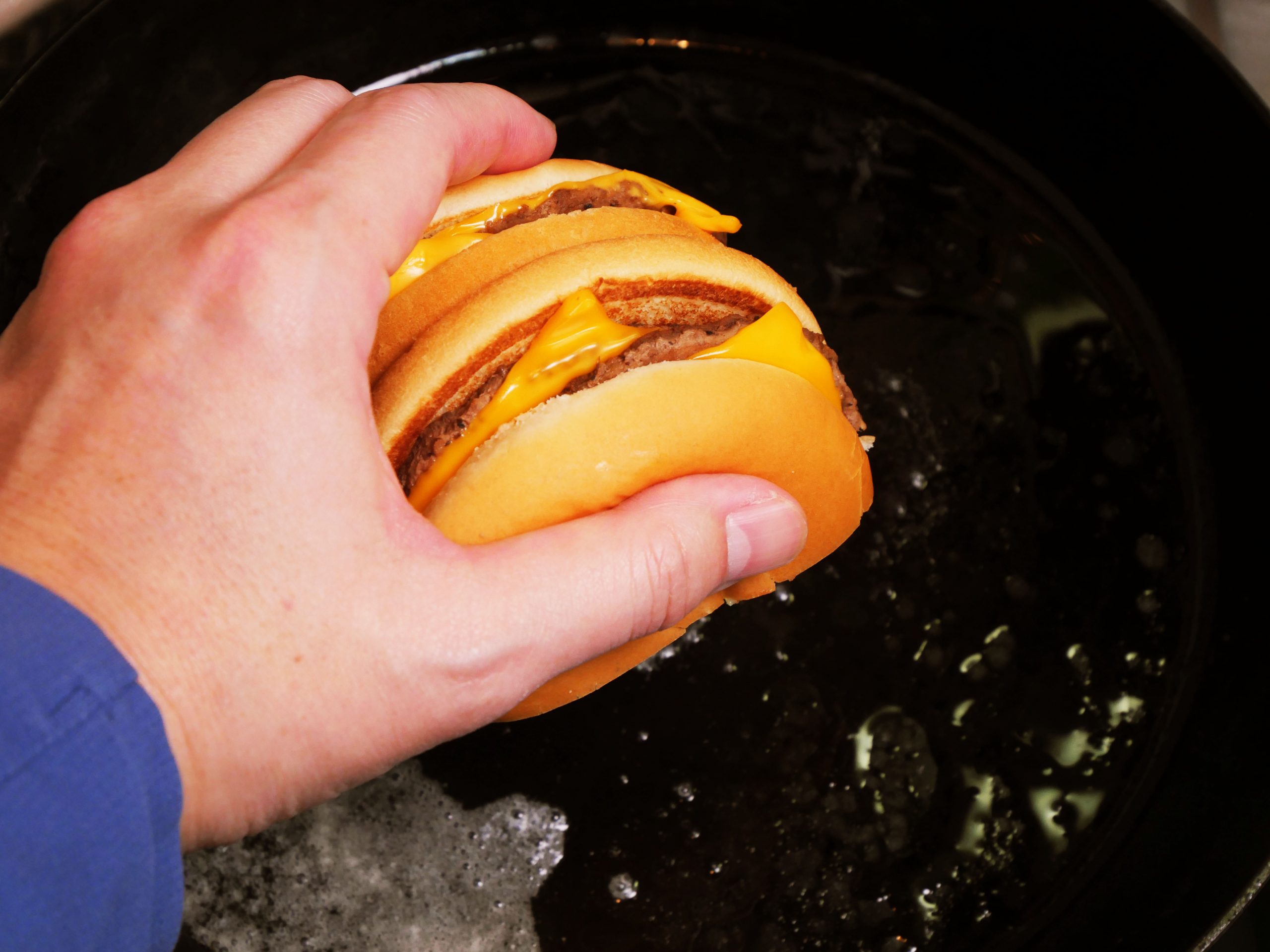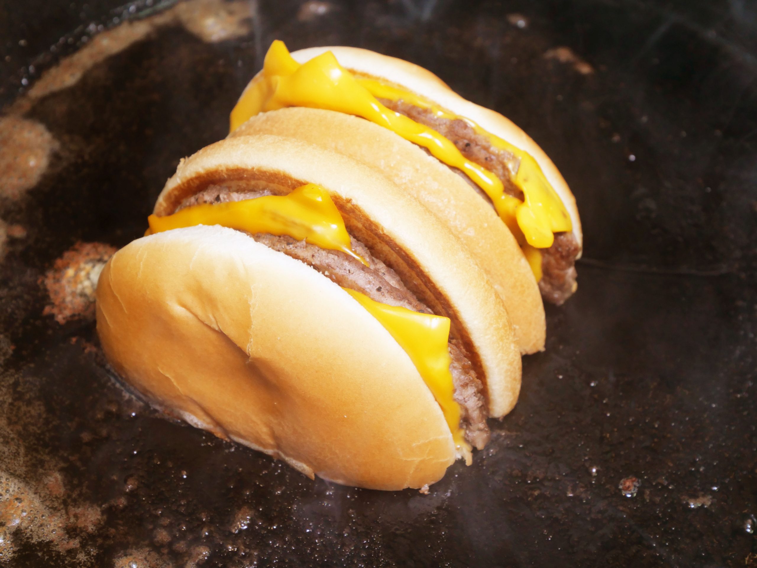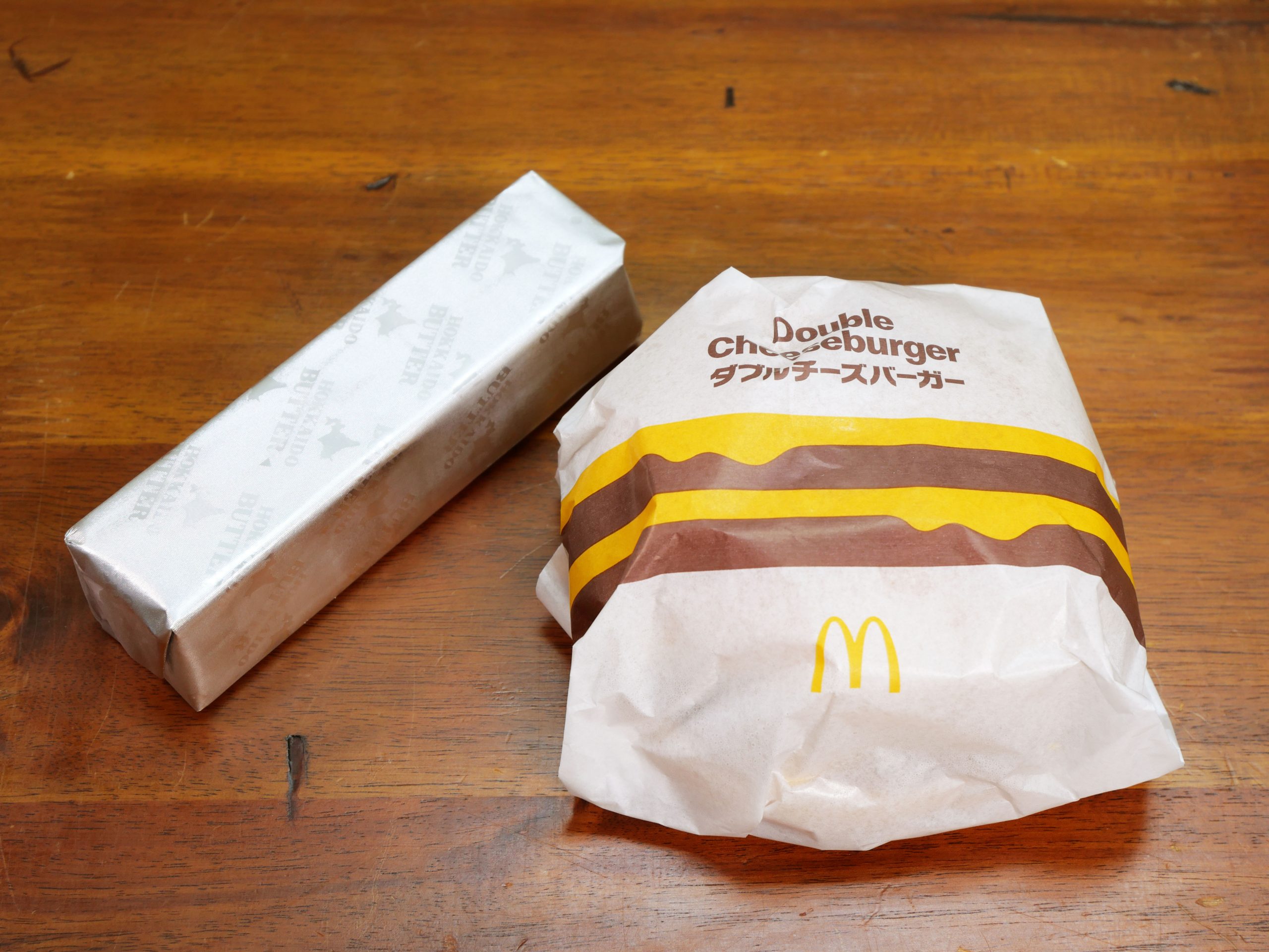 このアレンジレシピは極めてカンタンだ。テイクアウトしたダブルチーズバーガーを半分に切る。フライパンでバターを加熱し、ダブルチーズバーガーの断面を下にしてフライパンで焼くだけ。ただそれだけで激ウマ化するというのである。