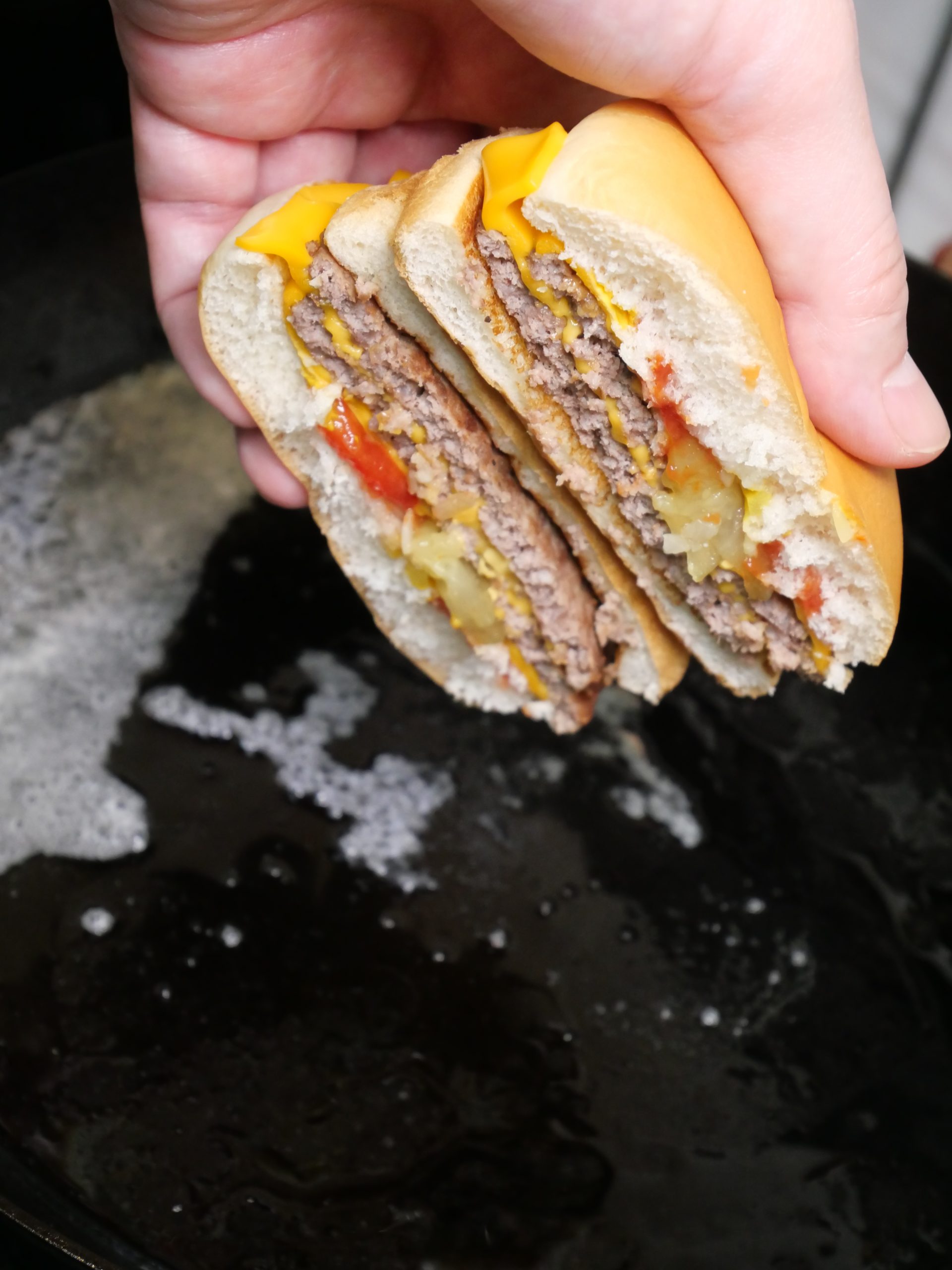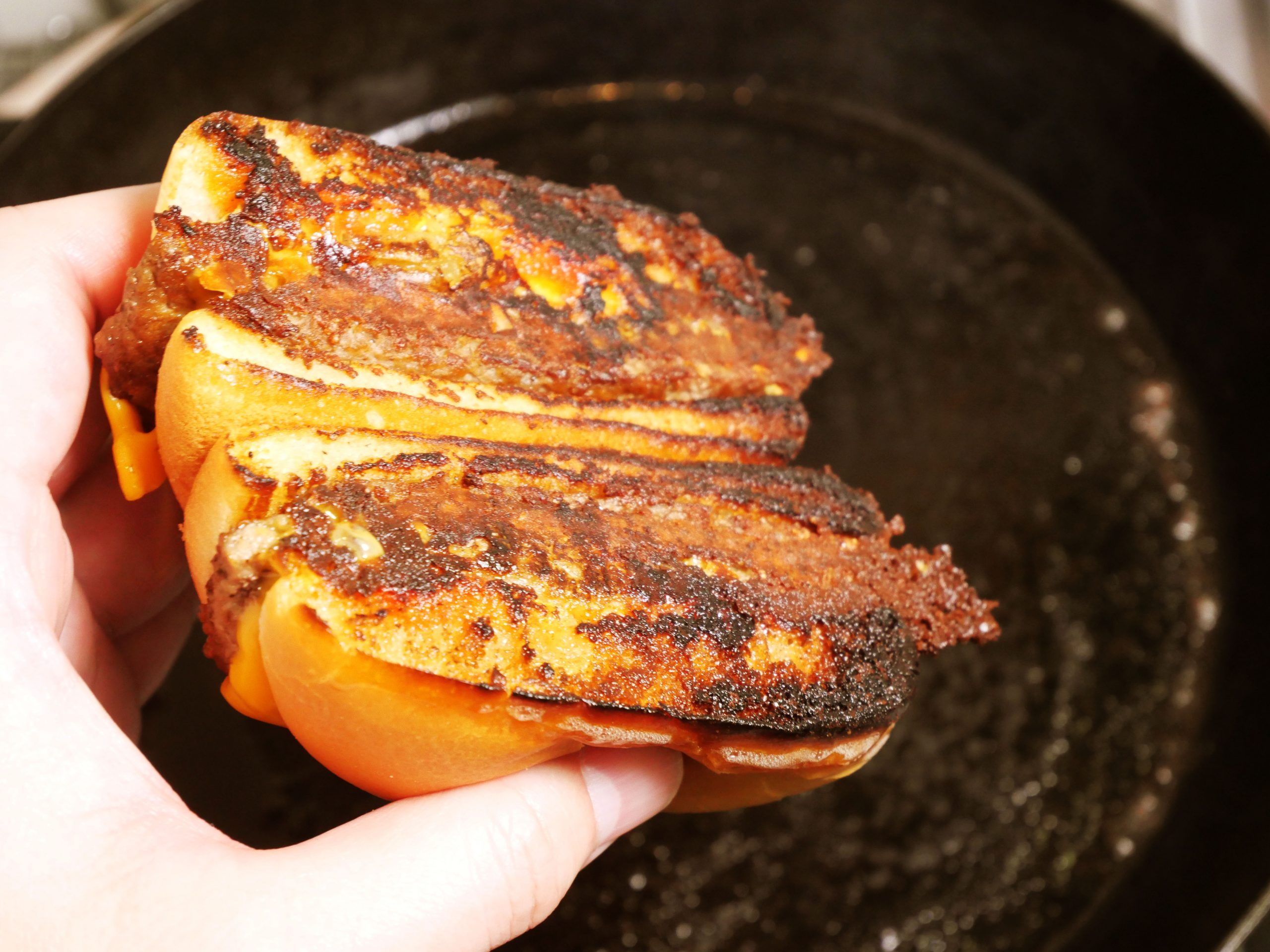 3. ダブルチーズバーガーの断面を下にしてフライパンで焼く