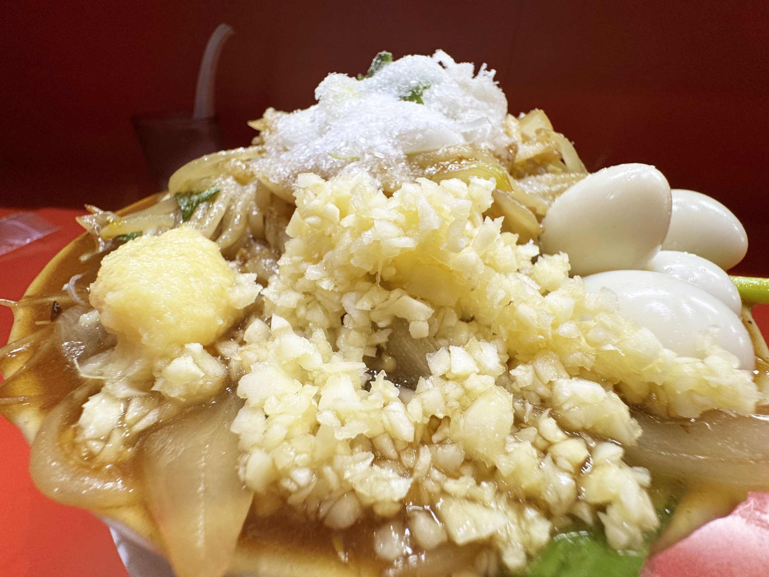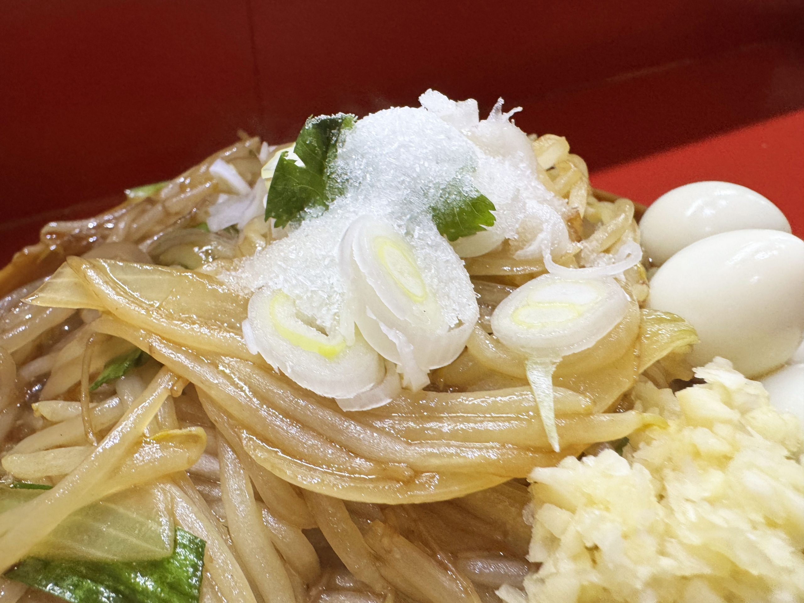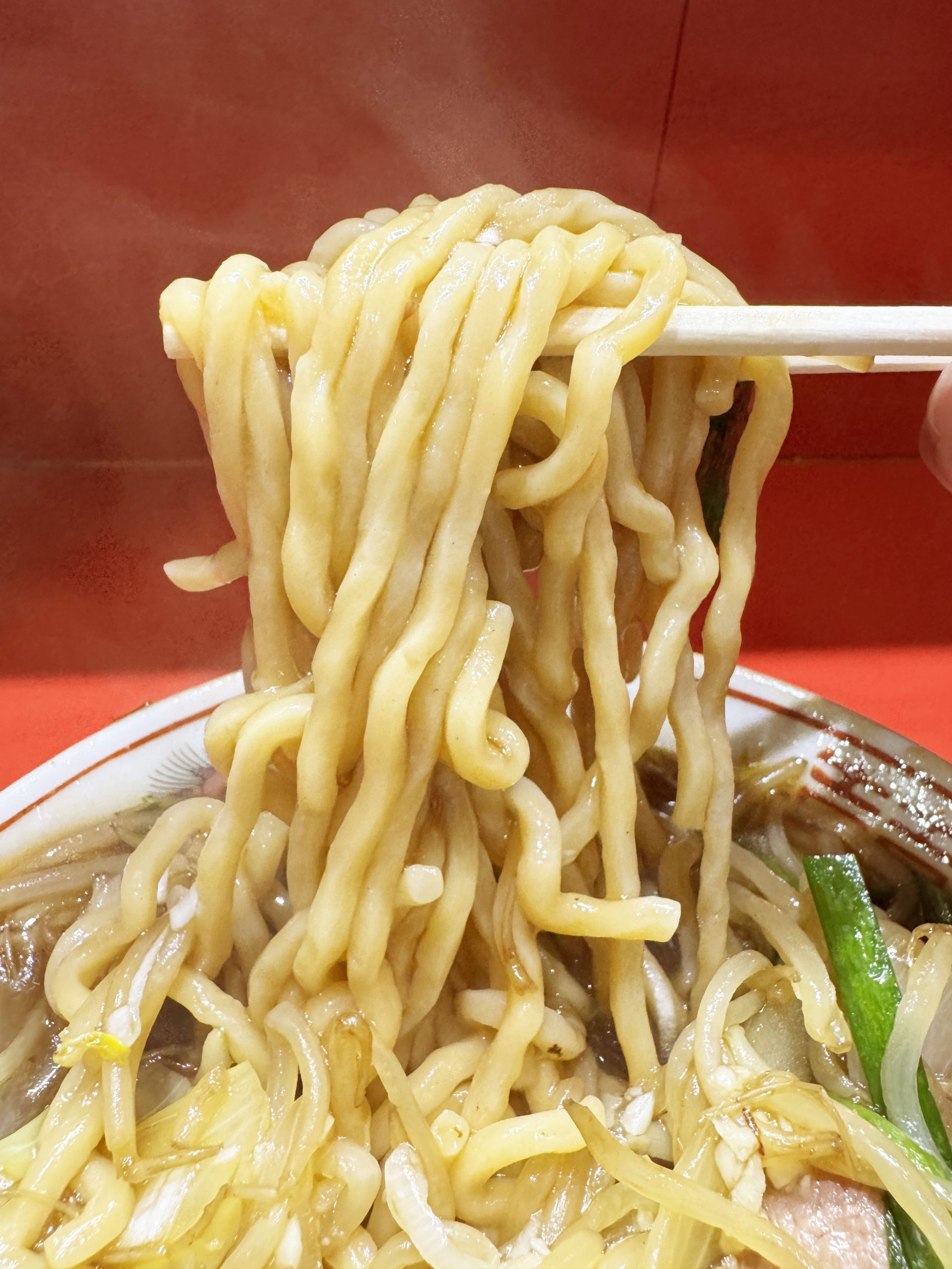 しっかりと炒められて味がしみ込みまくったヤサイは極上。しかも謎の粉の効果により、旨味が爆上がり。さすがうま味調味料である。そして麺が素晴らしく最良のコンディション。極太麺で縮れ系であるにもかかわらず、けっして硬すぎず、心地よい弾力を延々と楽しませてくれる。