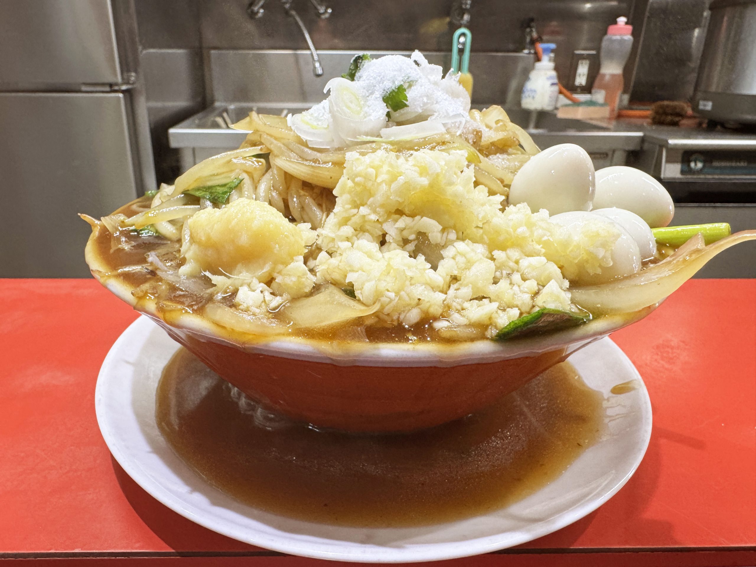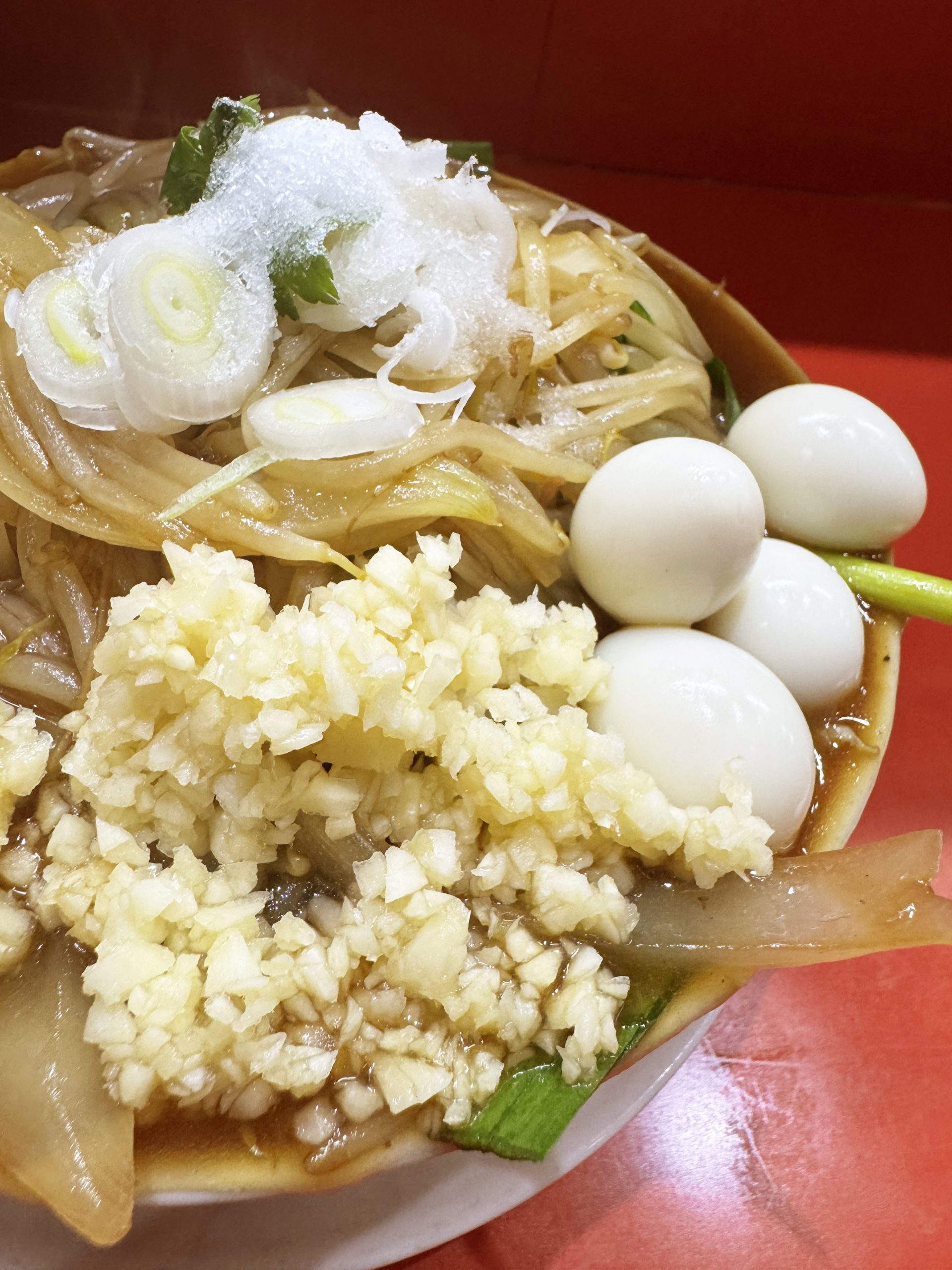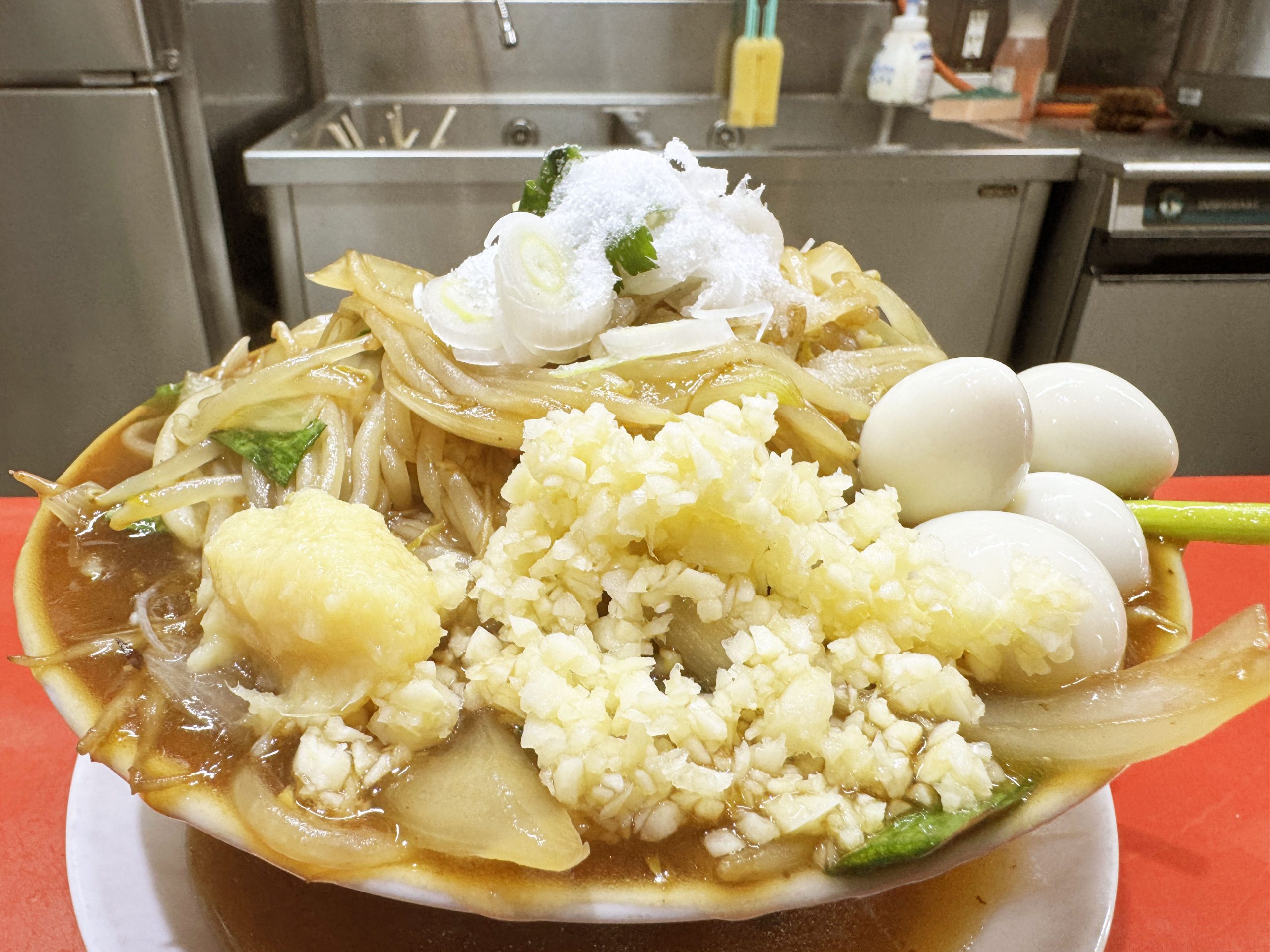 しっかりと炒められて味がしみ込みまくったヤサイは極上。しかも謎の粉の効果により、旨味が爆上がり。さすがうま味調味料である。そして麺が素晴らしく最良のコンディション。極太麺で縮れ系であるにもかかわらず、けっして硬すぎず、心地よい弾力を延々と楽しませてくれる。