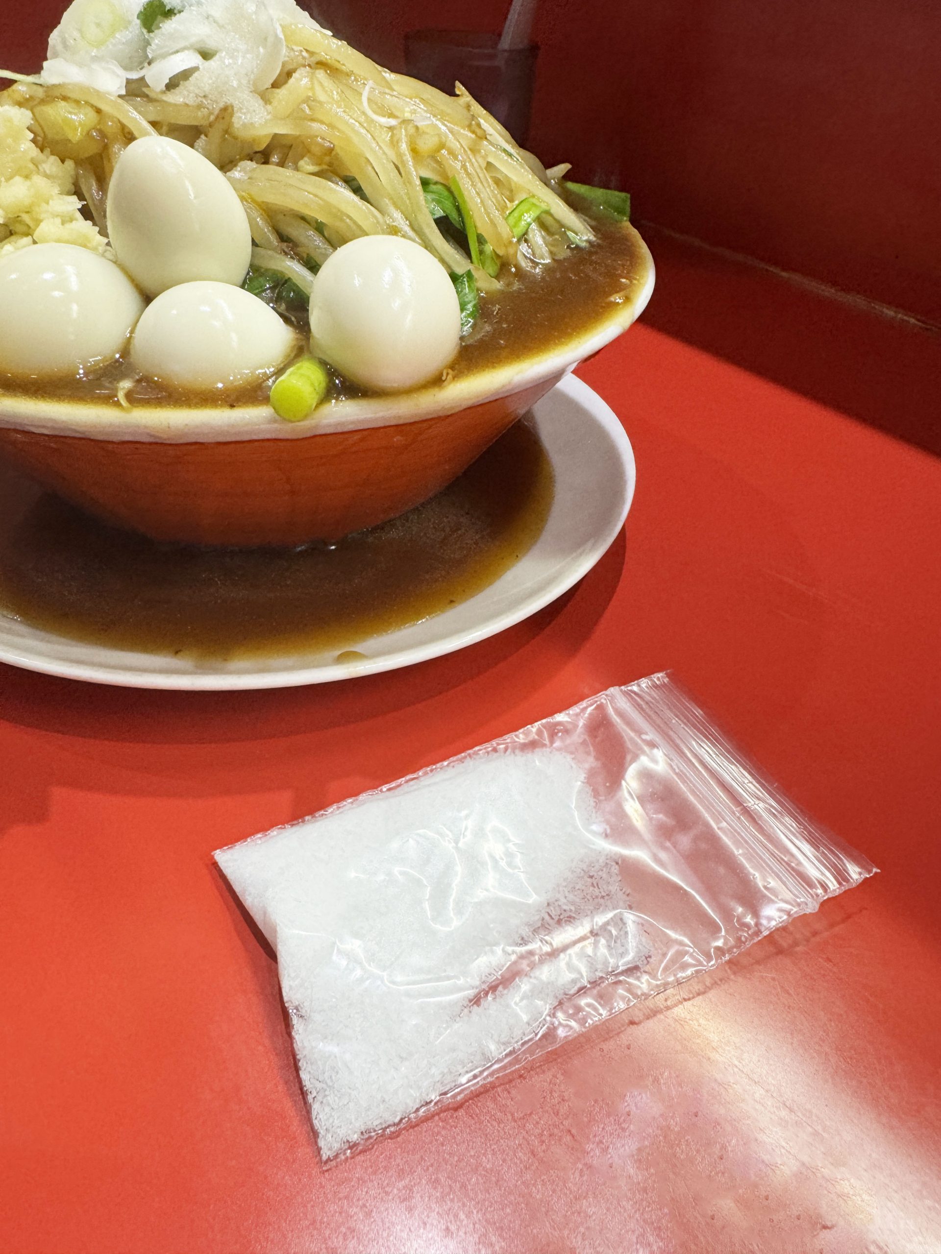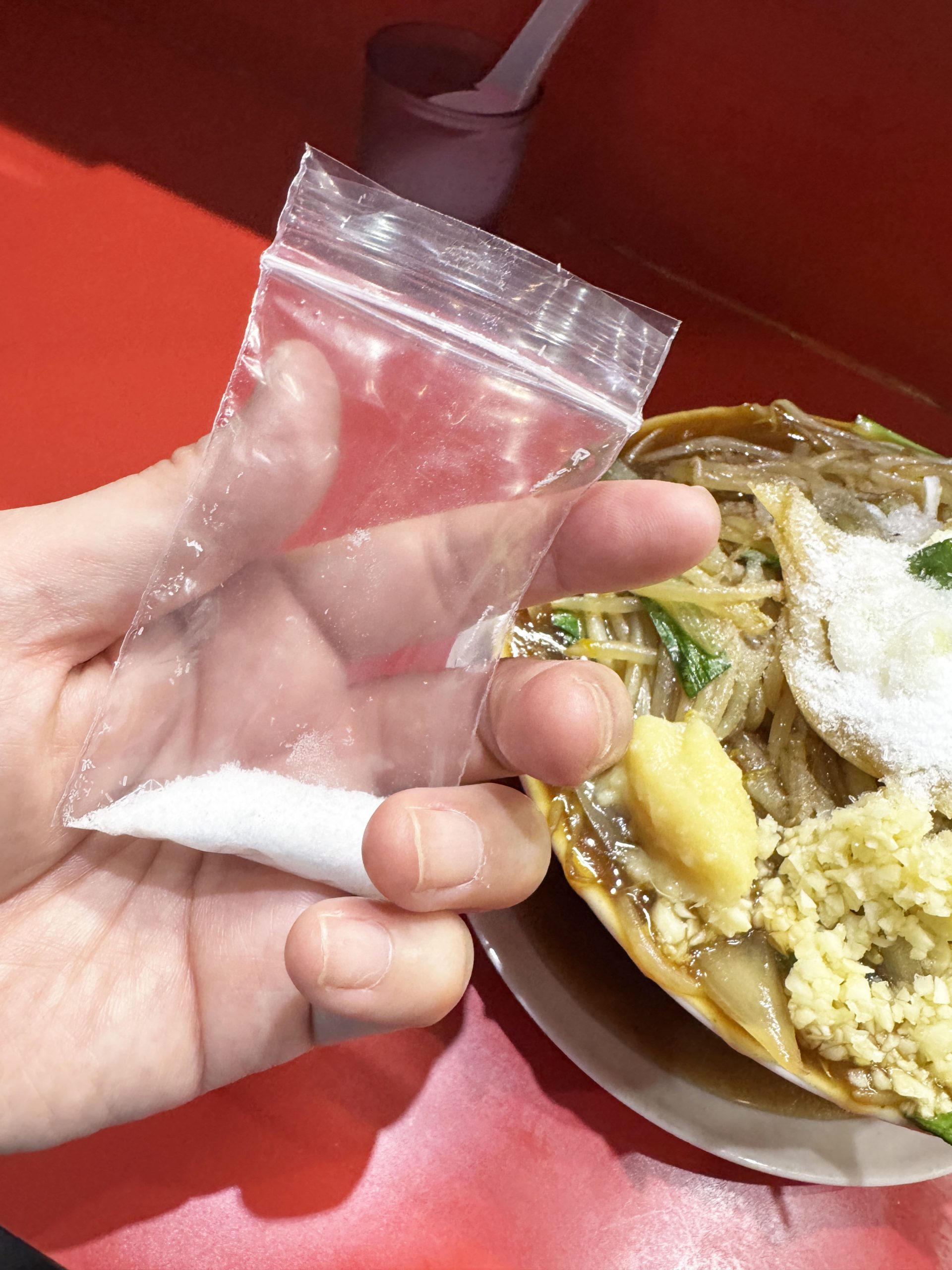 マリファラーメン+タシロマーシーマシサイクルブリブリだが、謎の粉がたっぷりと入った袋も添えられており、それをふりかけて完成となる。ガッツリと、たっぷりとかける。