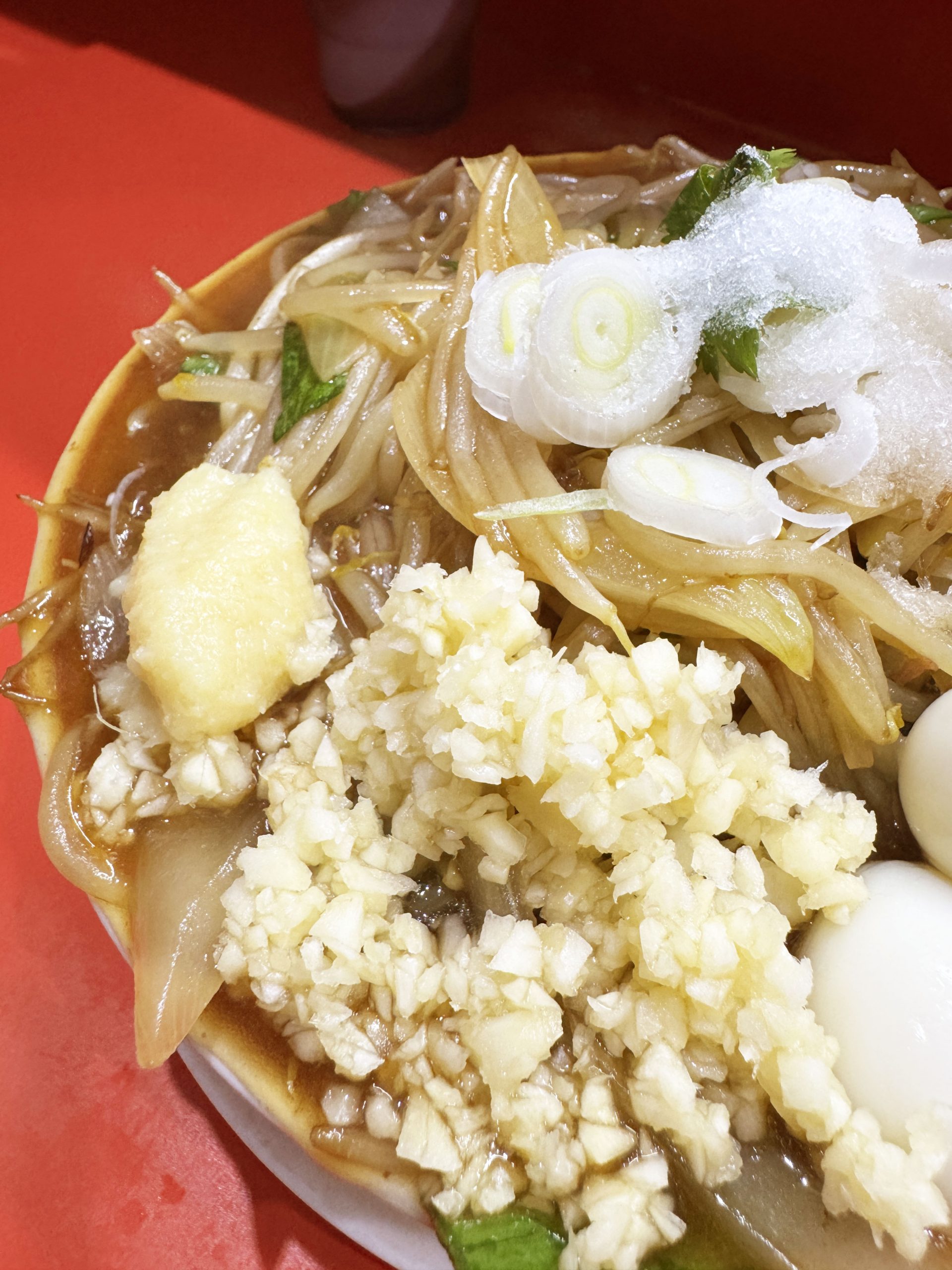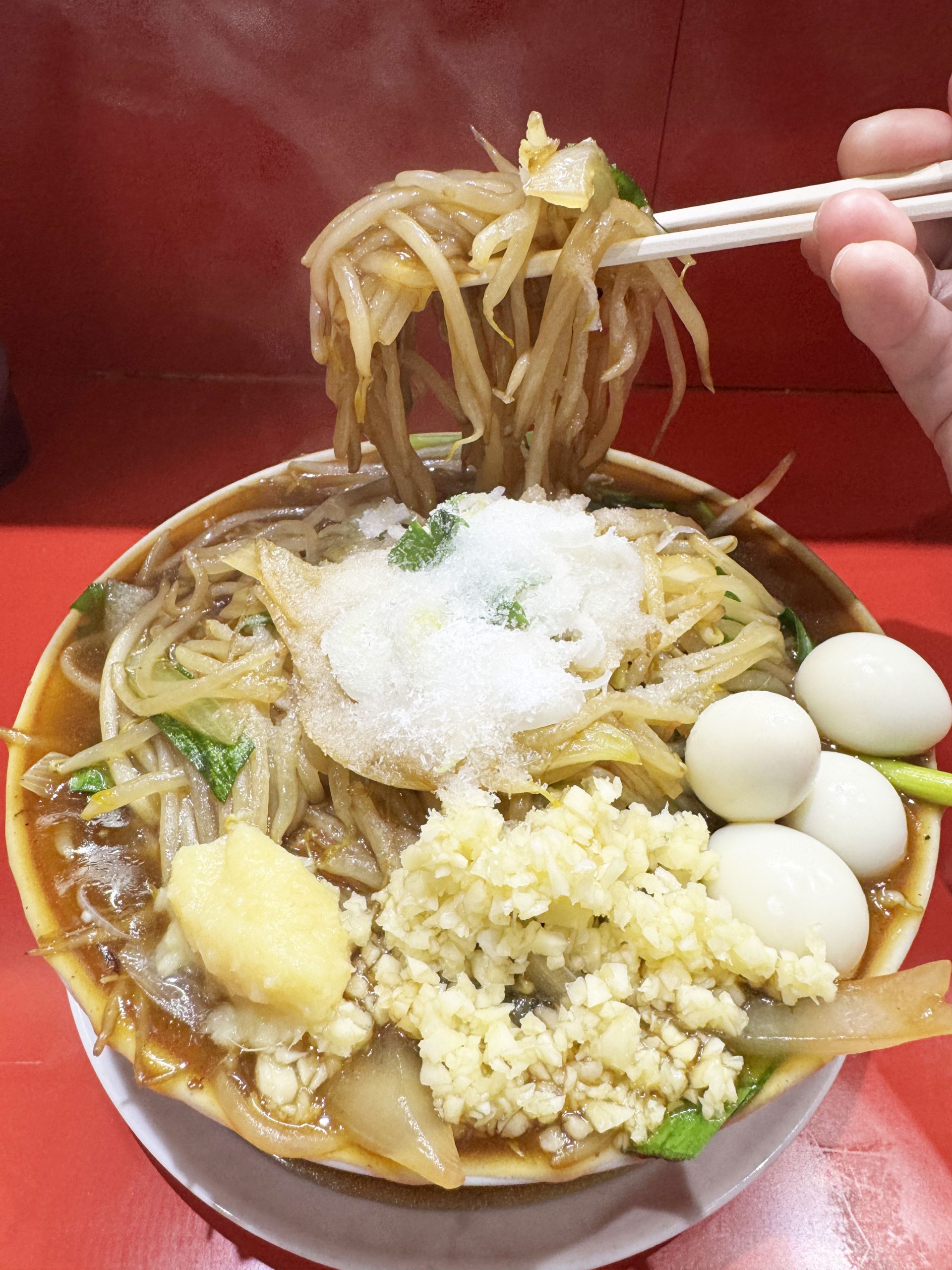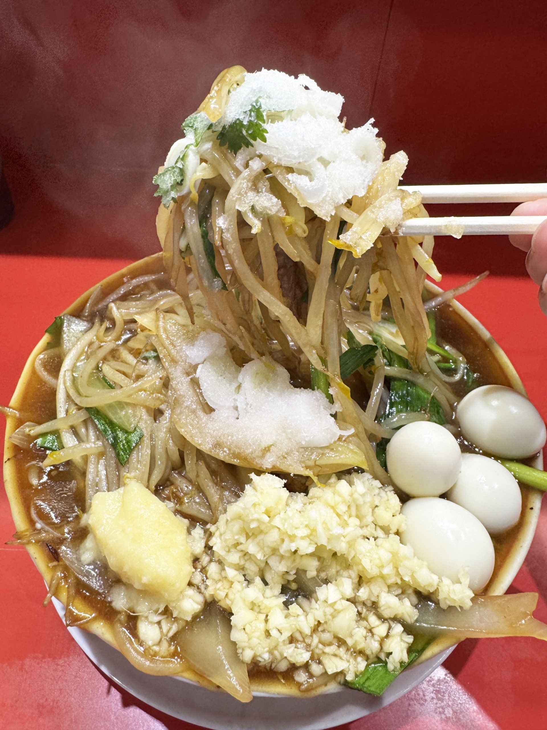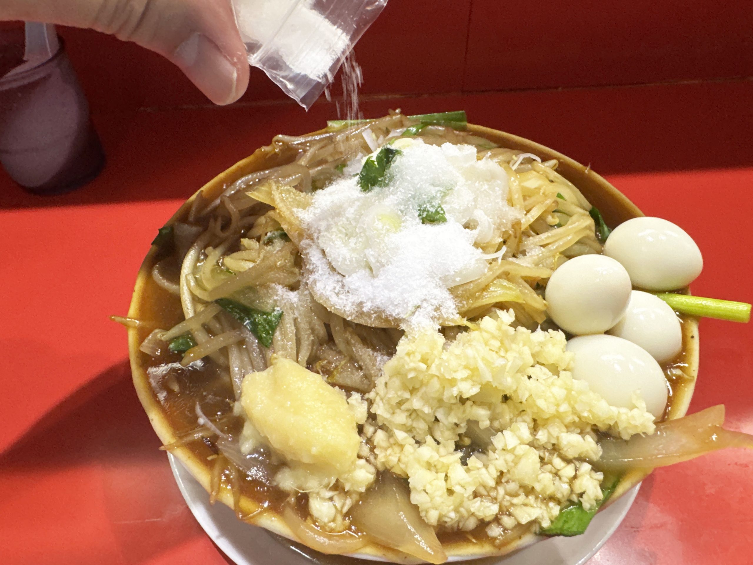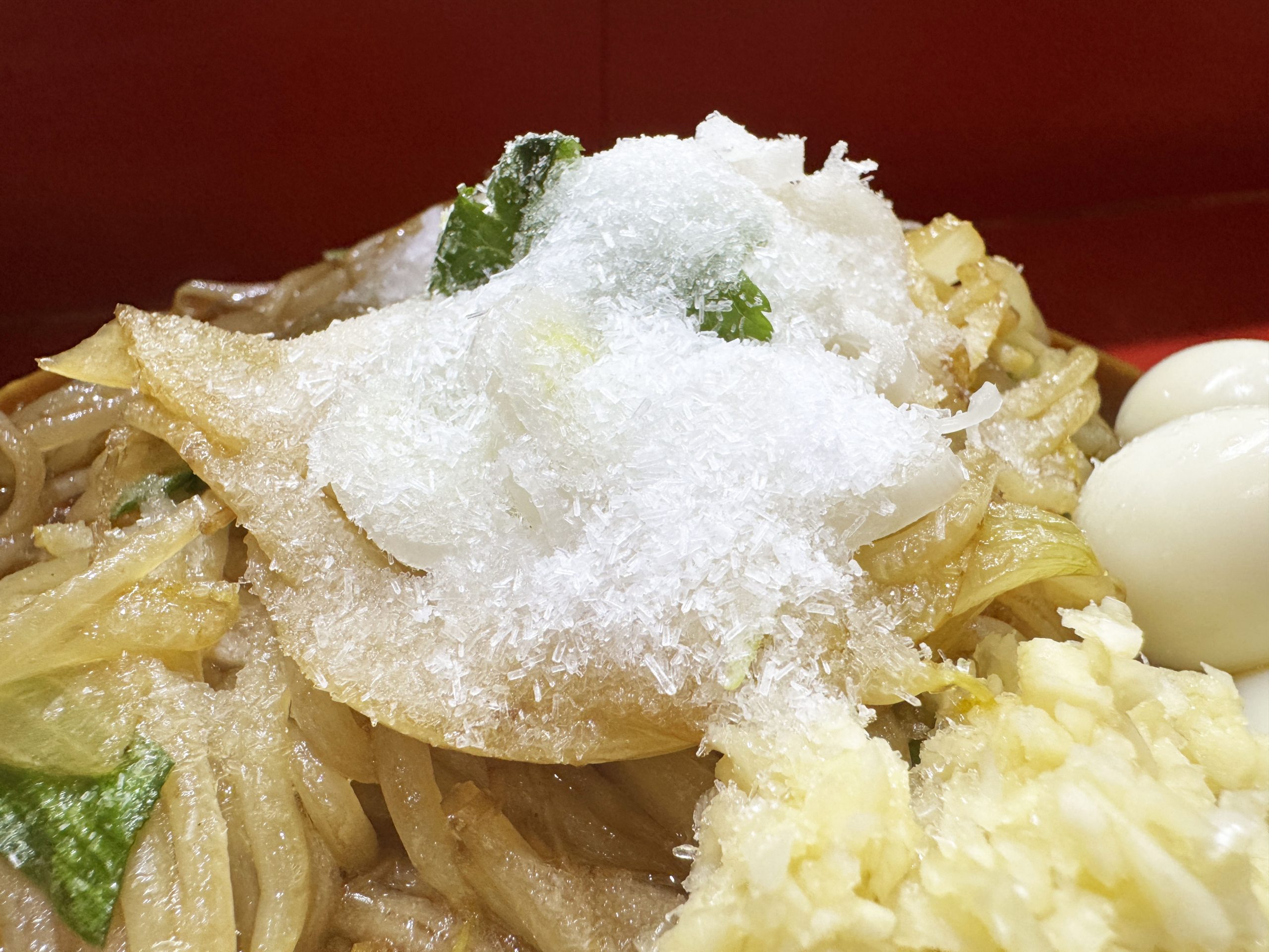 ヤサイアブラニンニクマシマシであり、謎の粉もたっぷりと振りかけられていた。まだ雪が残る春の富士山のような絶景である。
