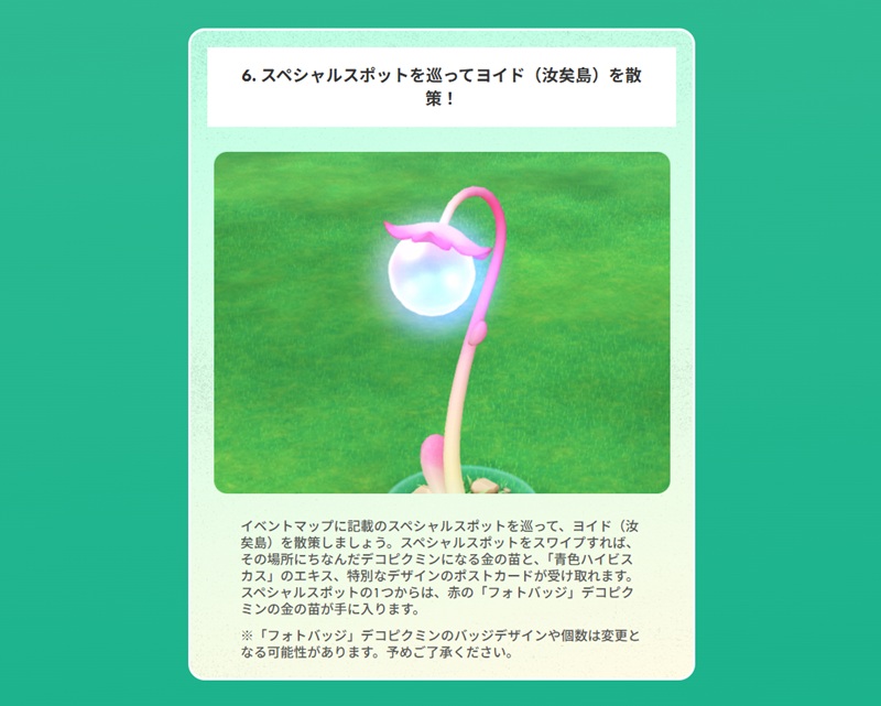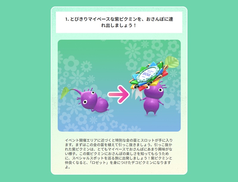 従来のイベントと同じく、バッジやデコピクミンが身につけるロゼットなどに刻まれる文字に違いがあるのが大きな特徴だ。