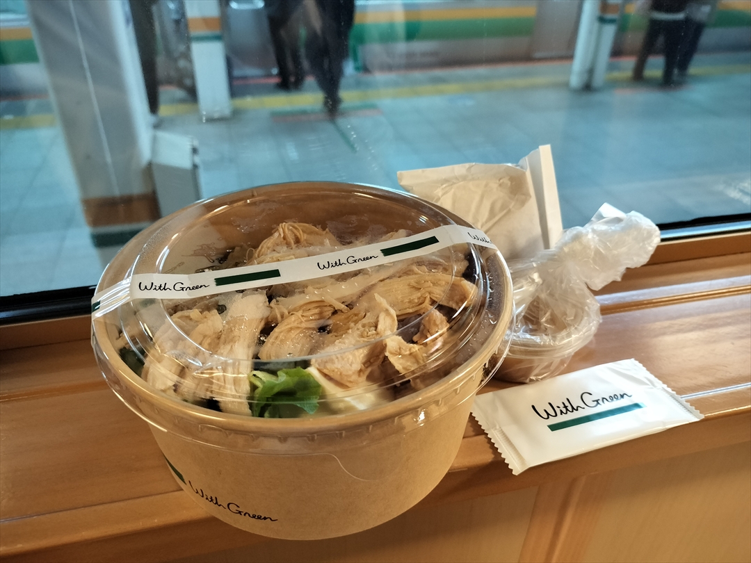 車内でドレッシングをかけてフリフリして開封する。通常はフォークで食べるが、おつまみならば箸でつまむのが良い。チキンは当然としても、他のサラダの具材も非常によく合うのだ。サラダならばにおいはしないので、新幹線で食べながら飲んでもまったく問題ないし、むしろサラダでお酒を飲んでいる人などいないので注目されるかもしれない。とにもかくにも、旅先で同店があれば、列車内でのお弁当代わりにあるいはおつまみ代わりに検討しても良いのかもしれない。