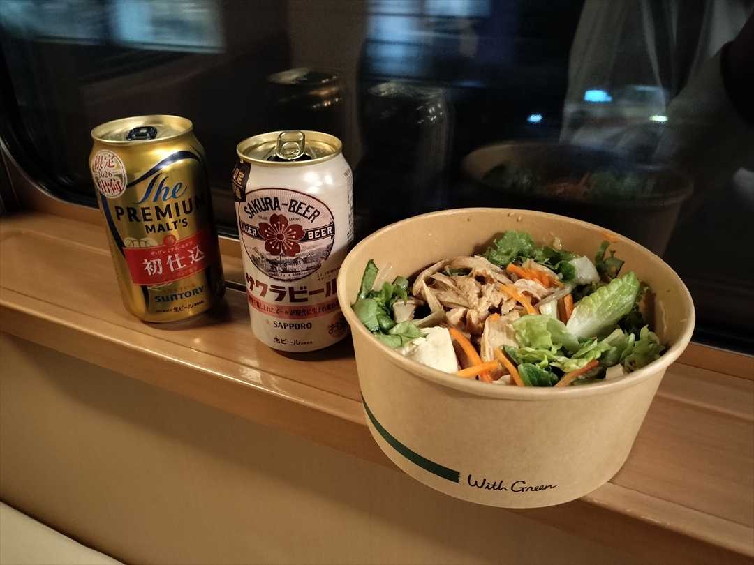 記者は臨時運転士としてバスの運転もしていて、この日はたまたま乗務日だったので勤務終了後に営業所から田町駅まで歩いて行き、スーパーで缶ビールを2本購入してから東京駅に向かった。これだけあれば22時近くに発車するので寝るまでに十分な量だろう。サラダはもともと入っていたチキンにさらにチキンを追加トッピングして、チキンダブルにした。