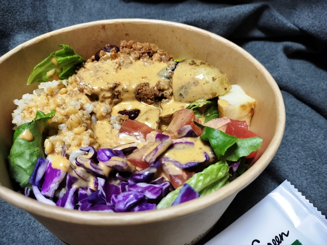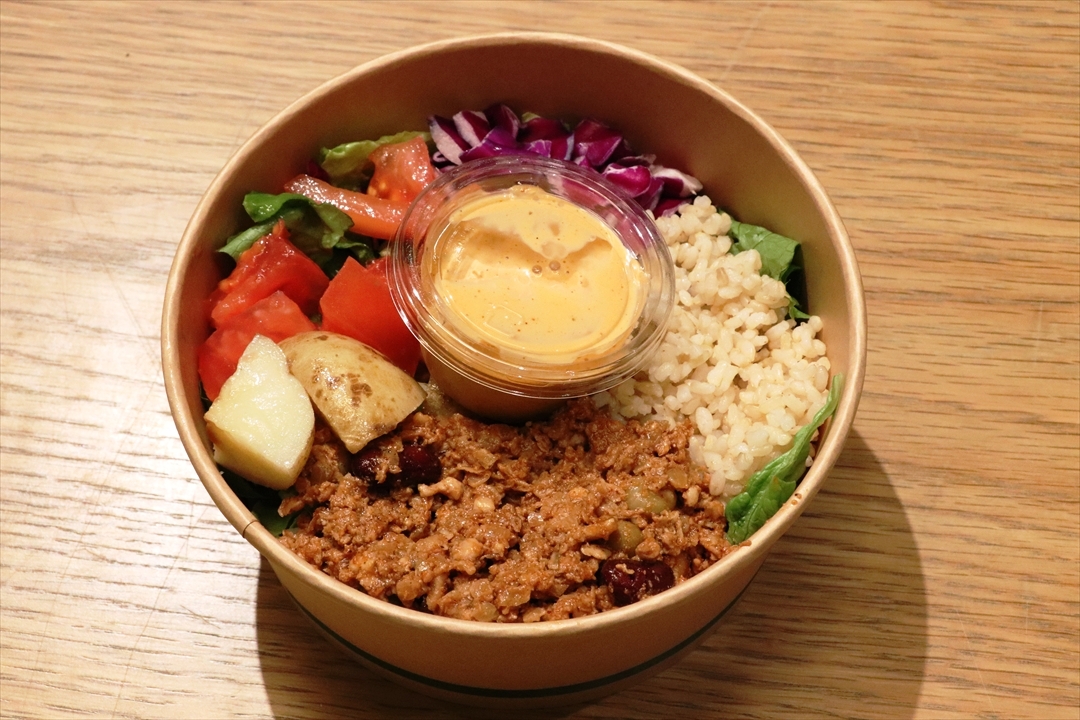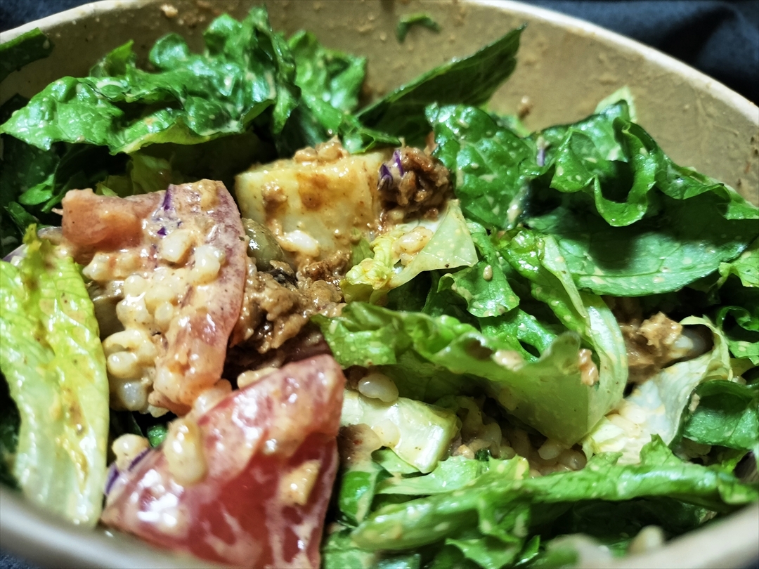ドレッシングをかけて一度ふたを閉じてフリフリしいてまぜる。香りからしてメキシカン意外に考えられないくらいにわかりやすい。新じゃがは味に主張があり、決して添え物ではないことがわかる。玄米とチリコンカンの組み合わせはもはやサラダではないのではなかろうかと思わせるが、同社のサラダに「野菜でなければダメ」という定義はない。よって好きなものを加えて美味しく「野菜も」採ろうねという考え方がいいのだ。