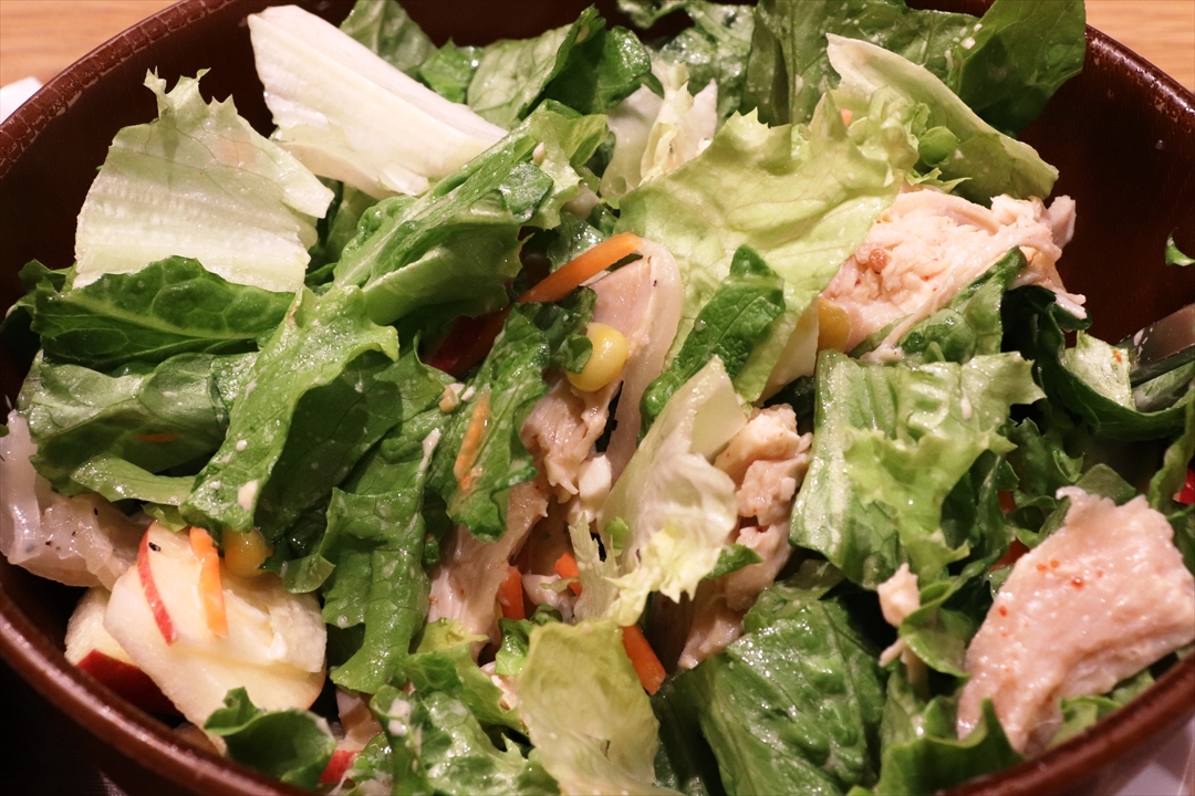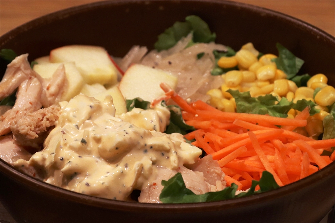 トッピングは、コーン/人参/りんご/オニオンマリネ/チキン南蛮で、おすすめドレッシングは柑橘(かんきつ)だ。ドレッシングは自由に選べるので好みのものを指定すればよいが、特にない場合はおススメで問題ない。きれいに盛り付けてもらい、撮影後に自分で混ぜても構わないし、スタッフに混ぜてもらうことも可能だ。記者は撮影のためにデフォルトの盛り付けをしてもらった。