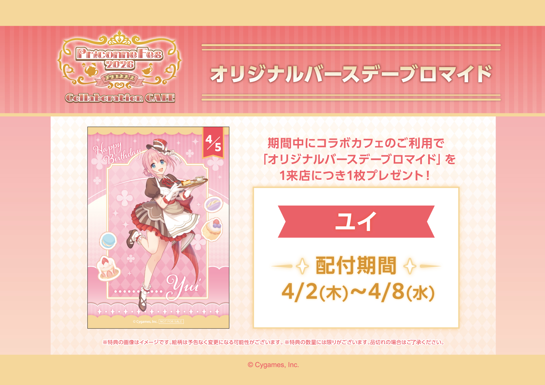 さらに、期間限定で「オリジナルバースデーブロマイド」も配布。4月2日(木)~4月8日(水)はユイ(4月5日が誕生日)、4月23日(木)~4月29日(水)はリリ(4月29日が誕生日)のブロマイドが、コラボカフェ利用時に1来店につき1枚もらえる。