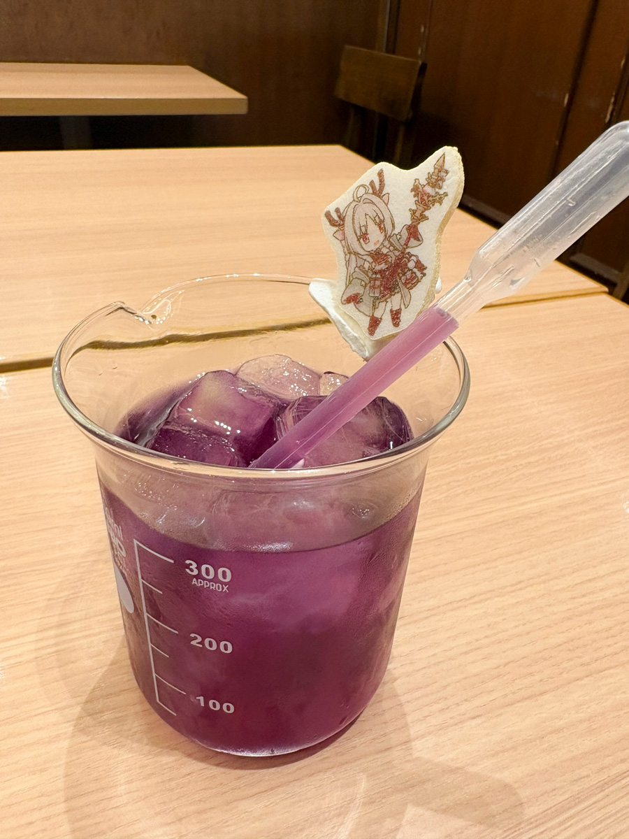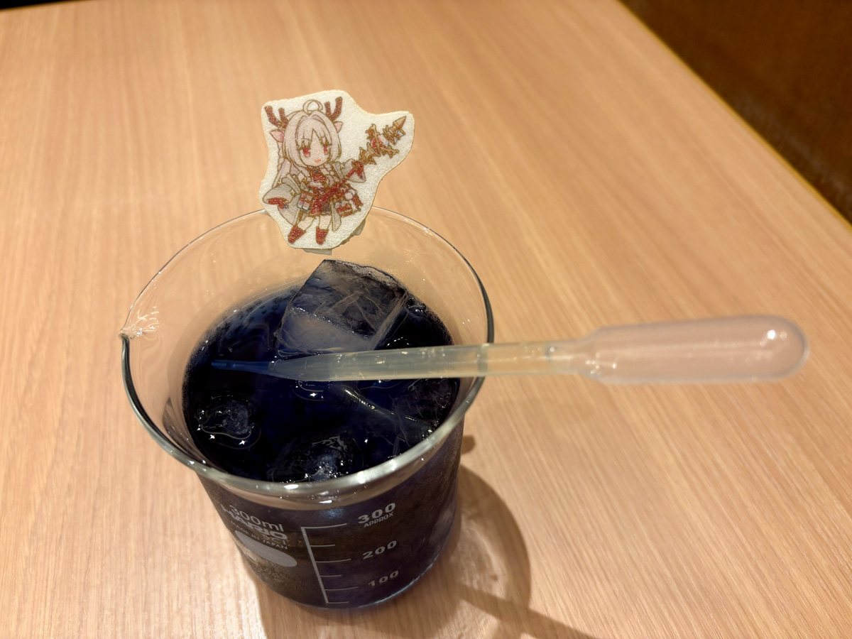 ドリンクの「【アルケス錬金堂】天才錬金術師の『基創錬成』ハーブティー」は、バタフライピーティーとレモン果汁がメインのドリンクだ。そのまま飲むとやさしい甘さとすっきりした後味が楽しめる。個人的にはシロップを入れるのもオススメ。