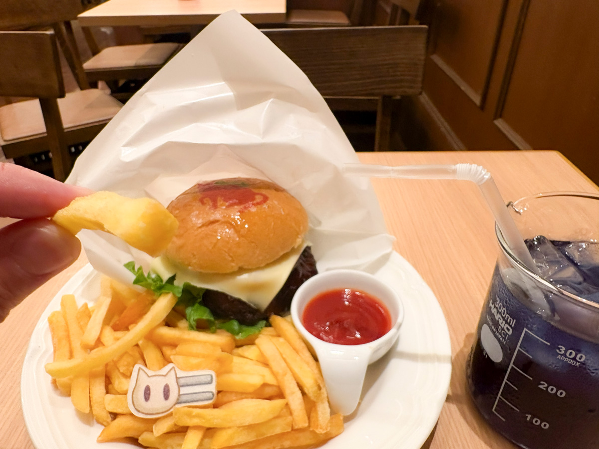 今回、筆者が試食したのは「あむあむ!ンま~い♪キャルのお気に入りハンバーガー」と「【アルケス錬金堂】天才錬金術師の『基創錬成』ハーブティー」の2品。