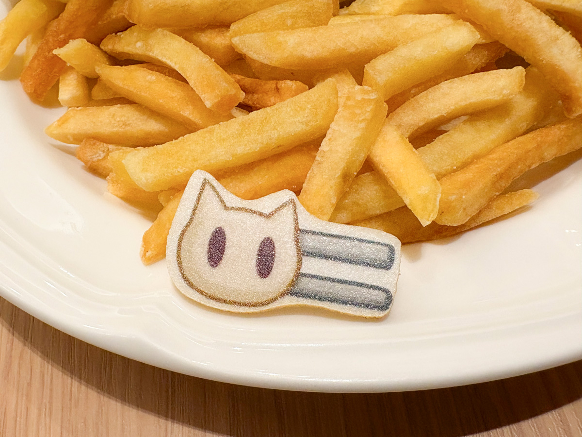 さらに驚いたのがポテトの量。なんだかイメージ写真より多い気がする。ポテトの上には、現実世界のキャルが使用している髪留めのイラストが描かれた可食シートが添えられており、これがまた可愛い。