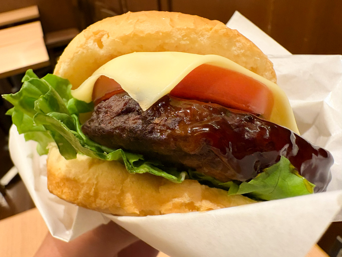 ハンバーガーを持ったとき、まずズシッとした重さに驚いた。それもそのハズ、甘じょっぱいジューシーなパティがとにかくでかい。そしてレタスやトマト、チーズとの相性もバッチリで、かなり食べごたえがあるてりやきチーズバーガーとなっている。そりゃキャルちゃんも喜ぶはずだ。