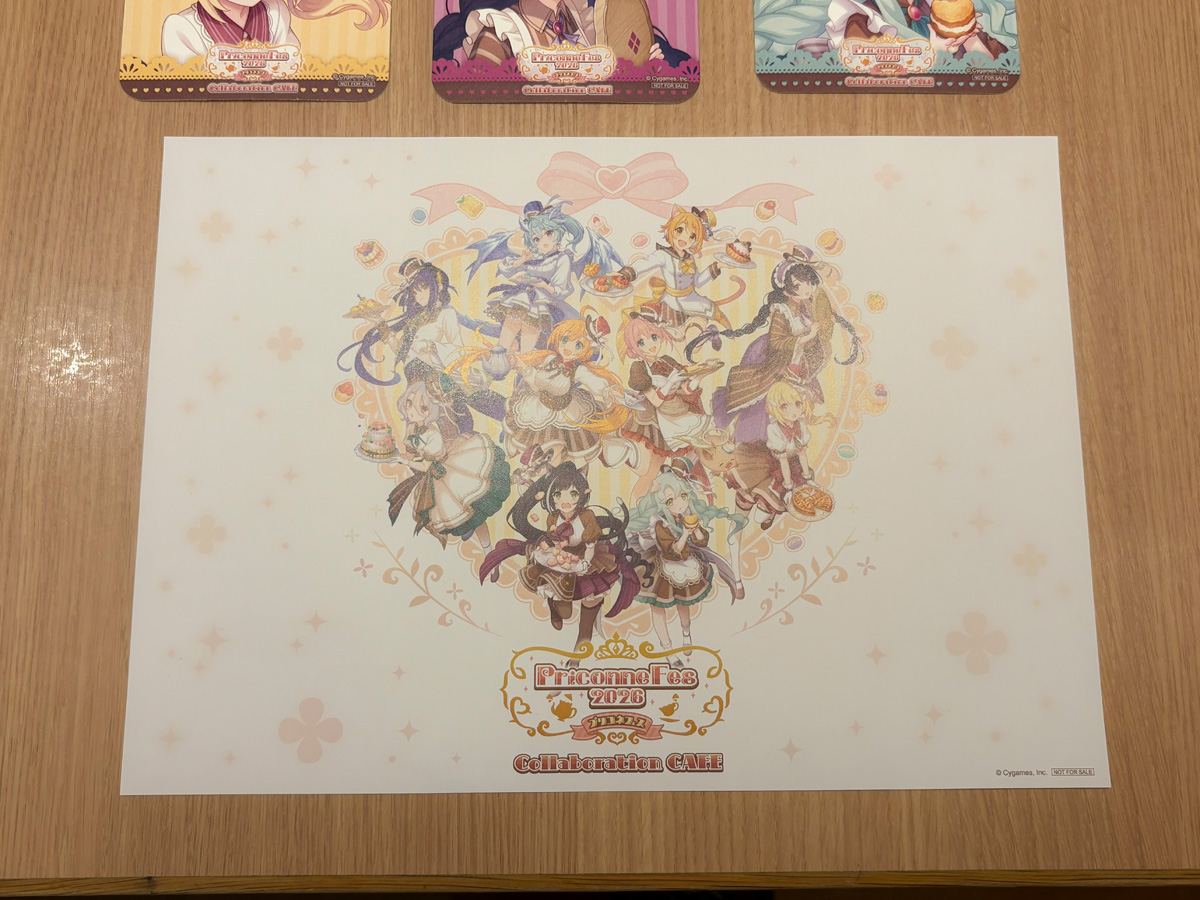 コラボメニューを注文すると、「プリコネフェス2026」のメインビジュアルが描かれたペーパーランチョンマットを1枚もらえる。A4サイズで、一度のご入店につきお一人さま1枚限りとなっている。