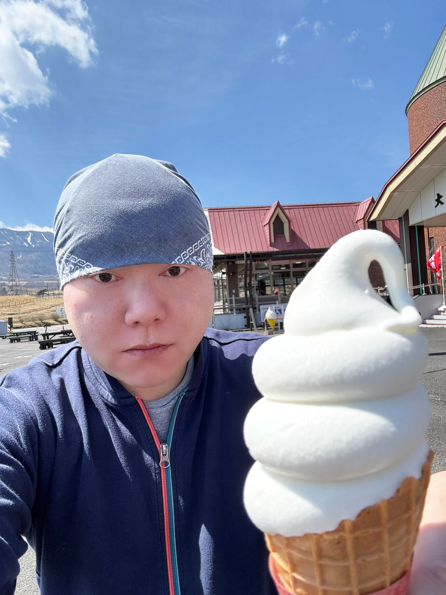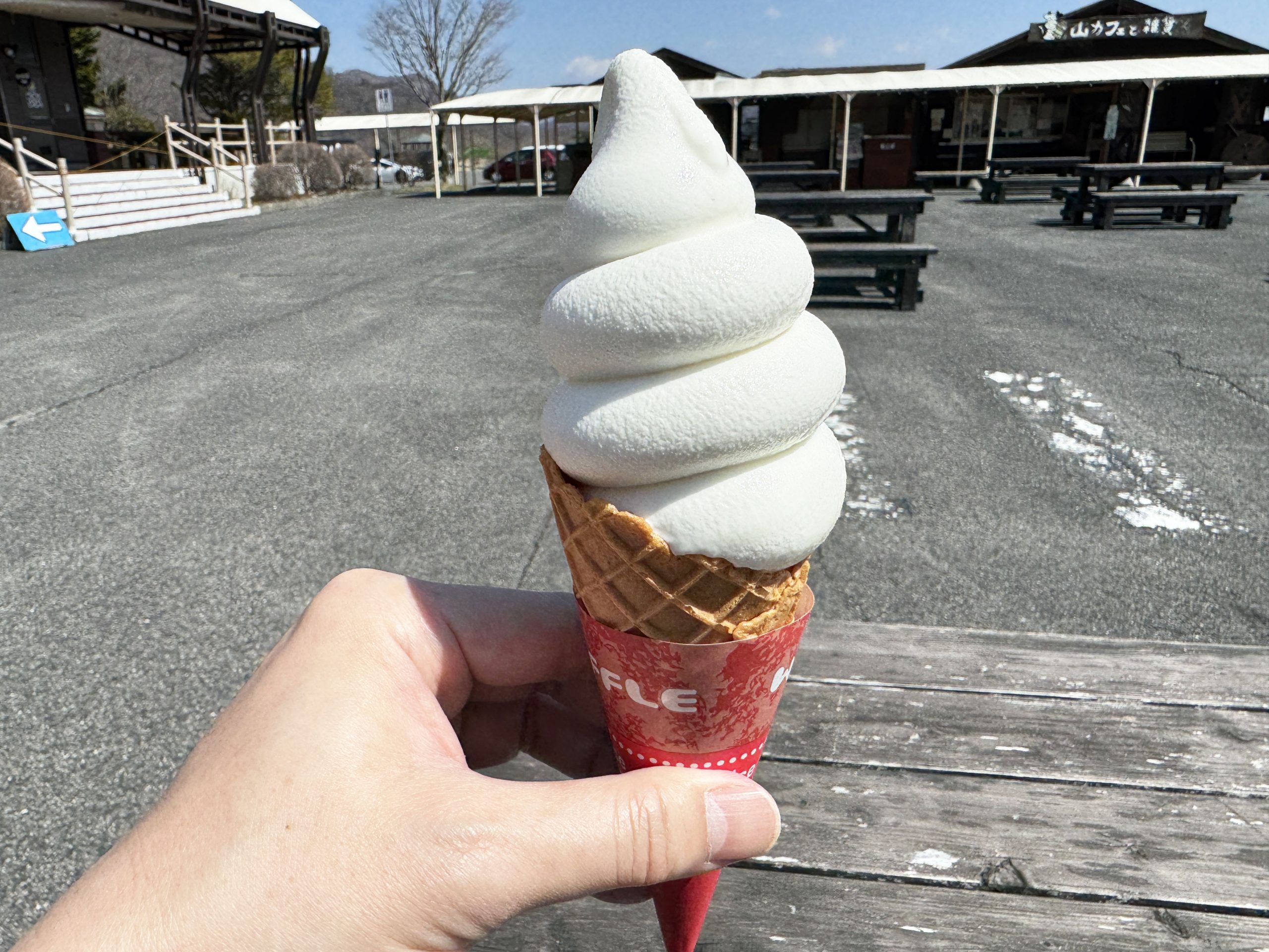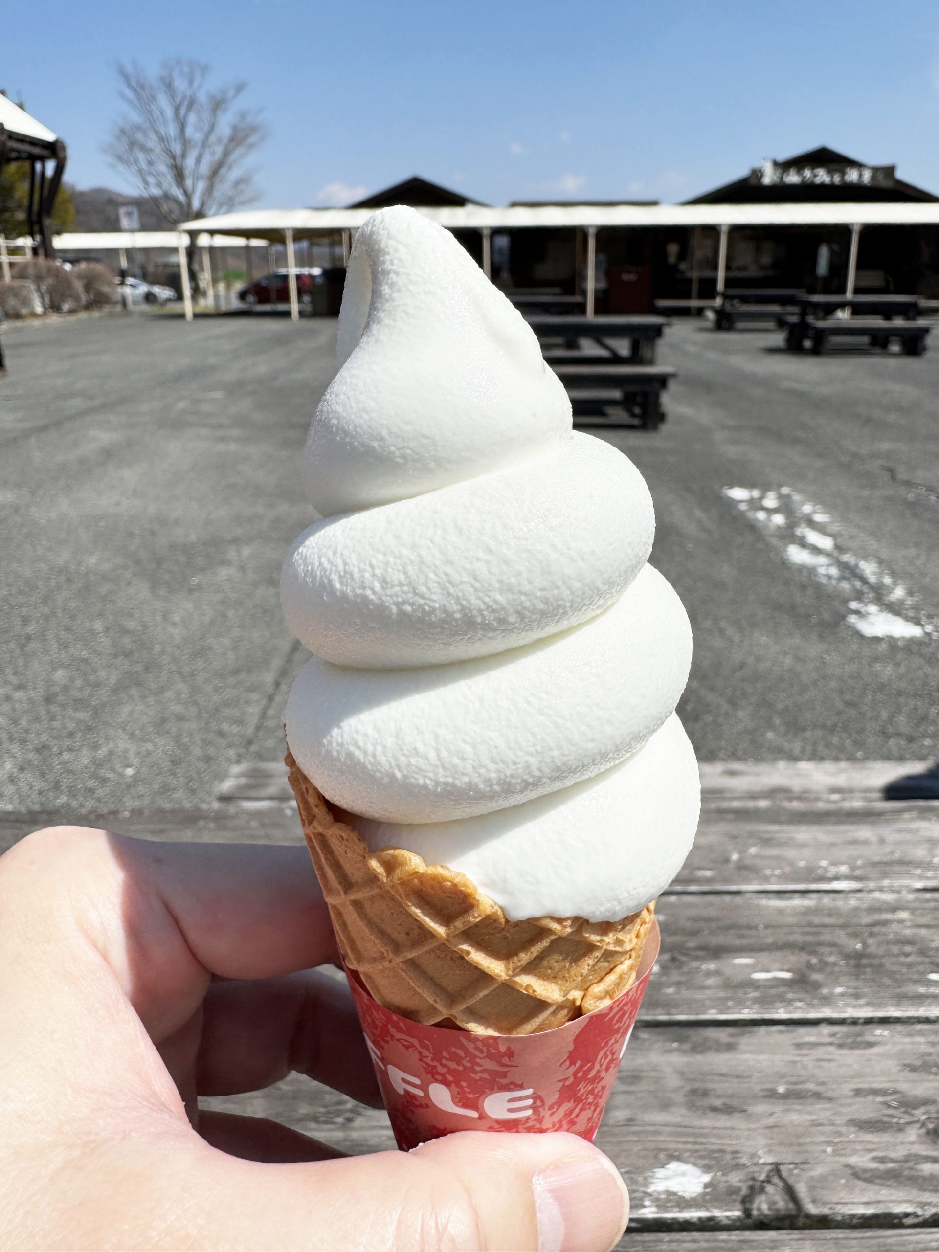 なんかこのソフトクリームのビジュ、かなり、心にグッとくるものがある。ビニールで包装されているソフトクリーム。なんかもう、この、手作り感、たまらない。昭和時代、こういうタイプのソフトクリーム、あった気がするが、皆さんの記憶ではどうだろうか。開封すると、純白のソフトクリームが姿を現す。やばい、この、濃厚濃密感。食べる前から、約束されたおいしさを感じる。事実、うまい、うますぎる。