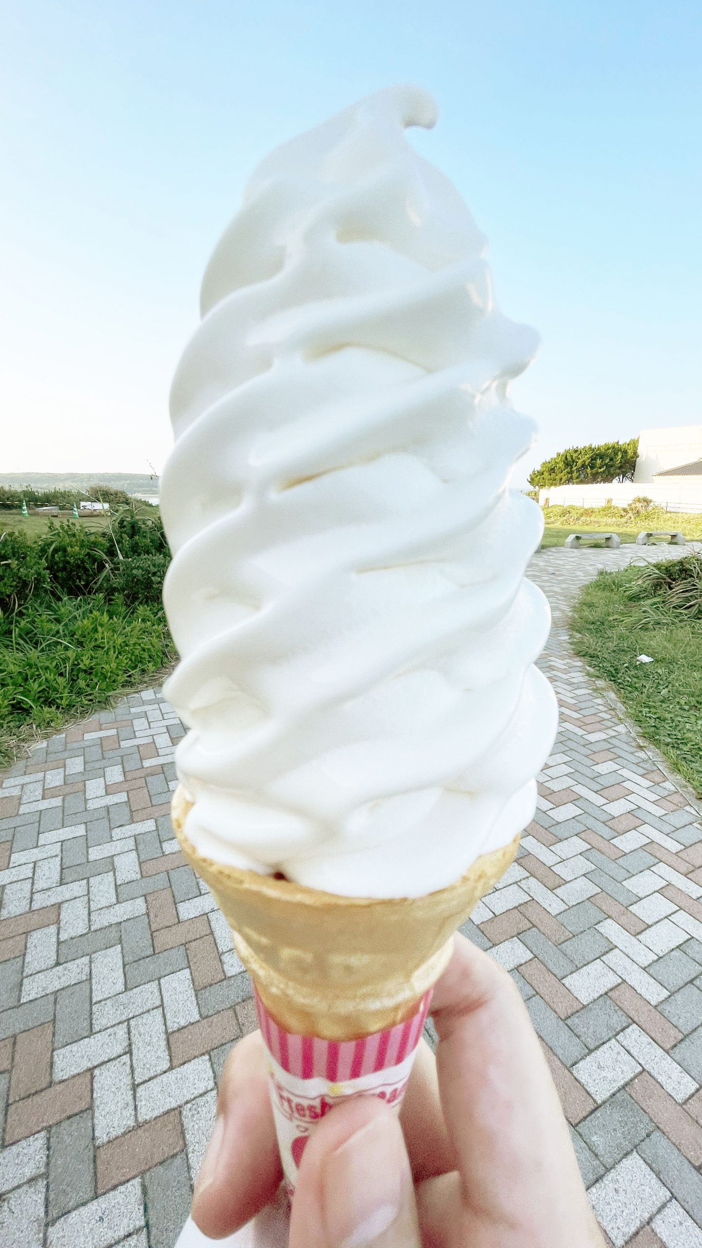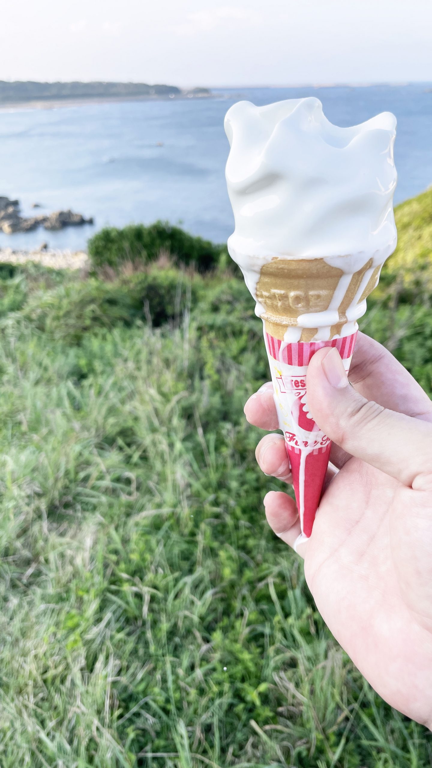 店内で食べることもできるが、犬吠岬の海を眺めながら食べるのもステキである。最近のソフトクリームは溶けるスピードが遅いものが多いが、ここのソフトクリームは徹底的にとけるスピードが速く、そういう意味でも昭和的な昔懐かしいタイプのソフトクリームといえよう。