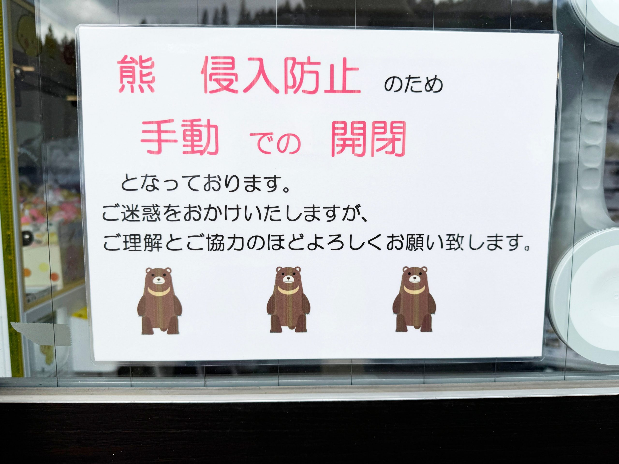 余談ですが、秋田県の一部の松屋では、熊侵入防止の注意書きが貼られています。
