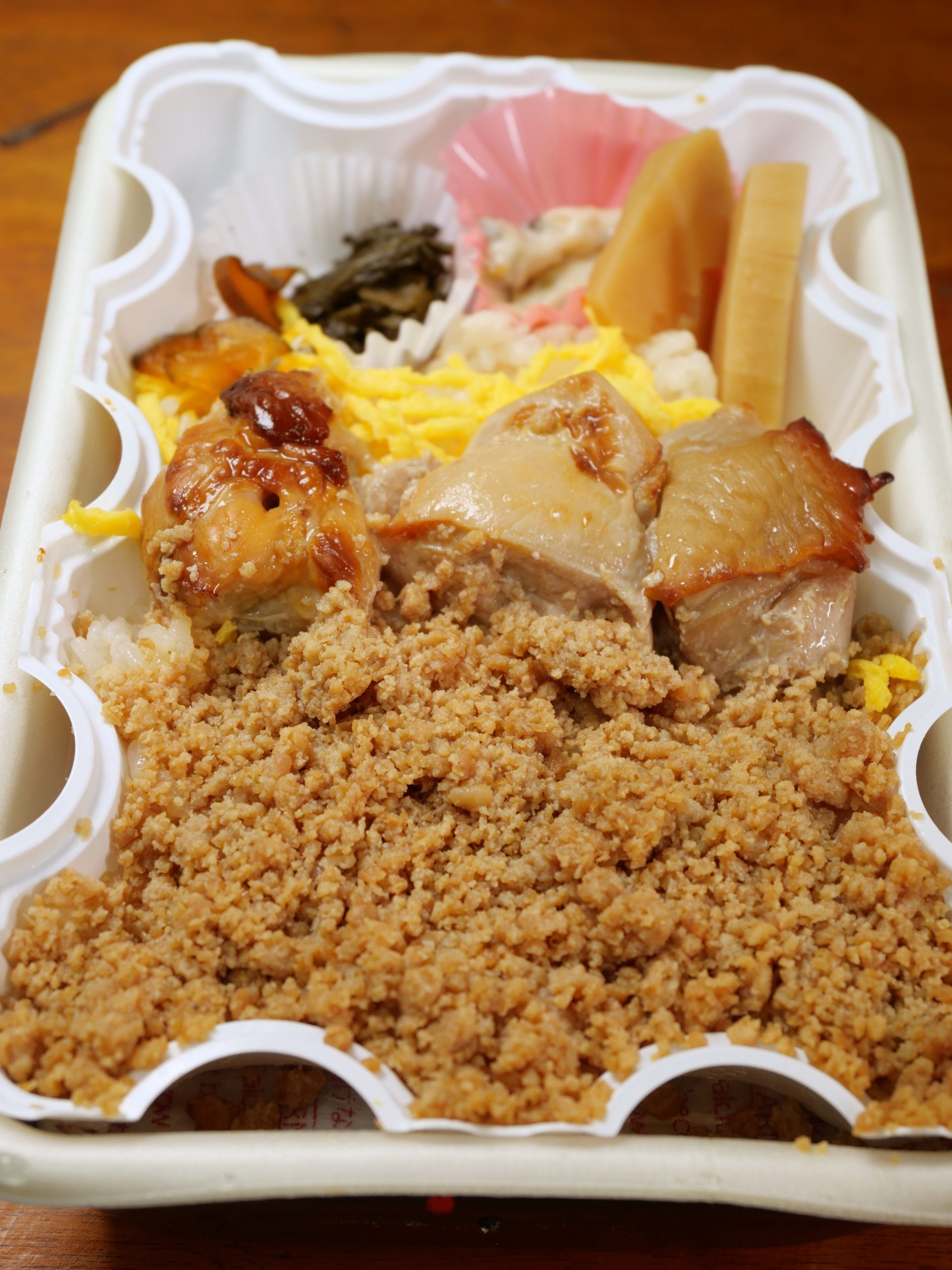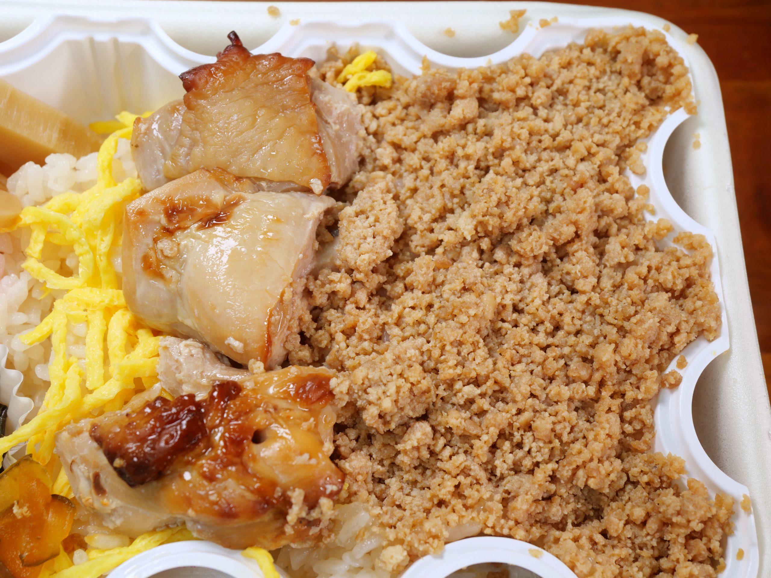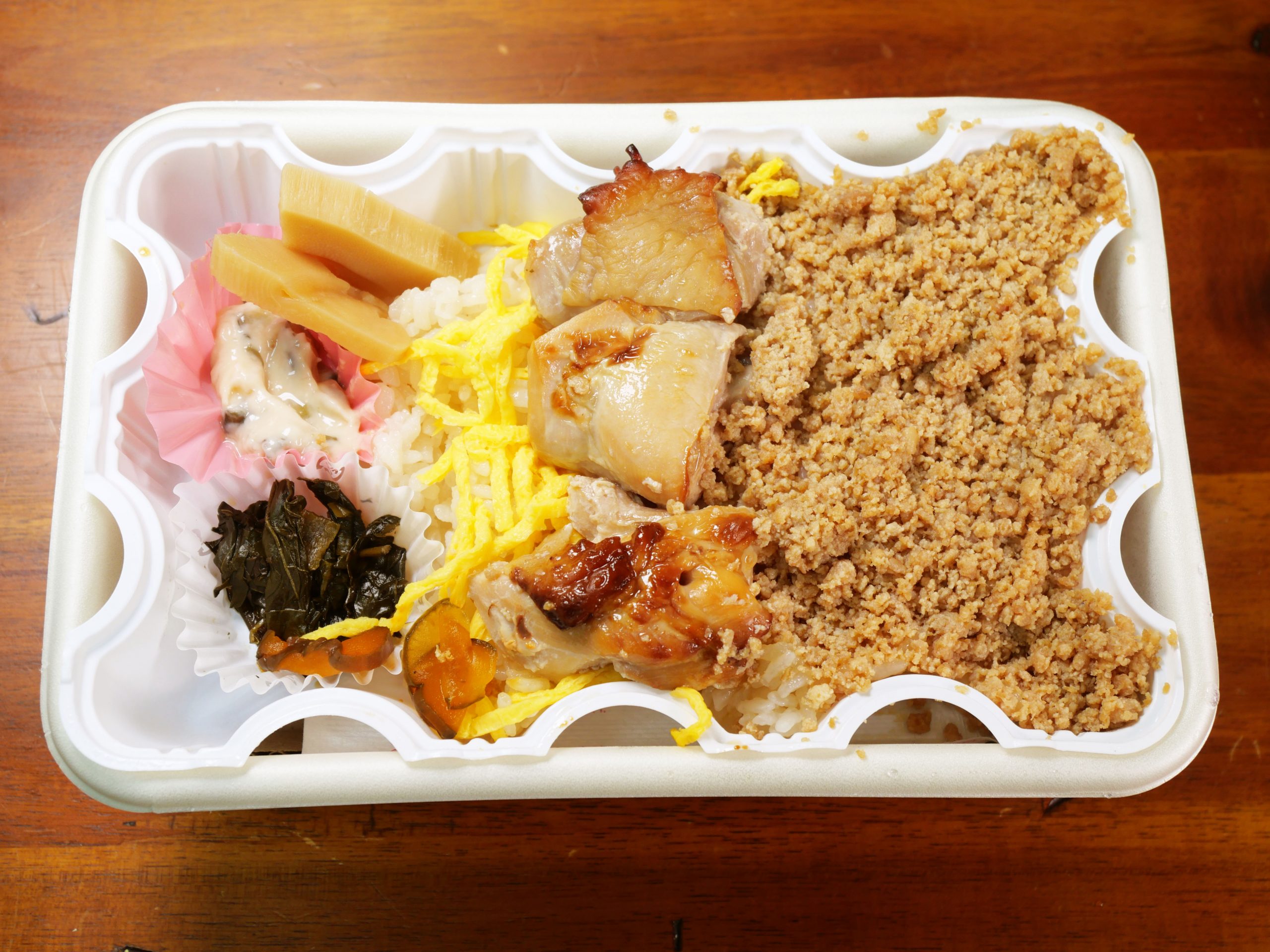 ぎっしりと敷き詰められた鶏そぼろから薫りが一気に立ち上る。