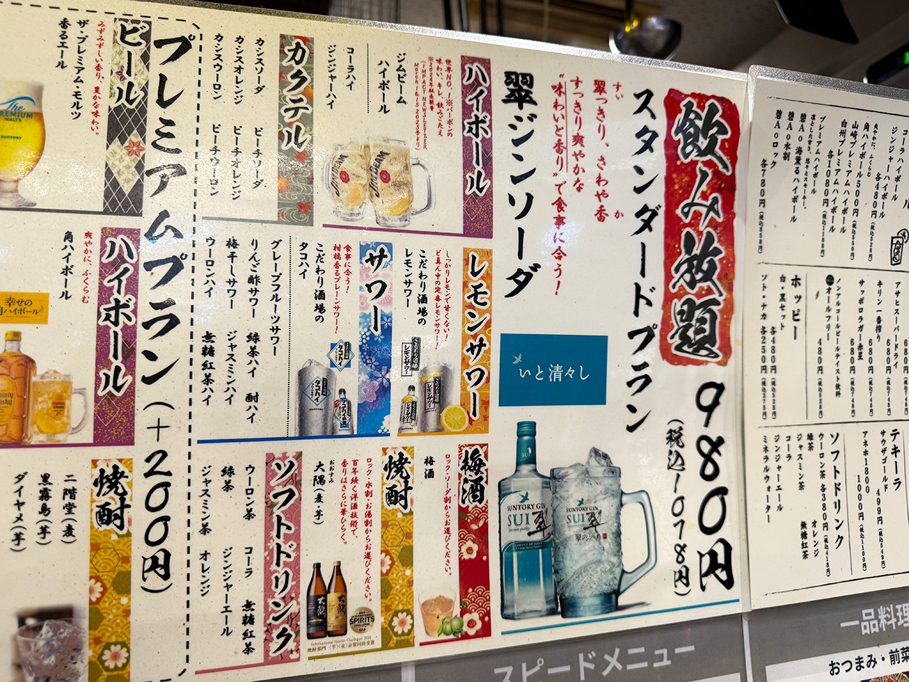 そしてアルコールは980円でスタンダードプランが飲み放題。生ビールが飲めるプレミアムプランだとプラス200円になります。