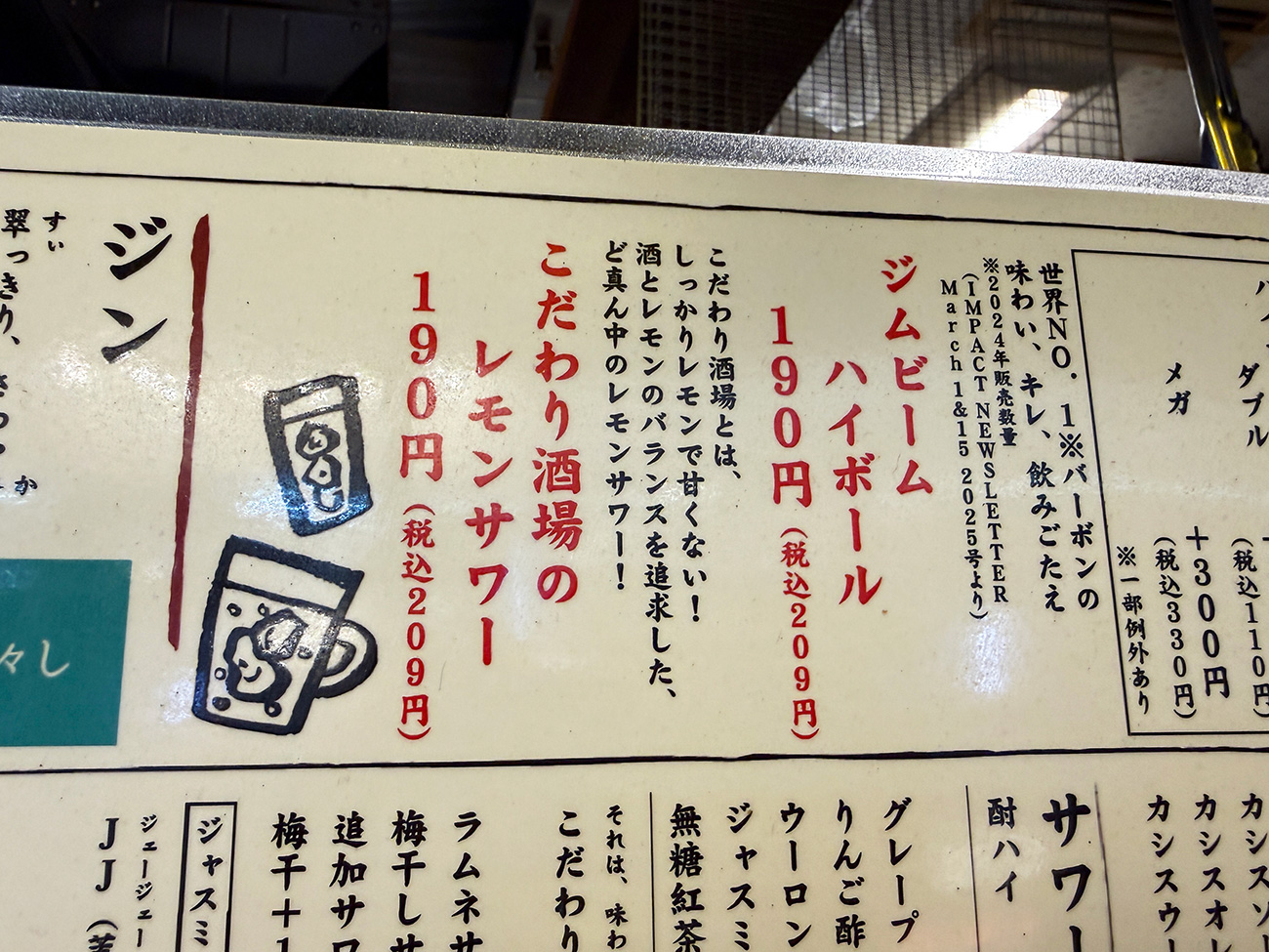 メニューをよく見ると、レモンサワーとジムビームハイボールはなんと単品190円!
