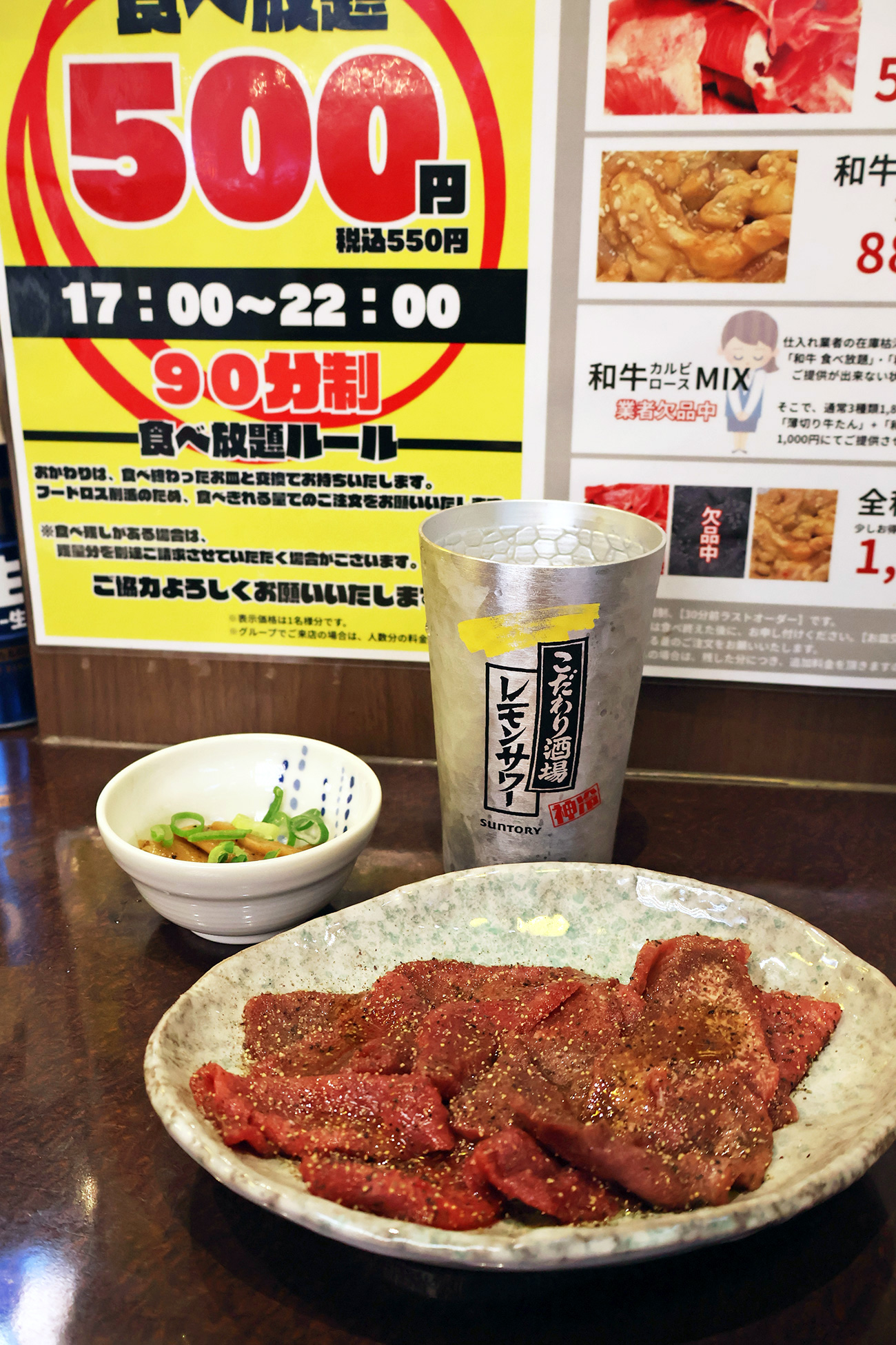 ひとまずこの日はベーシックなプランを楽しんでみたかったので、フードは牛タン食べ放題500円から始めてみることにしました。ちなみに牛タン食べ放題は毎日開催ですが時間は90分制、17時から22時までの開催となっているようです。