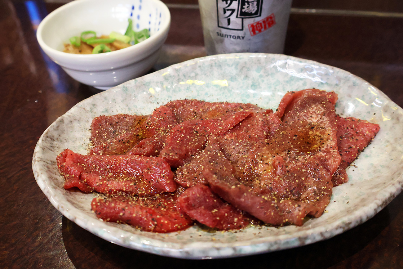 ひとまず飲み放題のレモンサワーを注文し、お通しのメンマをつまみにチビチビとスタート。すると、ついに食べ放題の牛タンも運ばれてきました。