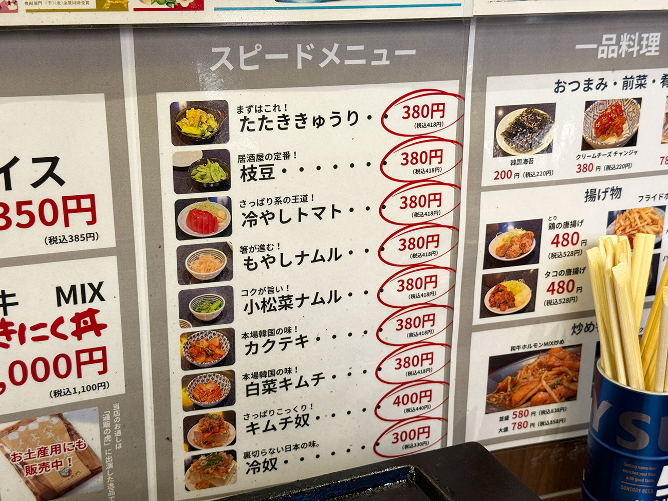 ここでサイドメニューをチェックしてみると、無難なおつまみが300円〜400円でいろいろ用意されていました。牛タン食べ放題500円と比べるとさすがに割高! 別にそのへんの居酒屋と同じくらいの価格帯なのに。