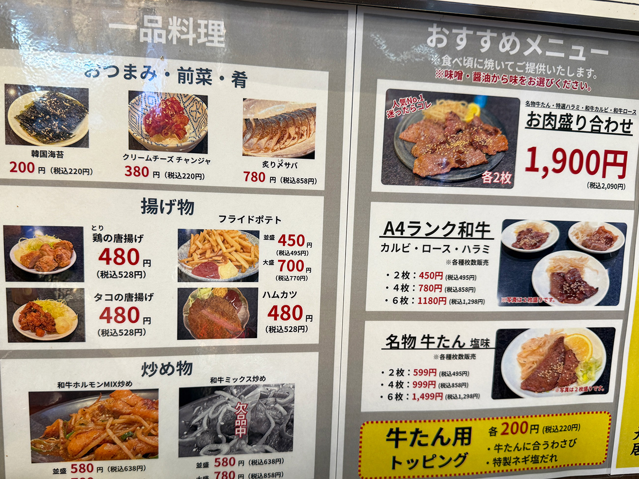 ほかにもA4ランクの和牛などの単品メニューもあり、追加メニューで利益を上げていくスタイルなんだろうと解釈しました。いいと思います。利益を上げないと店は潰れちゃいますから。