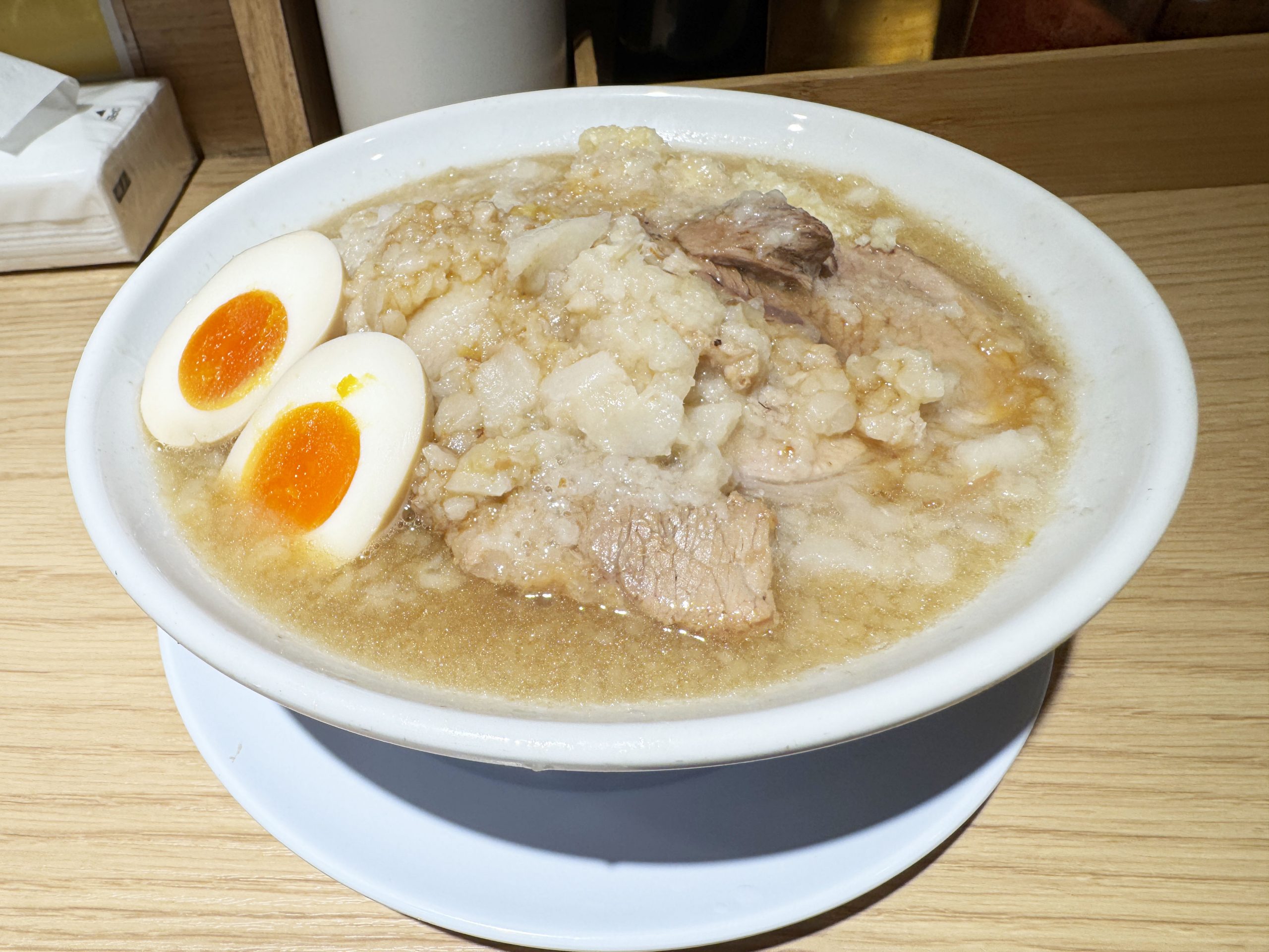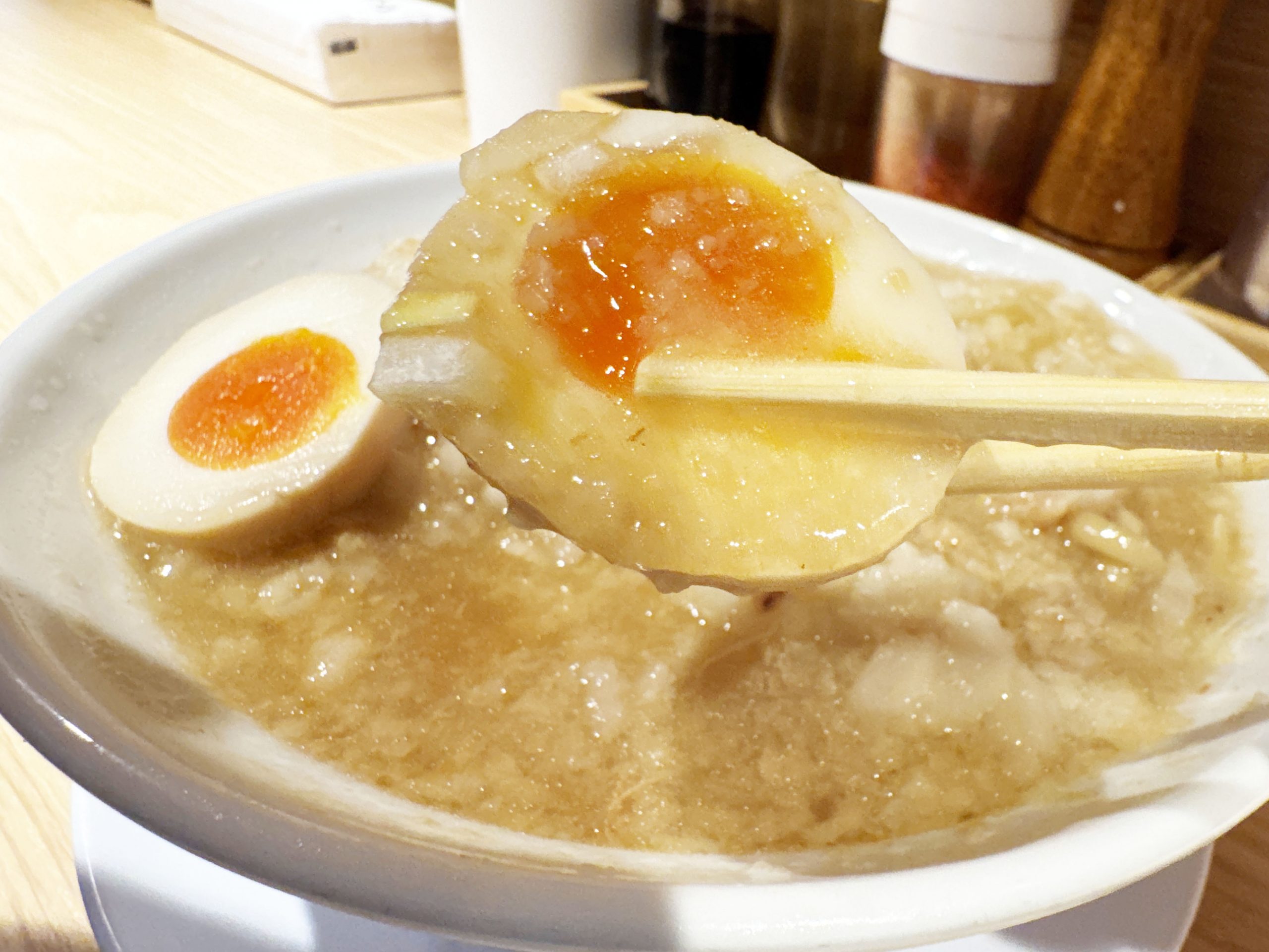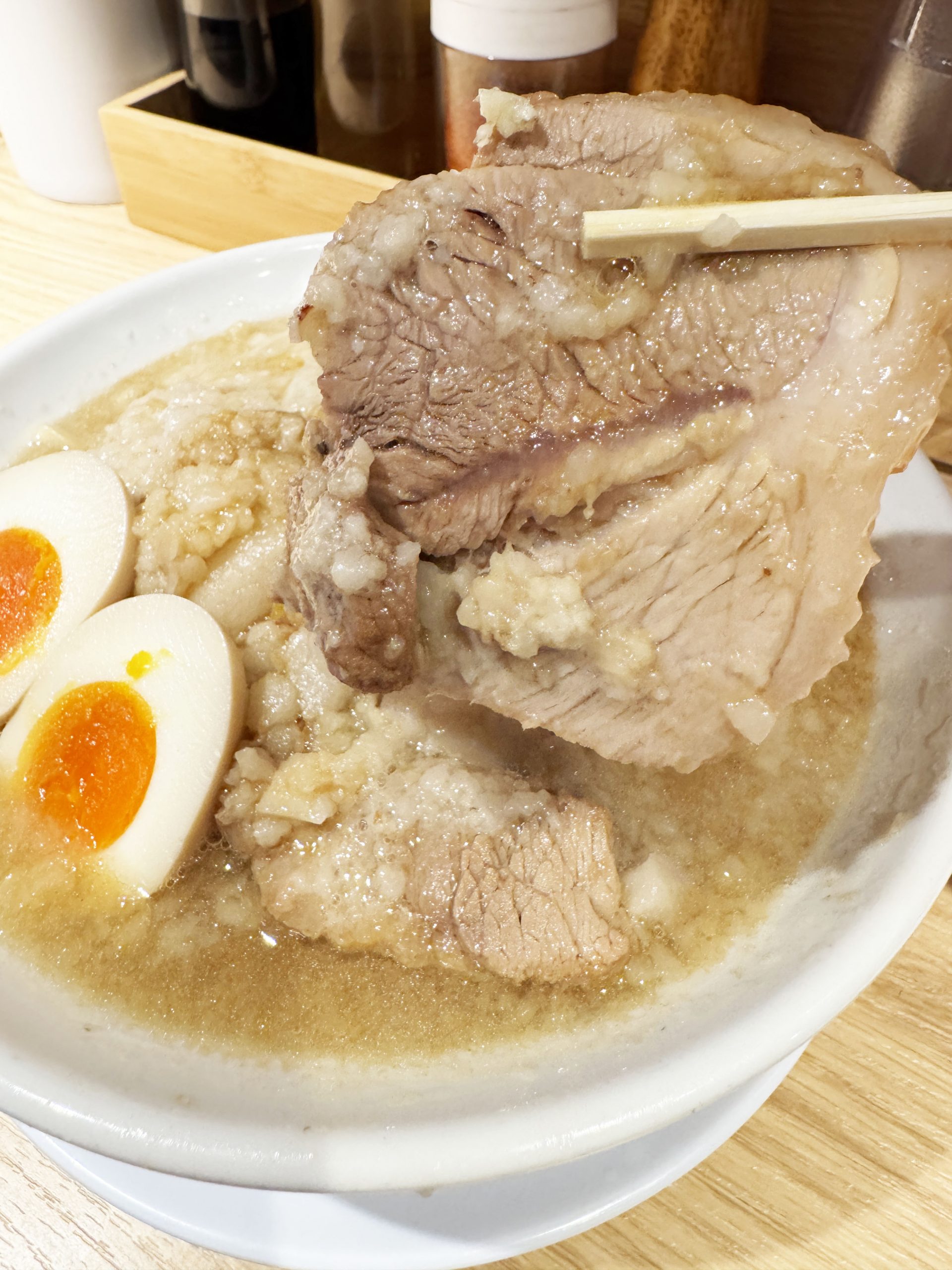 ですが「ラーメン+ヤサイ抜き+アブラマシ+ニンニクマシ+味玉子」を強く推す理由はほかにあります。味玉子です。大量のアブラと濃いスープに味玉子を浸して、断面の黄身に徹底的にしみ込ませるのです。スープに沈め数分待つくらいしても良いです。それくらいガッツリと油とスープを染み込ませた味玉子は神域レベルの存在となります。うまい、うますぎる!