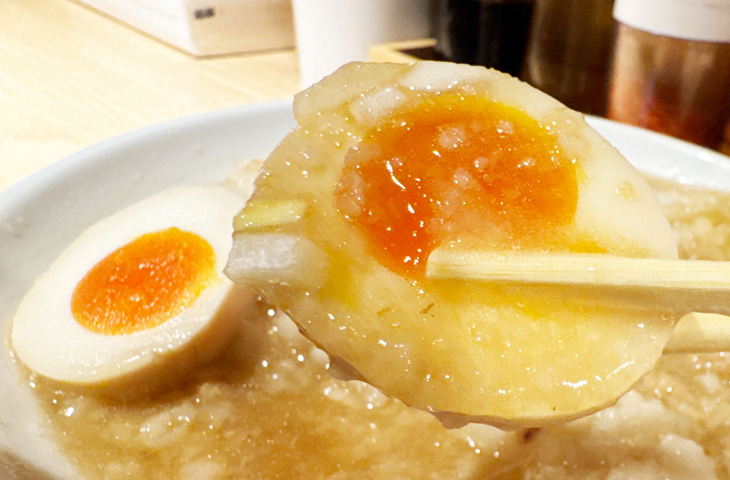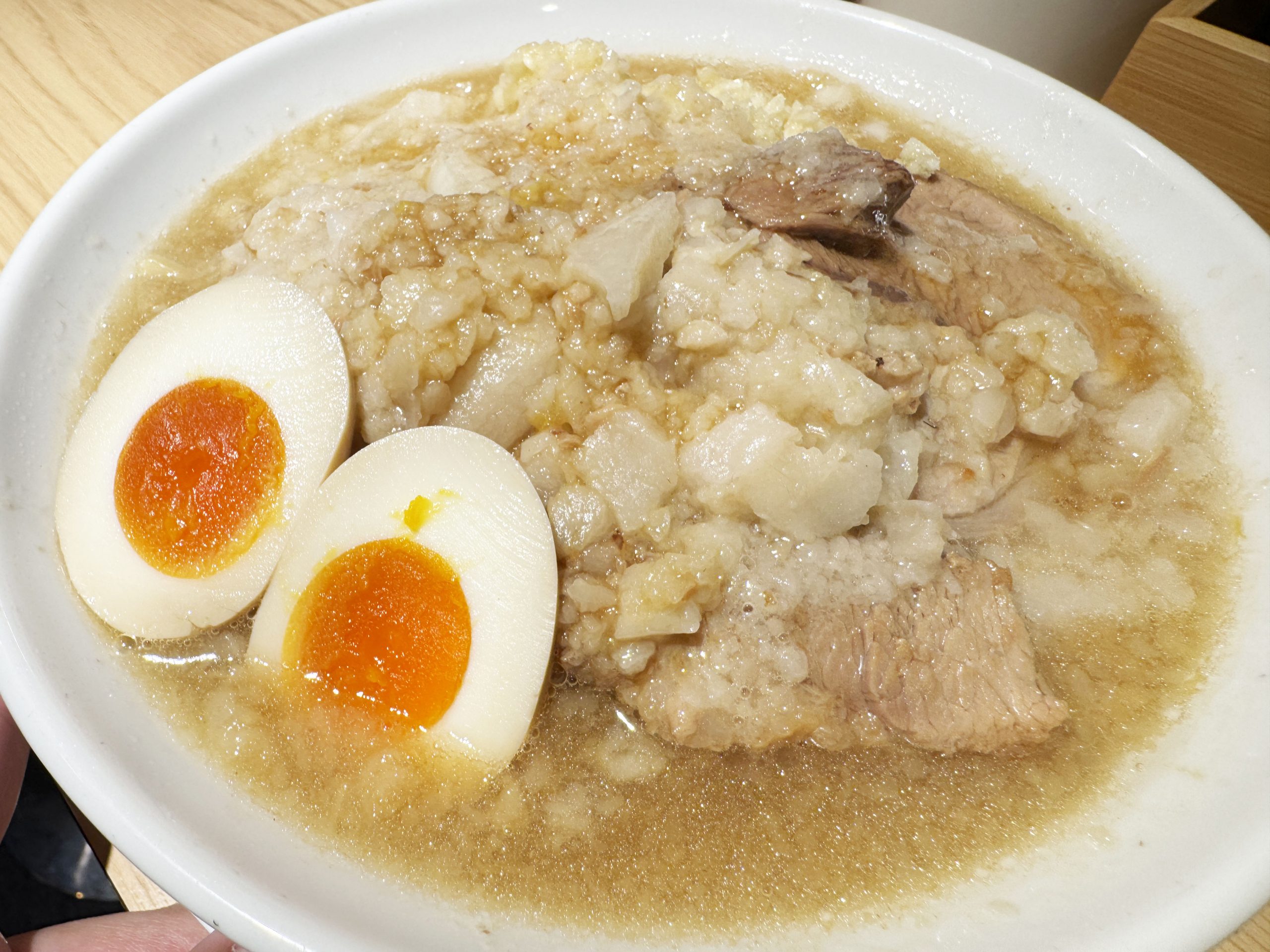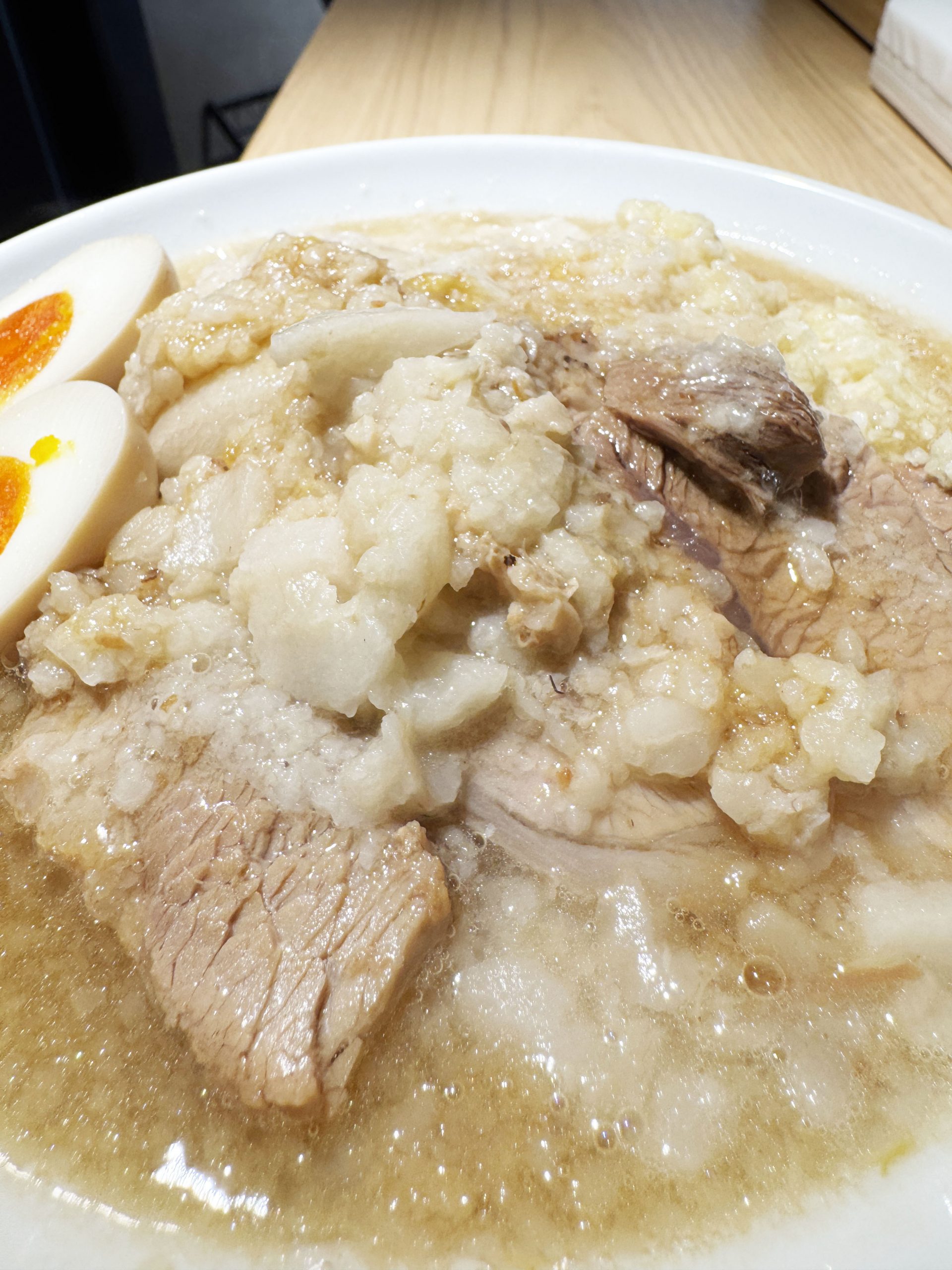 ですが「ラーメン+ヤサイ抜き+アブラマシ+ニンニクマシ+味玉子」を強く推す理由はほかにあります。味玉子です。大量のアブラと濃いスープに味玉子を浸して、断面の黄身に徹底的にしみ込ませるのです。スープに沈め数分待つくらいしても良いです。それくらいガッツリと油とスープを染み込ませた味玉子は神域レベルの存在となります。うまい、うますぎる!
