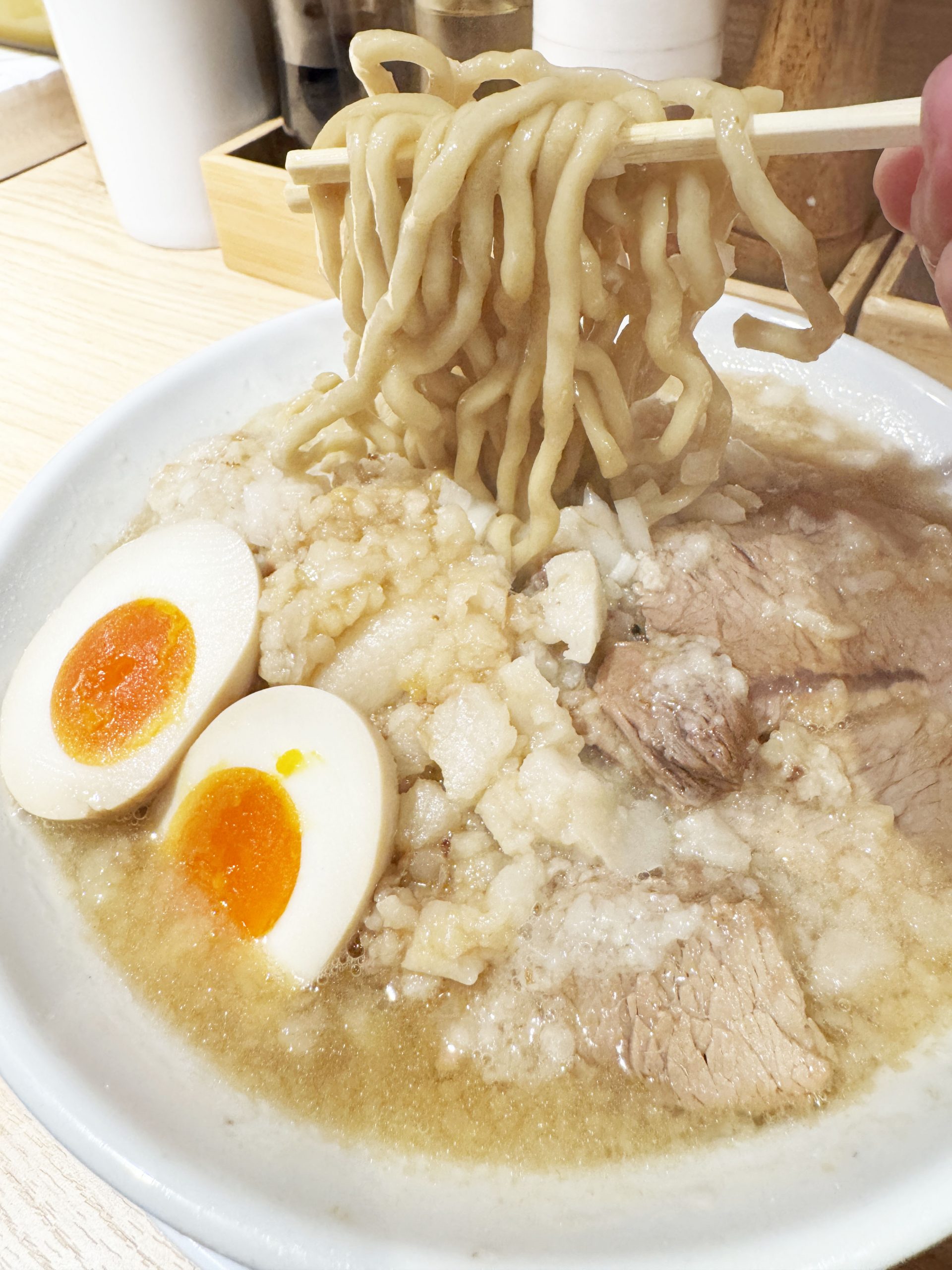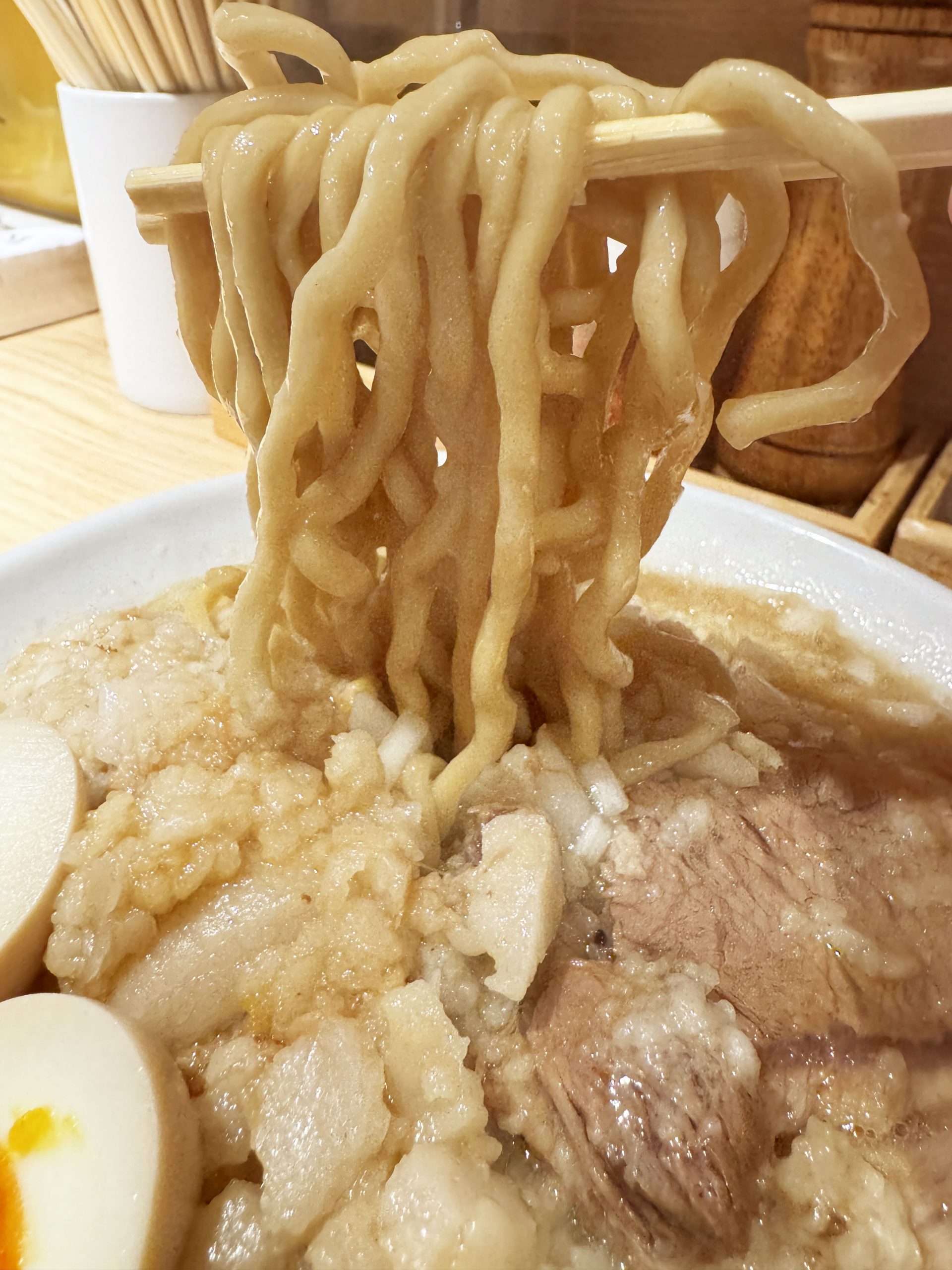 初めて行く人は好きなように食べても良いと思うのですが、何度か行って慣れてきたら「ラーメン+ヤサイ抜き+アブラマシ+ニンニクマシ+味玉子」を強く推奨しますよ。麺のおいしさをダイレクトに感じられるだけでなく、超絶すばらしいご褒美が待っているからです。