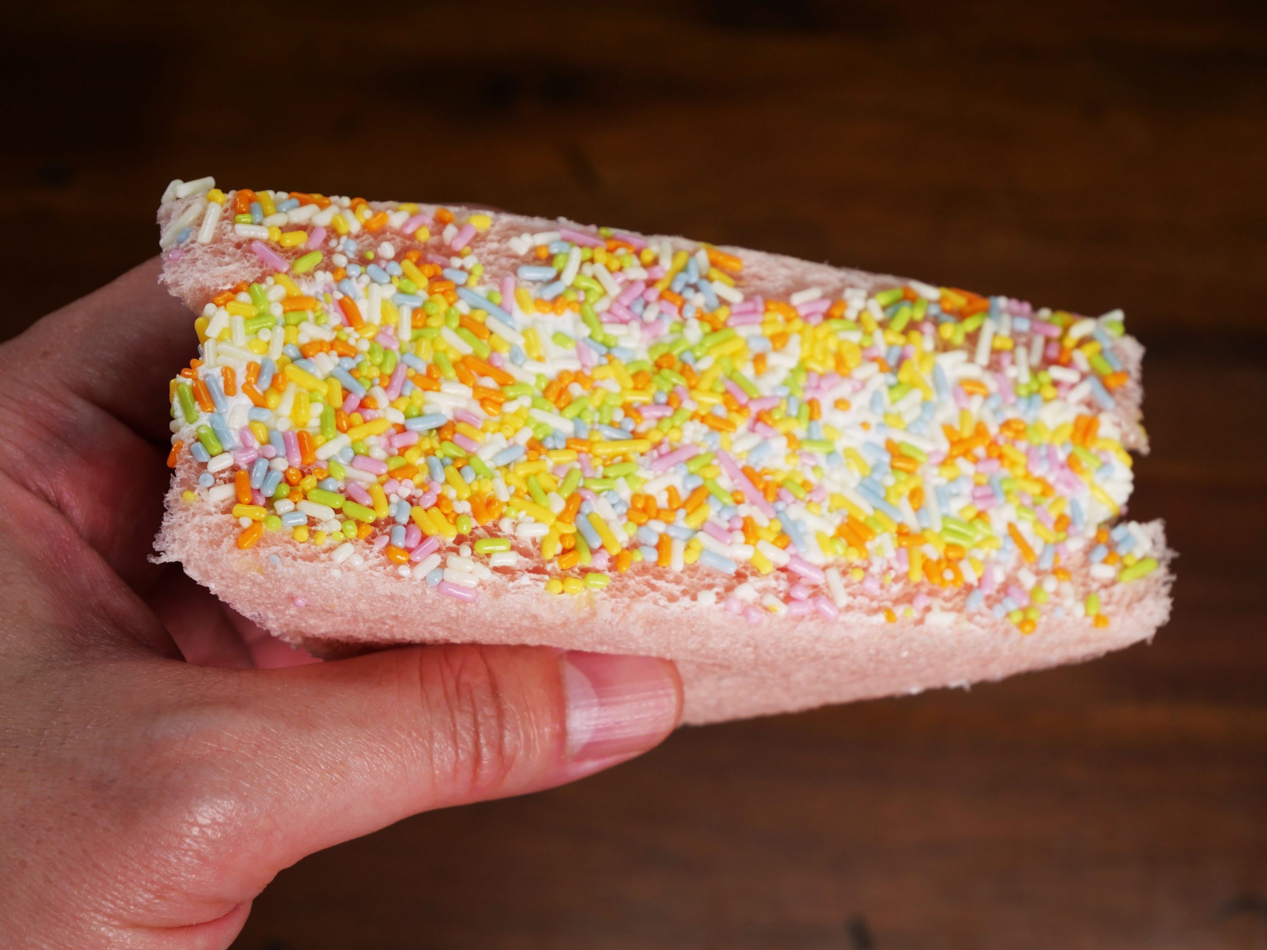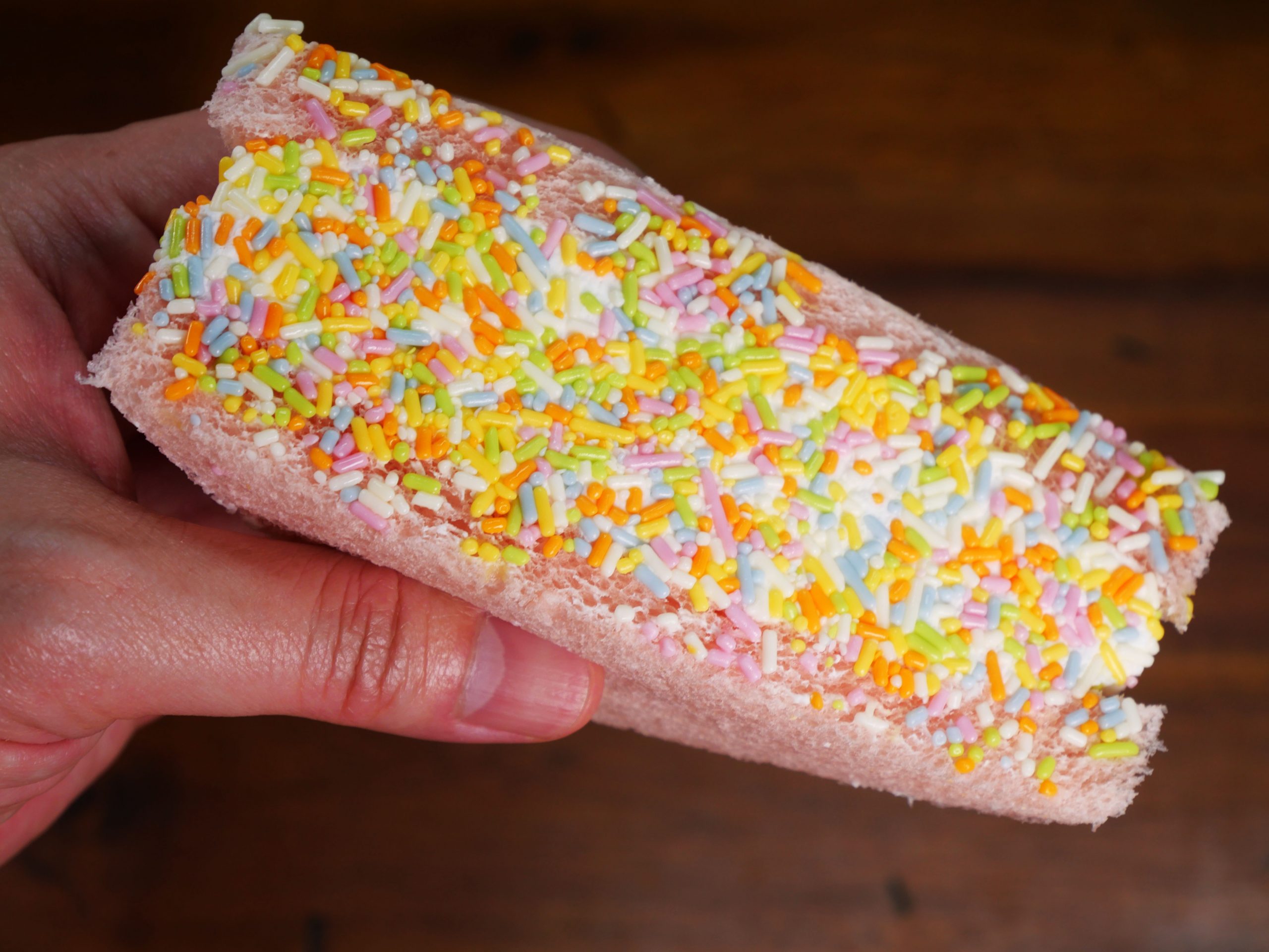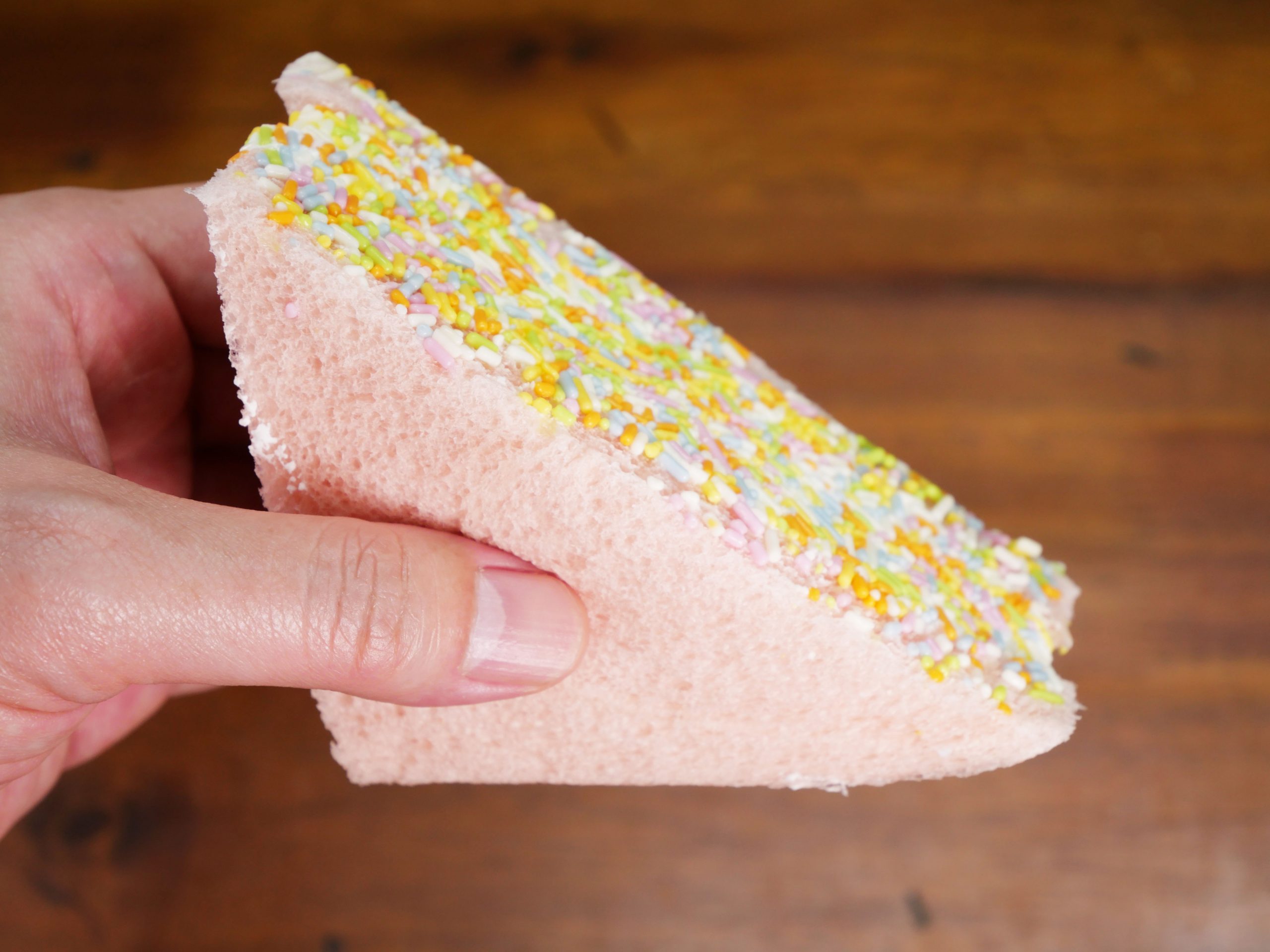 食パンのミミをカット。4枚の三角形パンにしてから、たっぷりとホイップクリームをサンド。徹底して大量のホイップクリームをサンド。あまりにも大量すぎて、裏側から見てもホイップクリームだらけ。これはもうクリーム好きにとってご褒美。そこにたっぷりとカラーチョコがふりかけられている。